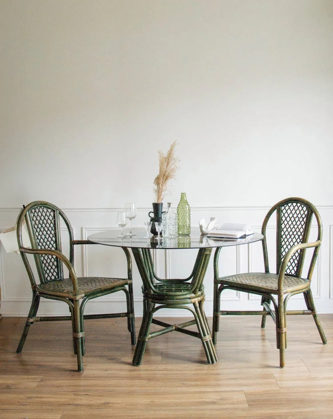 Apportez une touche d'élégance à votre salle à manger avec cette magnifique table à manger en rotin vert. Dotée d'un plateau rond en verre fumé, elle accueille confortablement jusqu'à 4 convives, parfaite pour vos repas conviviaux. Associez-la avec le fauteuil de table en rotin vert N°557, modèle Ernest, pour un espace harmonieux et stylé. Son design intemporel et sa finition soignée en font un incontournable pour tous les amateurs de décoration raffinée. Plateau posé sur la structure.