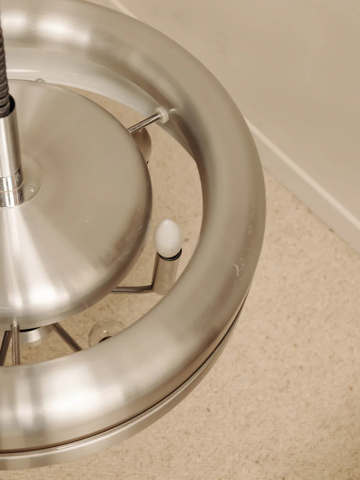 Sublimez votre intérieur avec cette suspension lumineuse chromée au design graphique et contemporain. Sa structure en métal poli capte la lumière et valorise huit points d'éclairage disposés pour une diffusion équilibrée et chaleureuse. Idéale au-dessus d'une table à manger, d'un bar ou d'un îlot, elle installe une ambiance raffinée et sculpturale qui s'accorde aux décors modernes comme aux intérieurs industriels. Ampoules fournies, styles disparates.