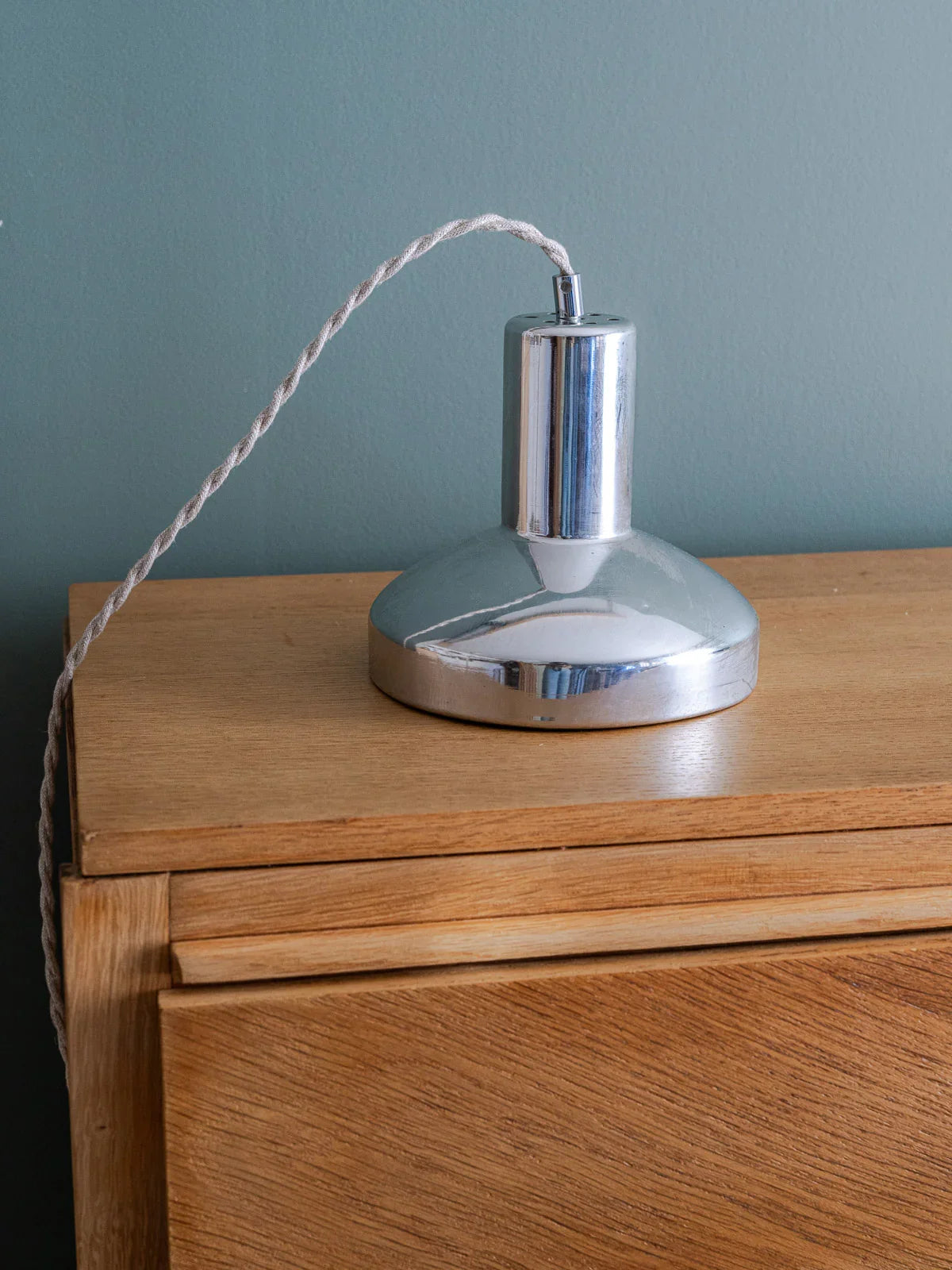 Apportez une touche industrielle raffinée avec cette suspension-baladeuse chromée, où une coupelle ancienne en aluminium dialogue avec un câble torsadé en lin pour une allure douce et structurée. L'électricité a été refaite, offrant une mise en lumière fiable, idéale au-dessus d'un bar, d'un plan de travail ou d'un coin lecture, et plusieurs exemplaires permettent de composer un ensemble harmonieux. Livrée avec son cordon d'un mètre, elle installe une ambiance à la fois chaleureuse et contenue. Quelques traces d'usure et du temps qui participent à son charme.