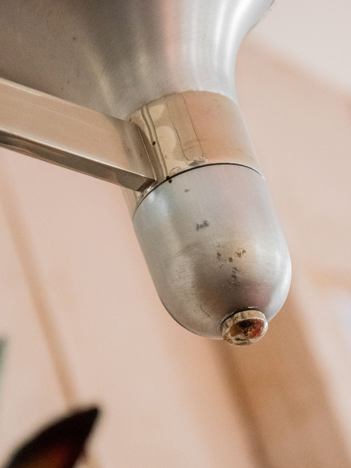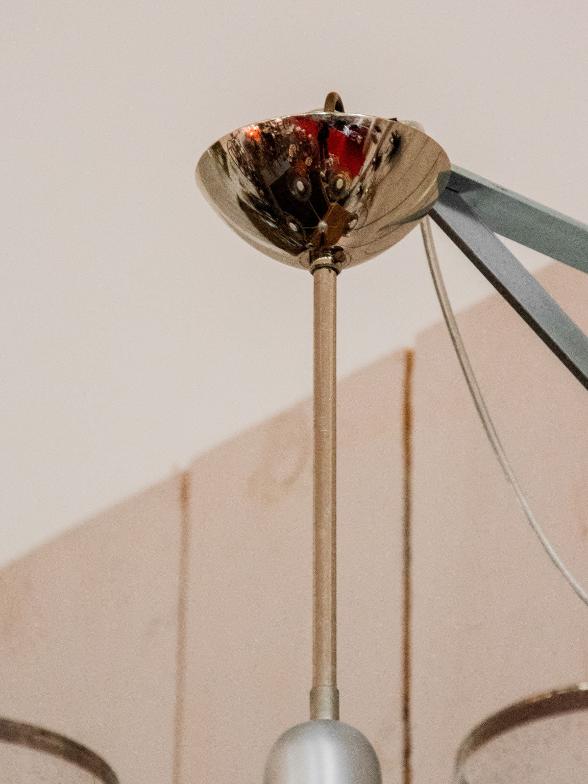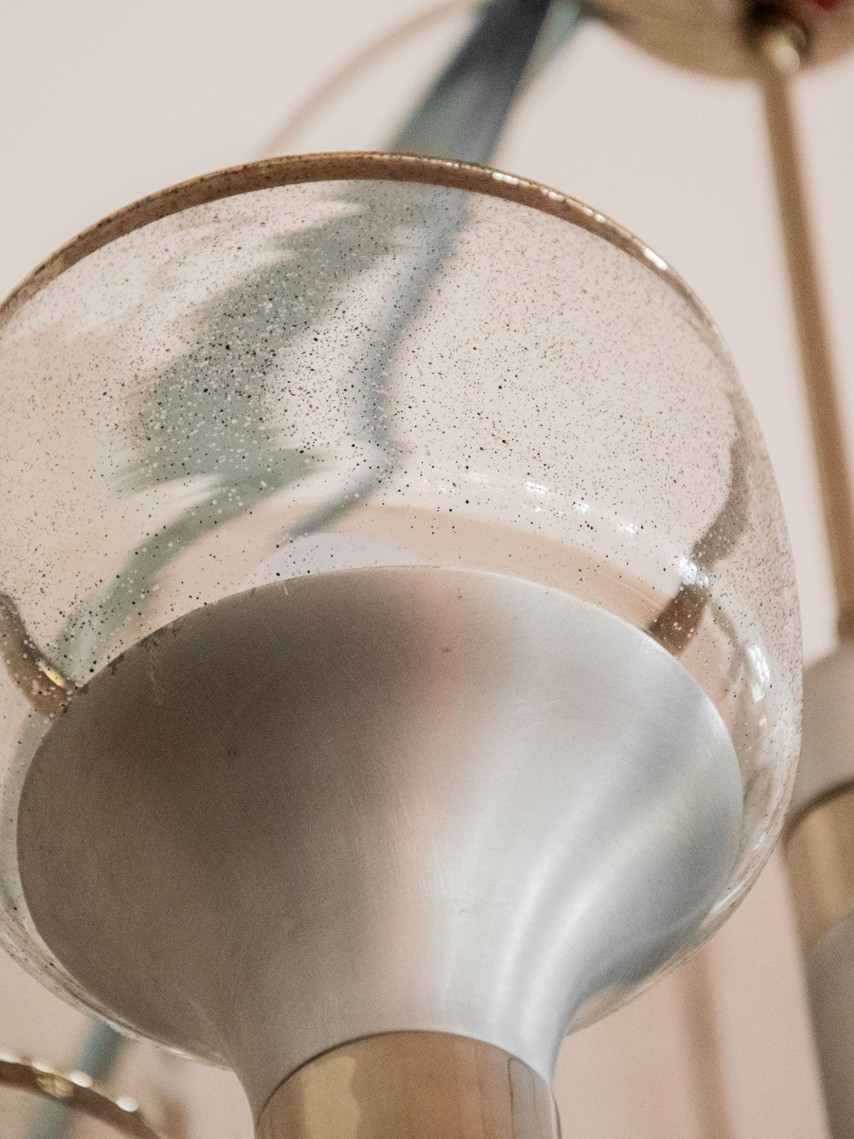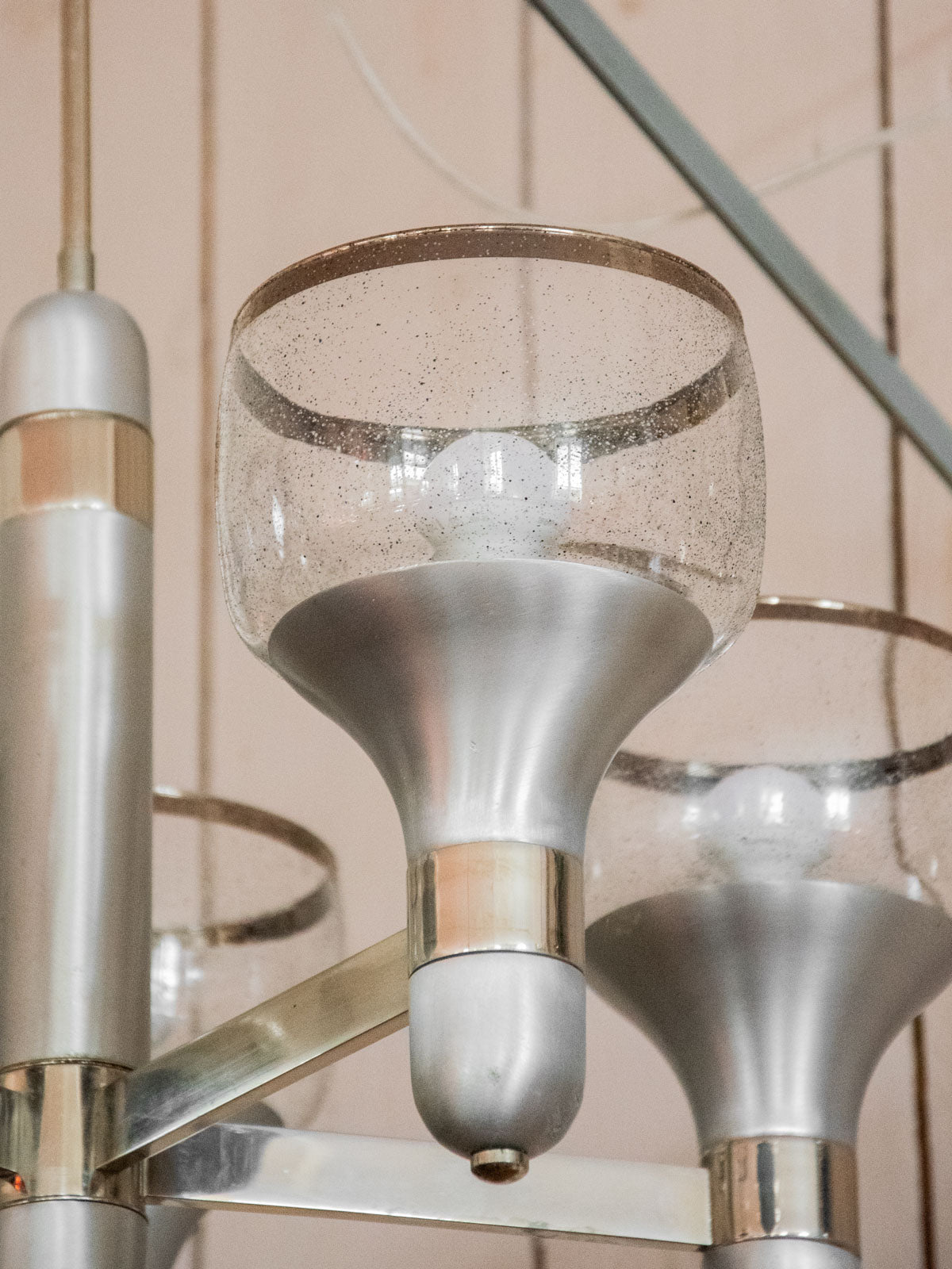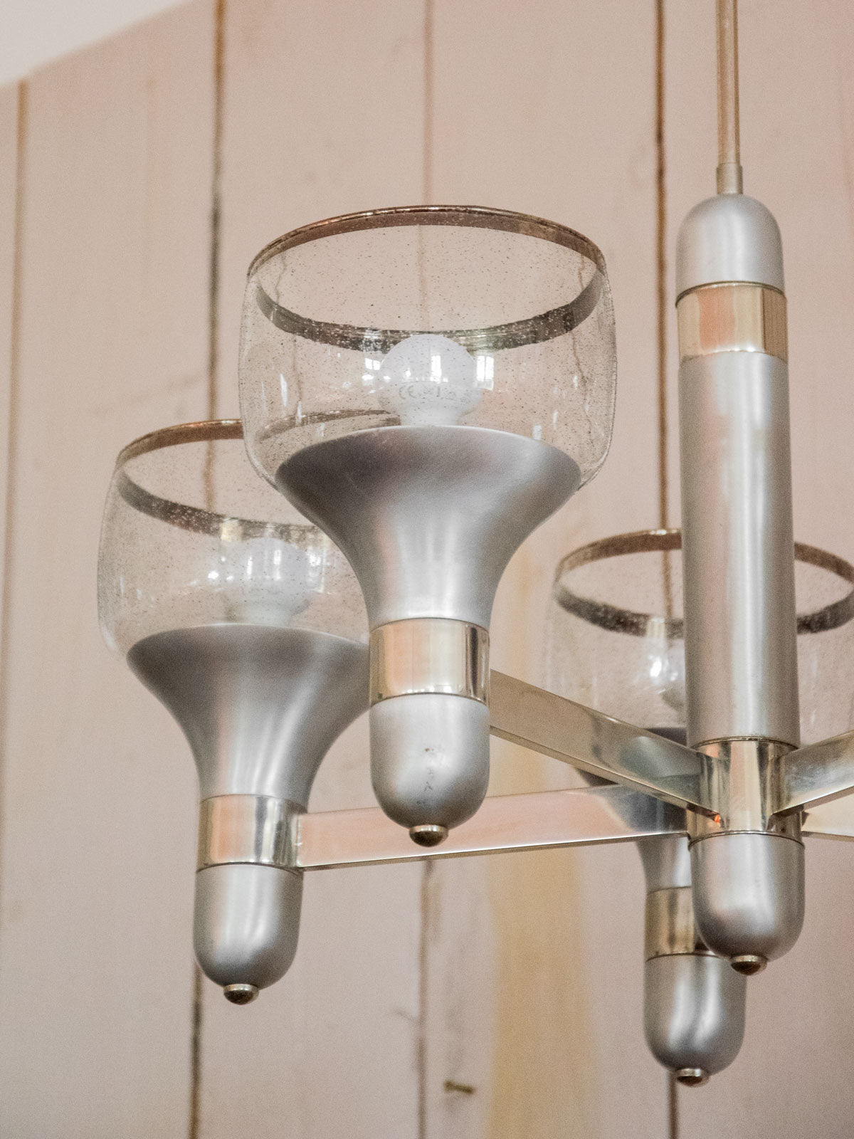 Sublimez votre intérieur avec cette suspension des années 70, d'inspiration Sciolari, alliant inox mat et éléments chromés pour un jeu de finis contrastés; ses cinq têtes en verre bullé d'origine impeccable diffusent une lumière douce et graphique, idéale au‑dessus d'une table ou au centre d'un salon; la structure métallique offre une présence sculpturale qui évoque une élégance rétro-moderne et installe une atmosphère chaleureuse et raffinée. Légères traces du temps.