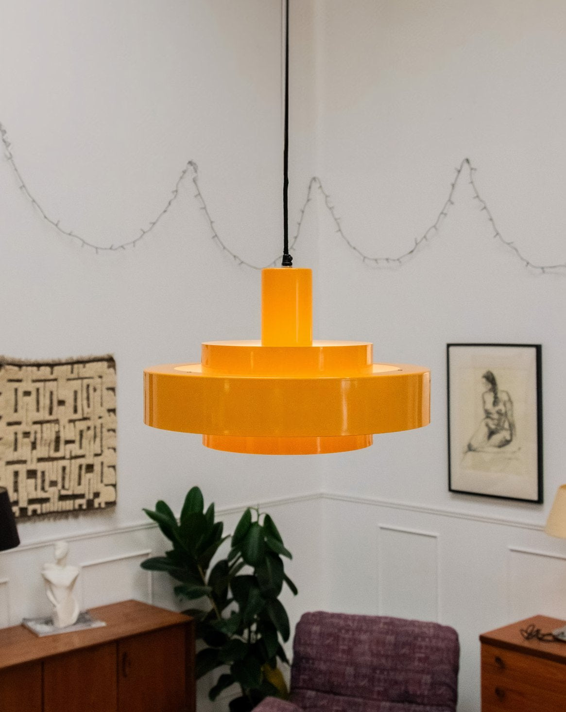 Découvrez la suspension jaune foncé dans le style emblématique de Jo Hammerborg, modèle Ecuador, datant des années 70. Fabriquée en métal de haute qualité, cette pièce unique apportera une touche rétro et chaleureuse à votre intérieur. Son design à la fois épuré et audacieux est parfait pour illuminer vos espaces tout en s'inscrivant dans l'esprit du design scandinave. Offrez à votre décor une note vintage pleine de caractère avec cette suspension au charme intemporel.