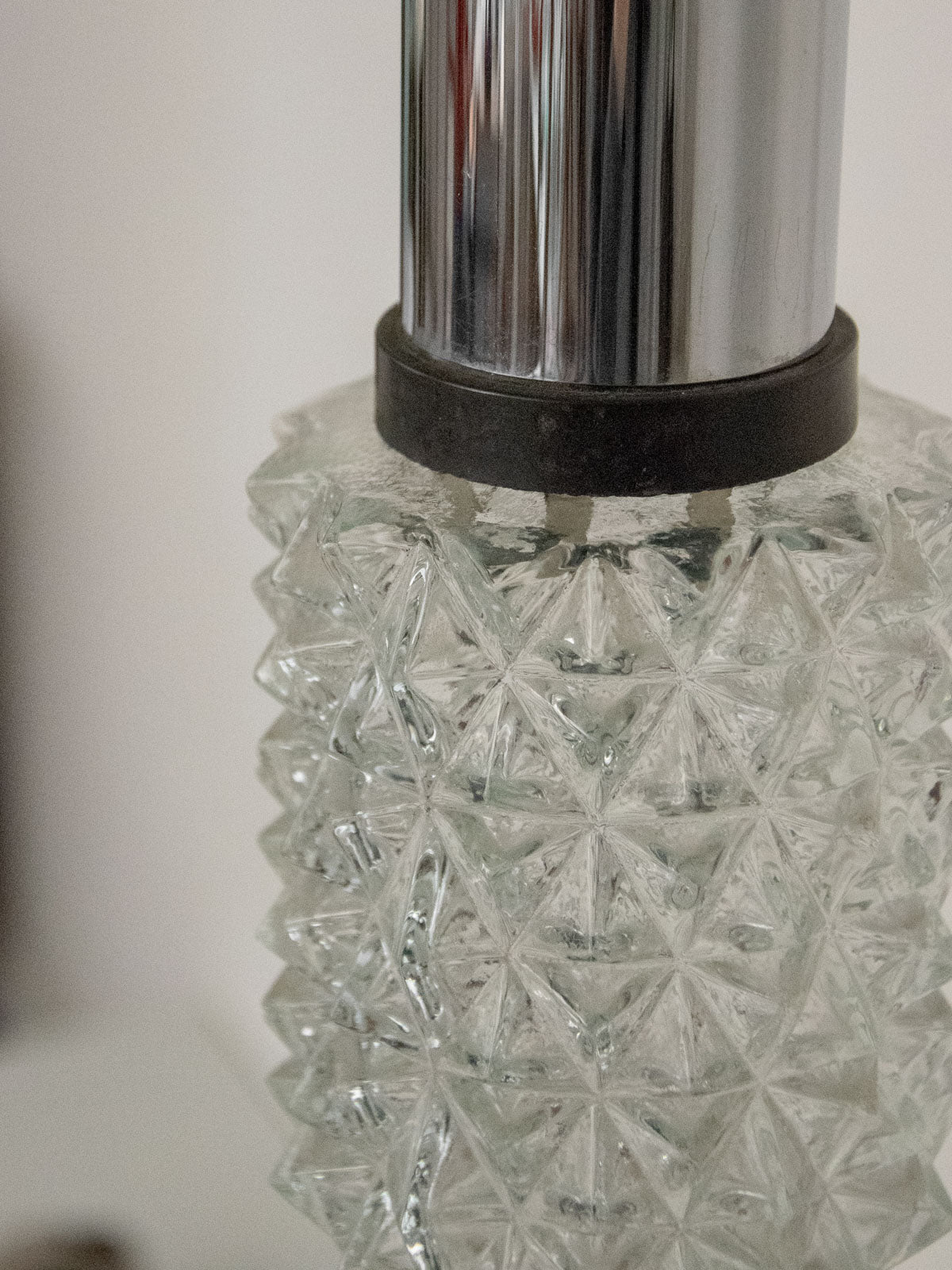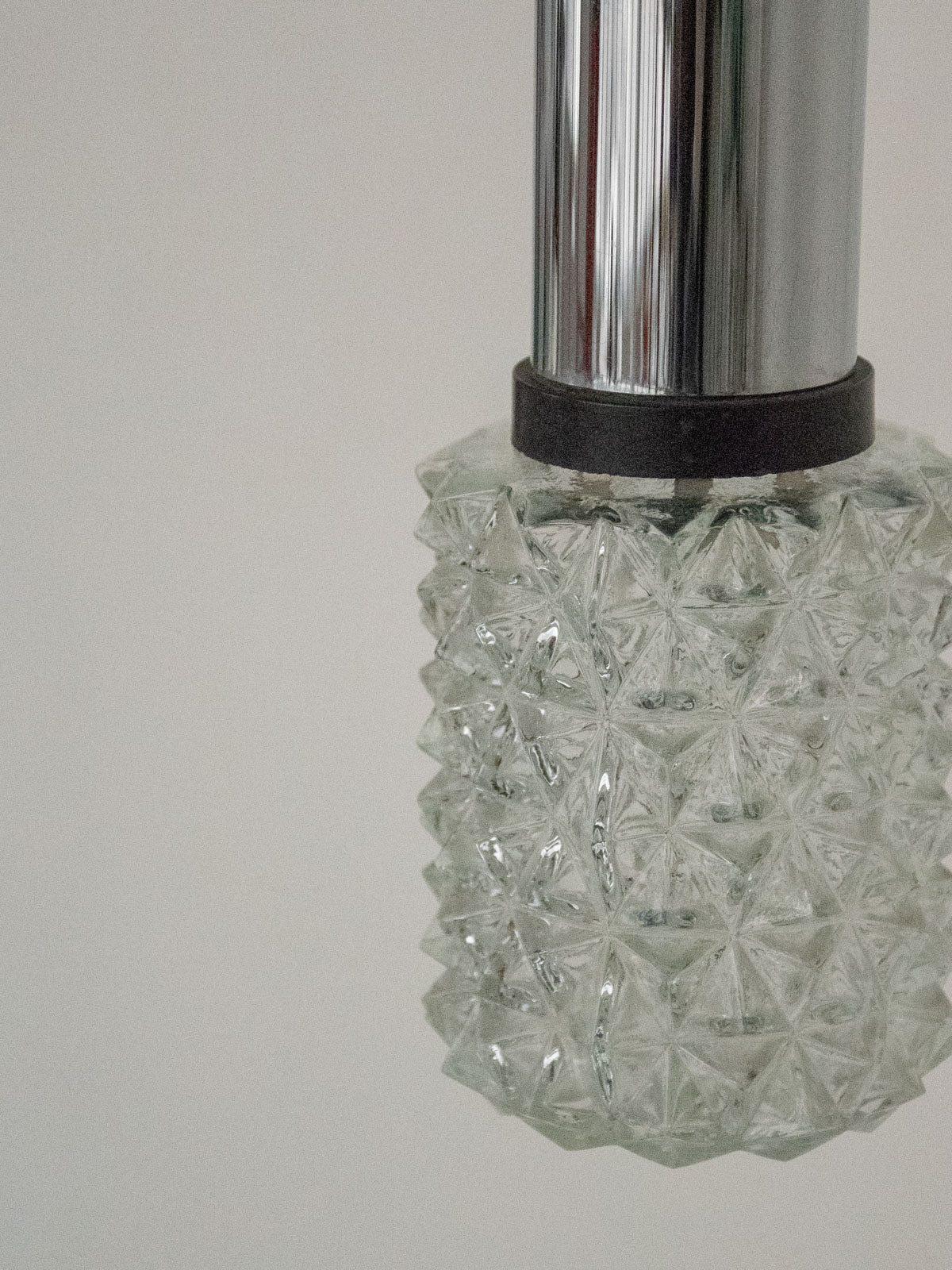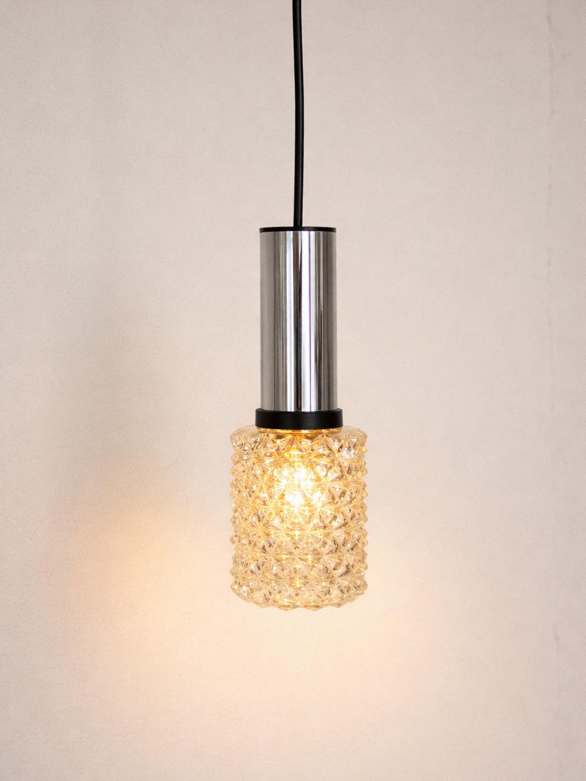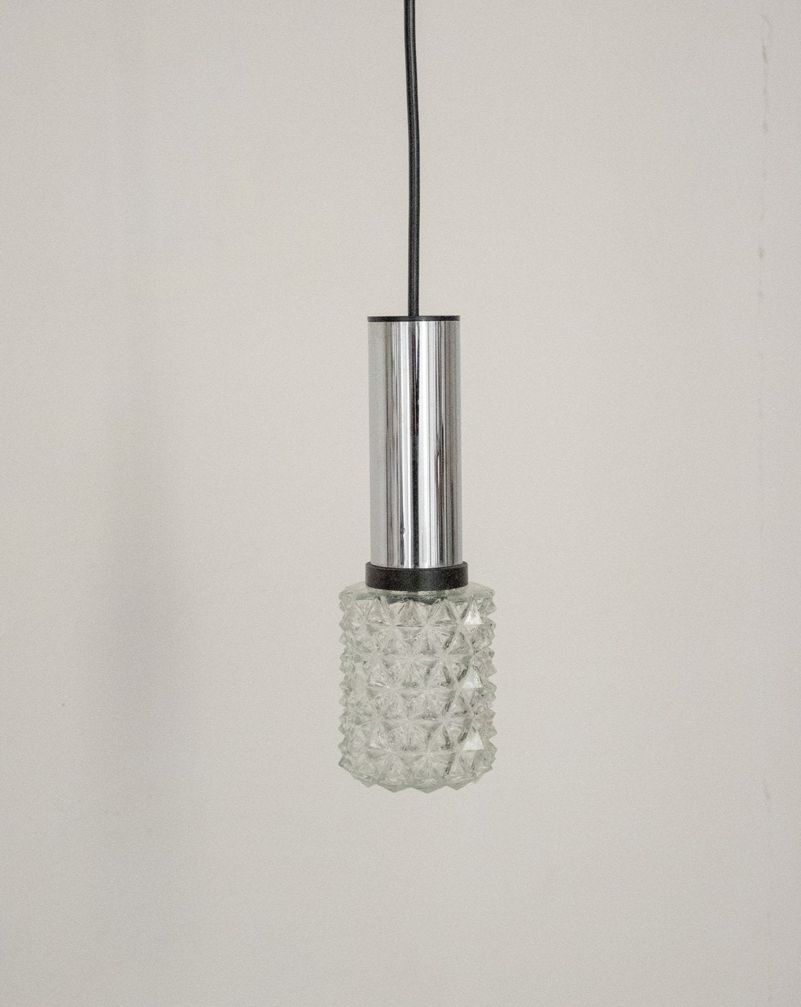 Découvrez cette suspension tubulaire des années 70 en verre moulé et métal chromé, aux lignes graphiques et à l’allure rétro-chic. Son format étroit et sa hauteur contenue en font une source lumineuse parfaite pour souligner un coin lecture, un bar ou une enfilade sans encombrer l’espace, tandis que le fil de longueur raisonnable permet une installation proche du plafond. Le verre diffuse une lumière douce et enveloppante, le chrome apporte une note contemporaine et structurée.