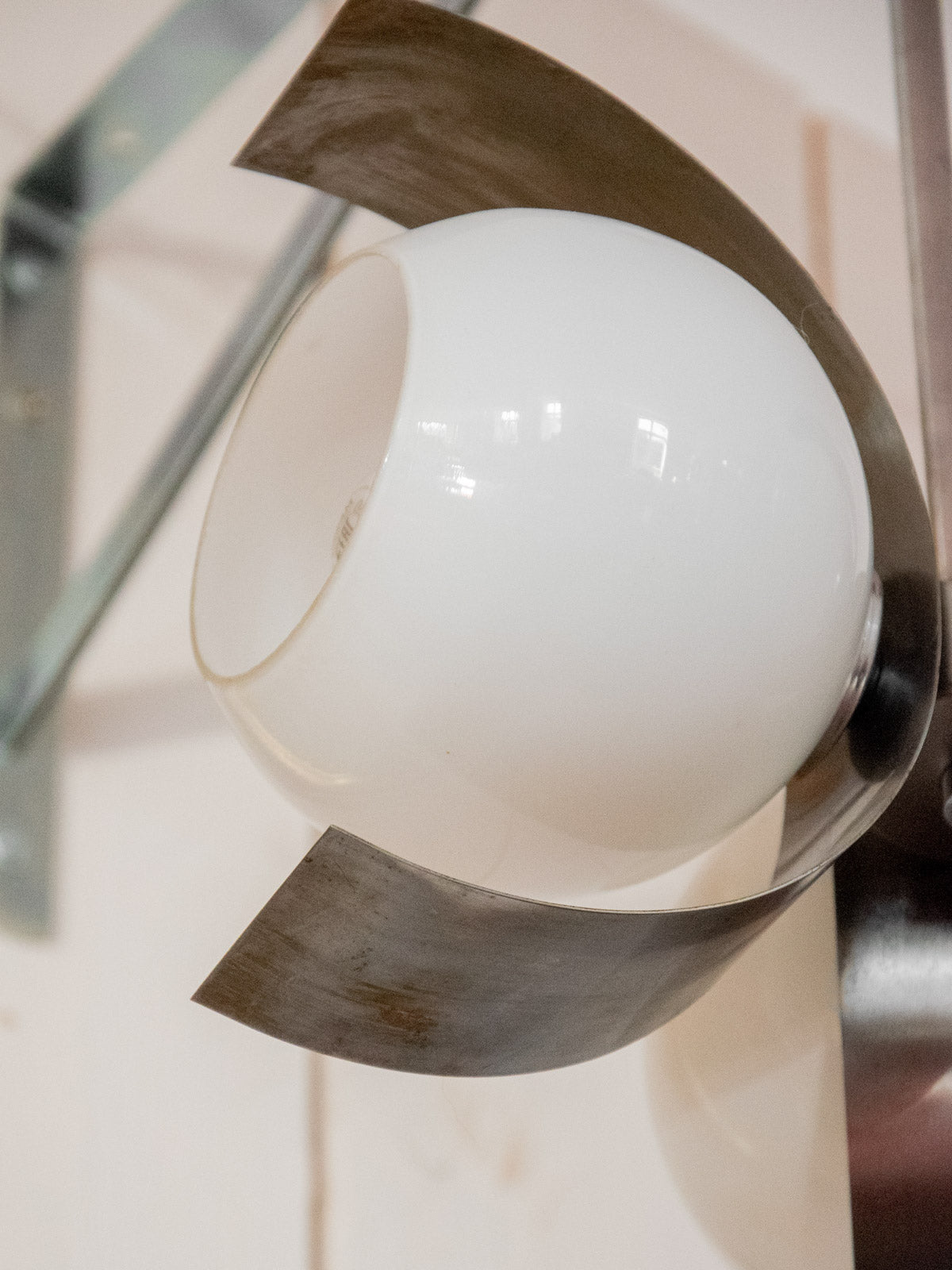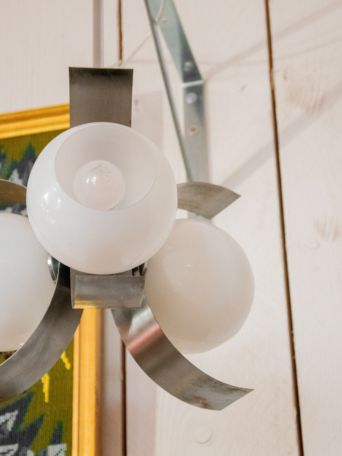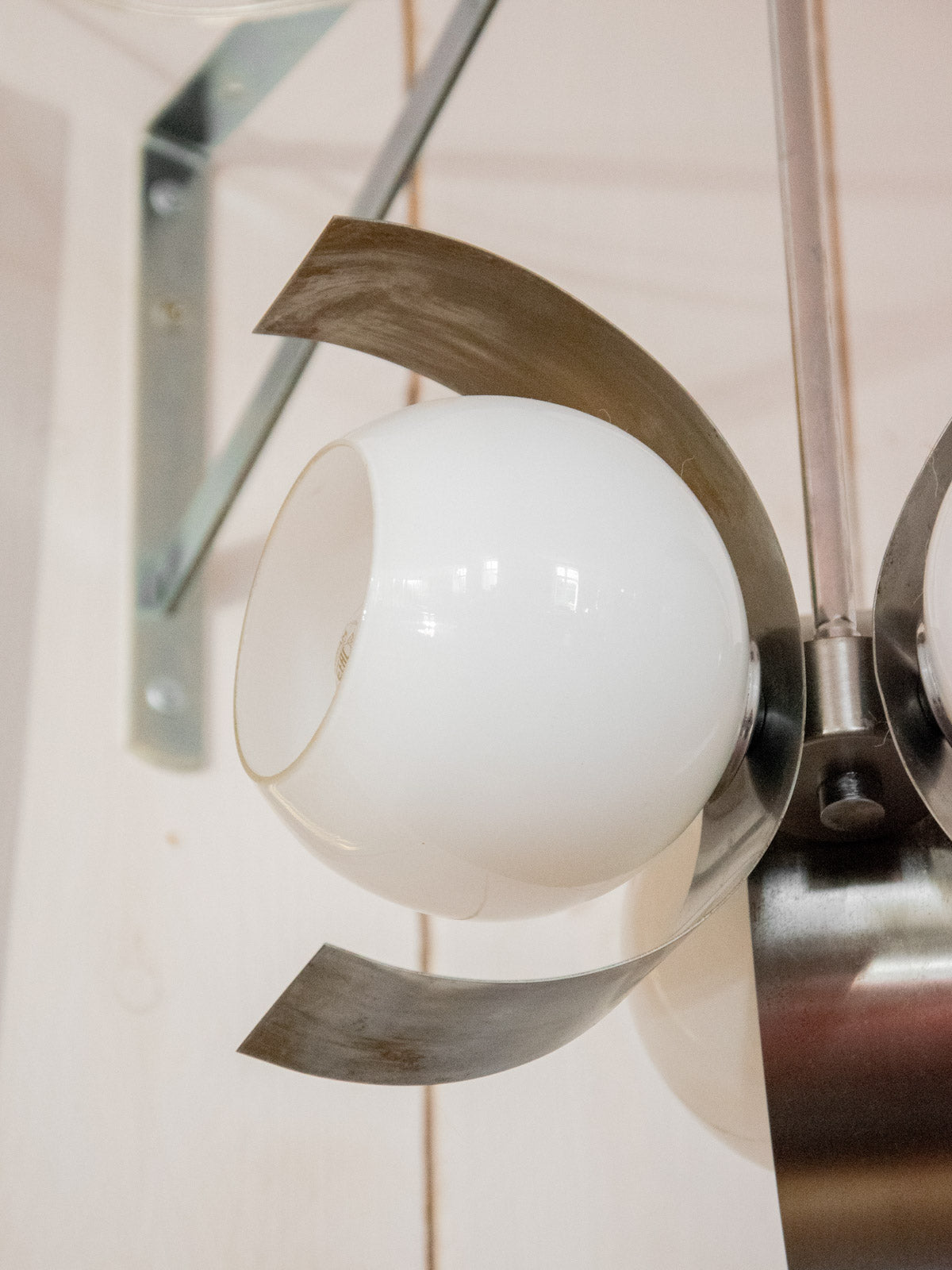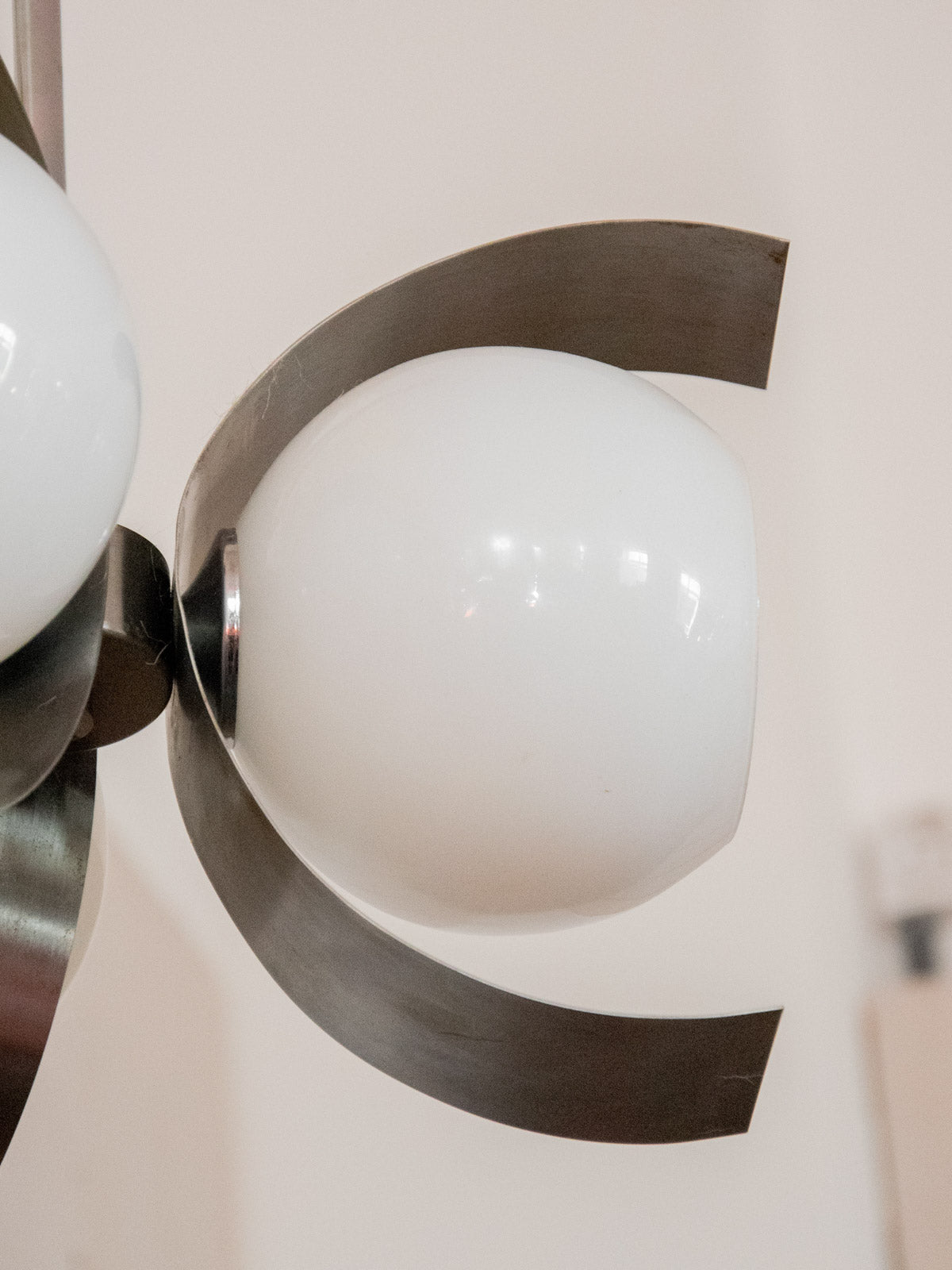 Découvrez ce lustre des années 70 aux 3 têtes en arc de lune, signature d'un design graphique et aérien. Assemblé en métal à la patine chaleureuse et pourvu de globes en verre translucide, il diffuse une lumière douce qui structure l'espace sans l'alourdir. Idéal au-dessus d'une table de salle à manger ou dans une entrée, il apporte une élégance rétro contemporaine et crée une atmosphère accueillante et sculpturale.