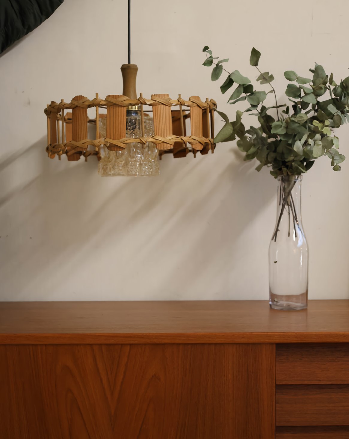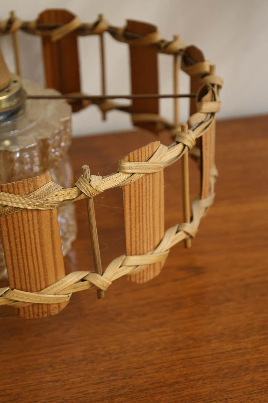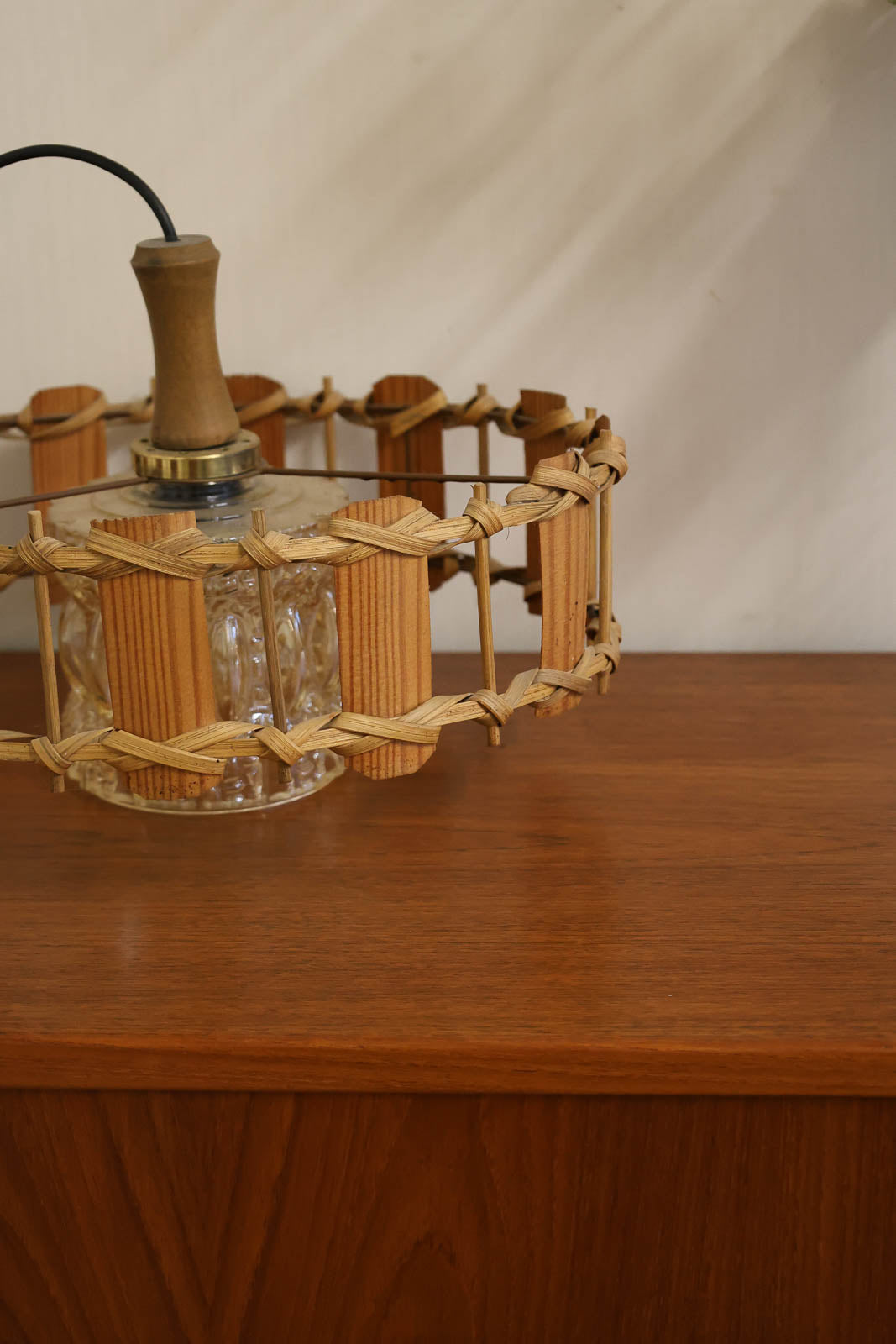 Adoptez cette suspension vintage des années 1970 en bois, rotin et verre, où une verrerie centrale se loge au cœur d'un entourage de lamelles de bois reliées par du rotin pour un rendu à la fois chaleureux et sculptural. Sa verrerie diffuse une lumière douce tandis que l'ossature en lamelles crée des jeux d'ombre élégants ; la douille à vis classique facilite l'installation. Idéale pour éclairer une salle à manger intime, un coin lecture ou une entrée, elle apporte une touche rétro et naturelle à tout intérieur. Format compact adapté aux petits espaces.