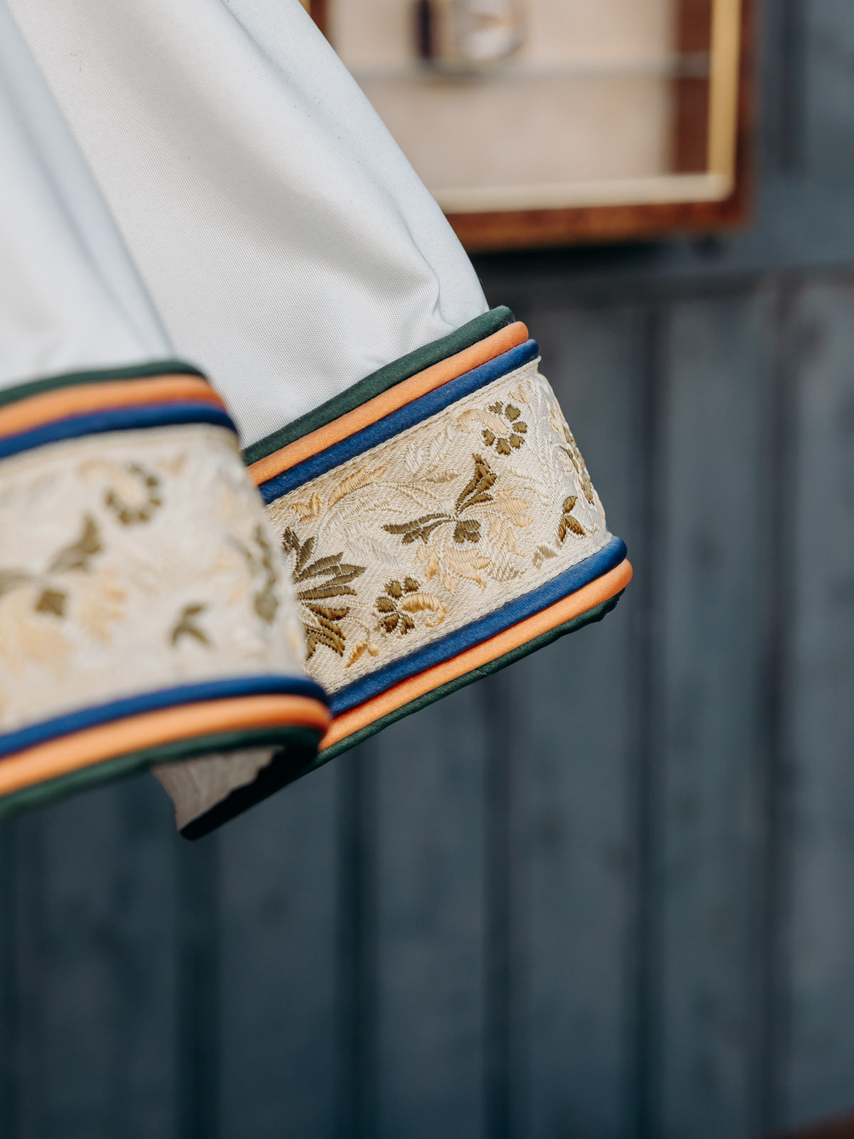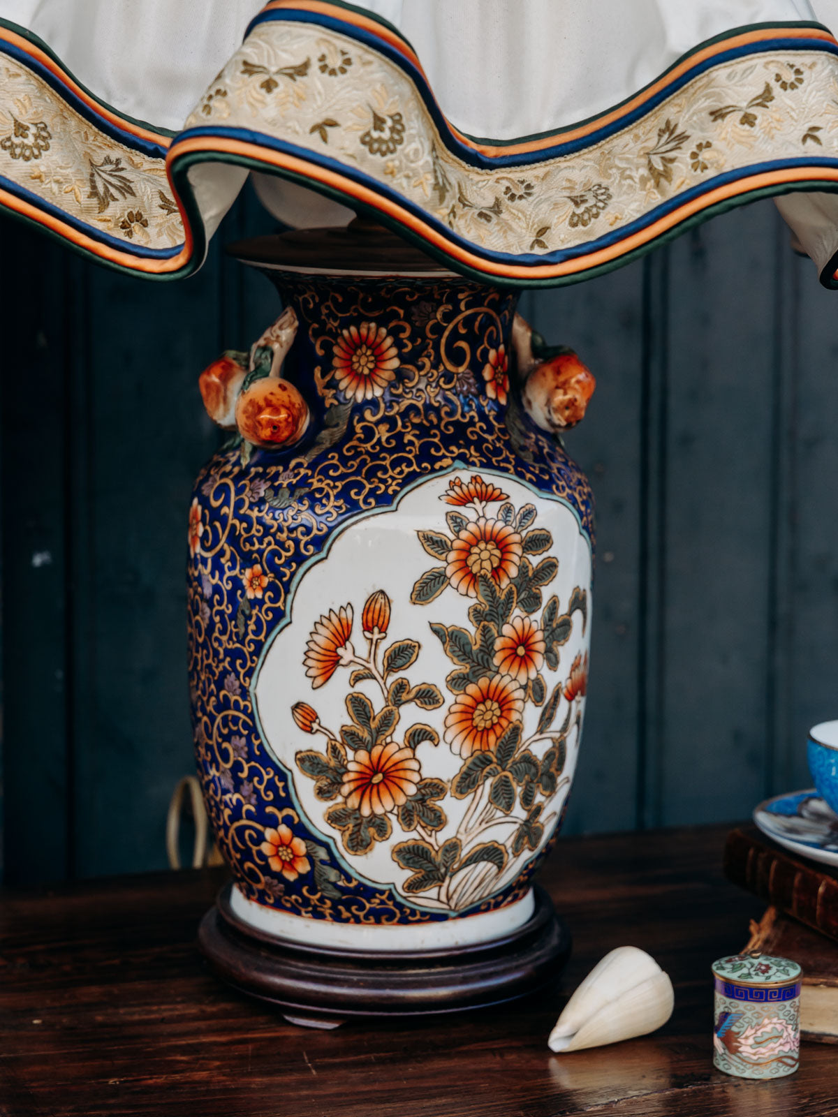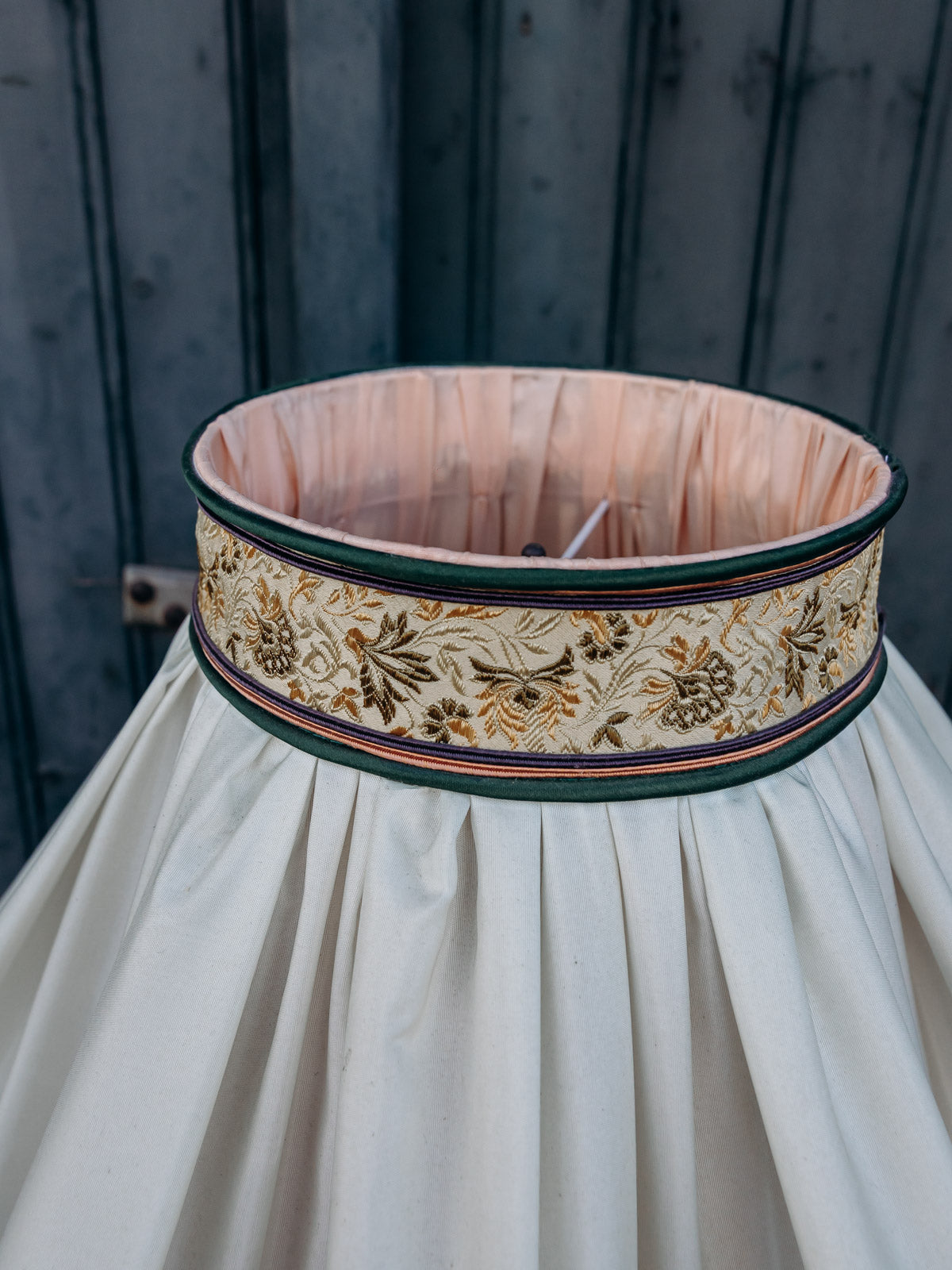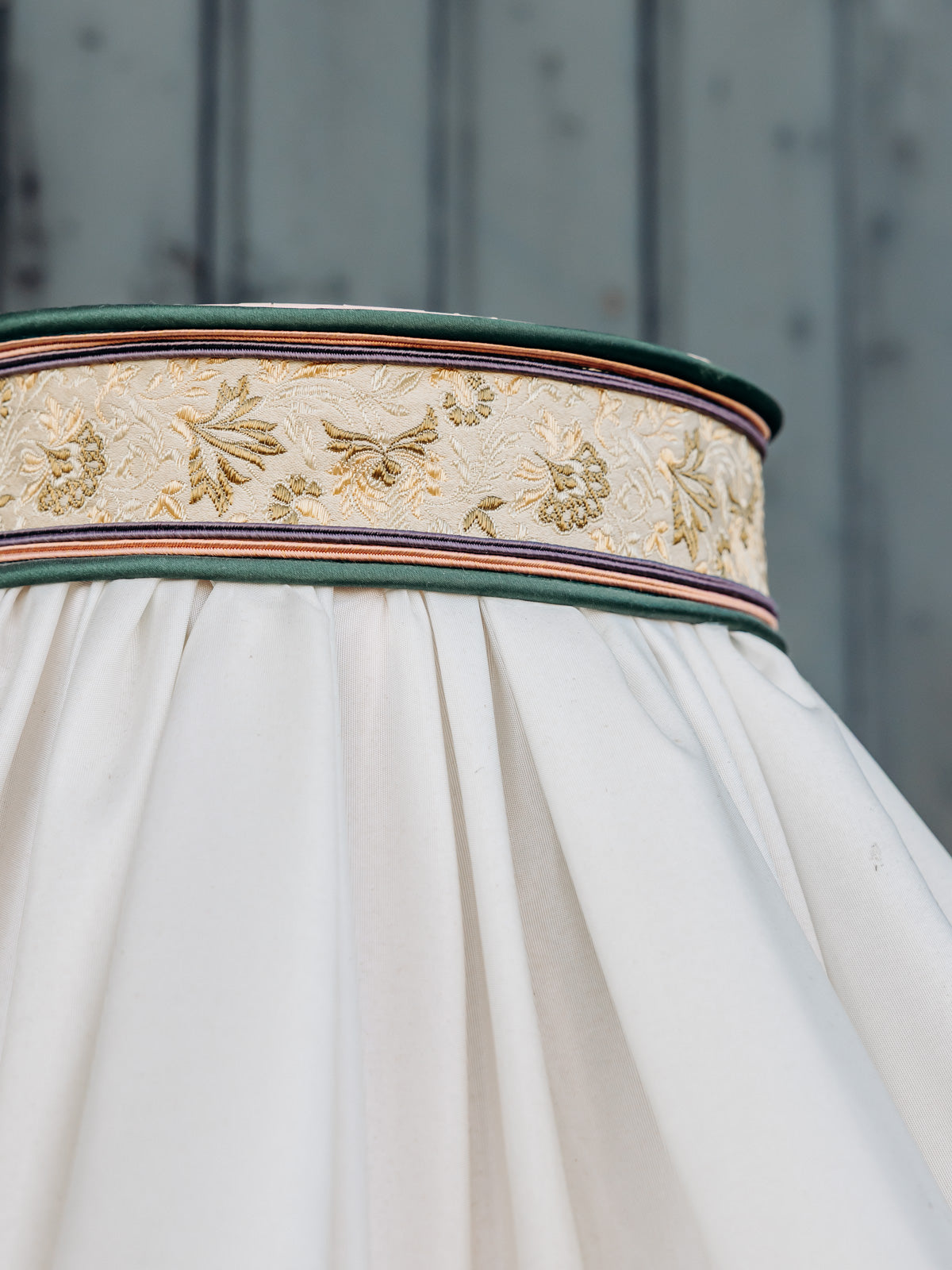 Sublimez votre intérieur avec cette grande lampe à poser en céramique émaillée, au socle aux finitions soignées. Son abat-jour juponné réglable en hauteur et de belle envergure, rehaussé de détails dorés, diffuse une lumière chaleureuse et enveloppante en diffusant plus ou moins l'éclairage selon les envies. Idéale pour un coin lecture ou une table d'appoint. Conçue pour accueillir deux ampoules E27, elle allie présence et délicatesse, apportant une touche d'élégance discrète et contemporaine à la pièce.