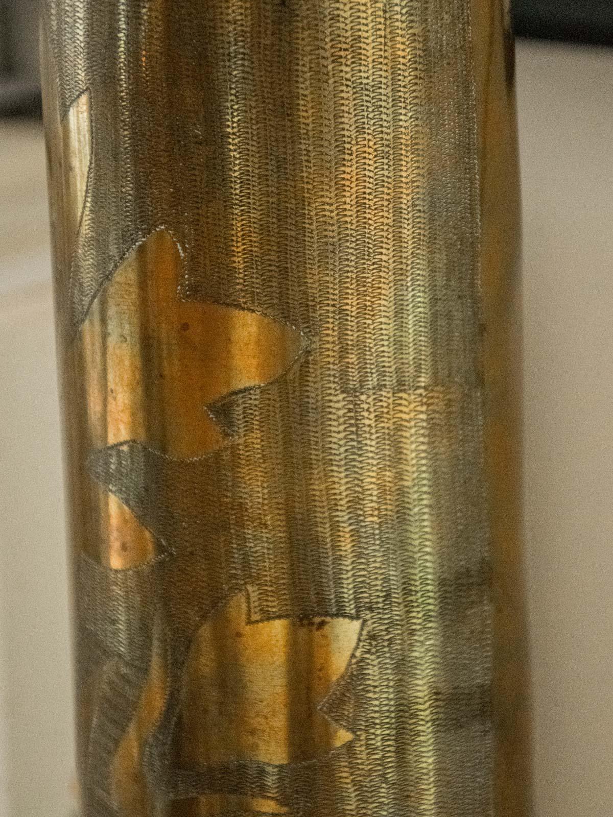 Sublimez votre intérieur avec cette lampe à poser au pied obus finement gravé et à la silhouette cylindrique, qui marie une esthétique rétro à une élégance contemporaine. Son abat-jour en tissu blanc diffuse une lumière douce et enveloppante, parfaite pour créer une atmosphère chaleureuse sur une table de chevet, une console ou un bureau. L'électricité a été refaite à neuf, garantissant un usage sûr et immédiat.