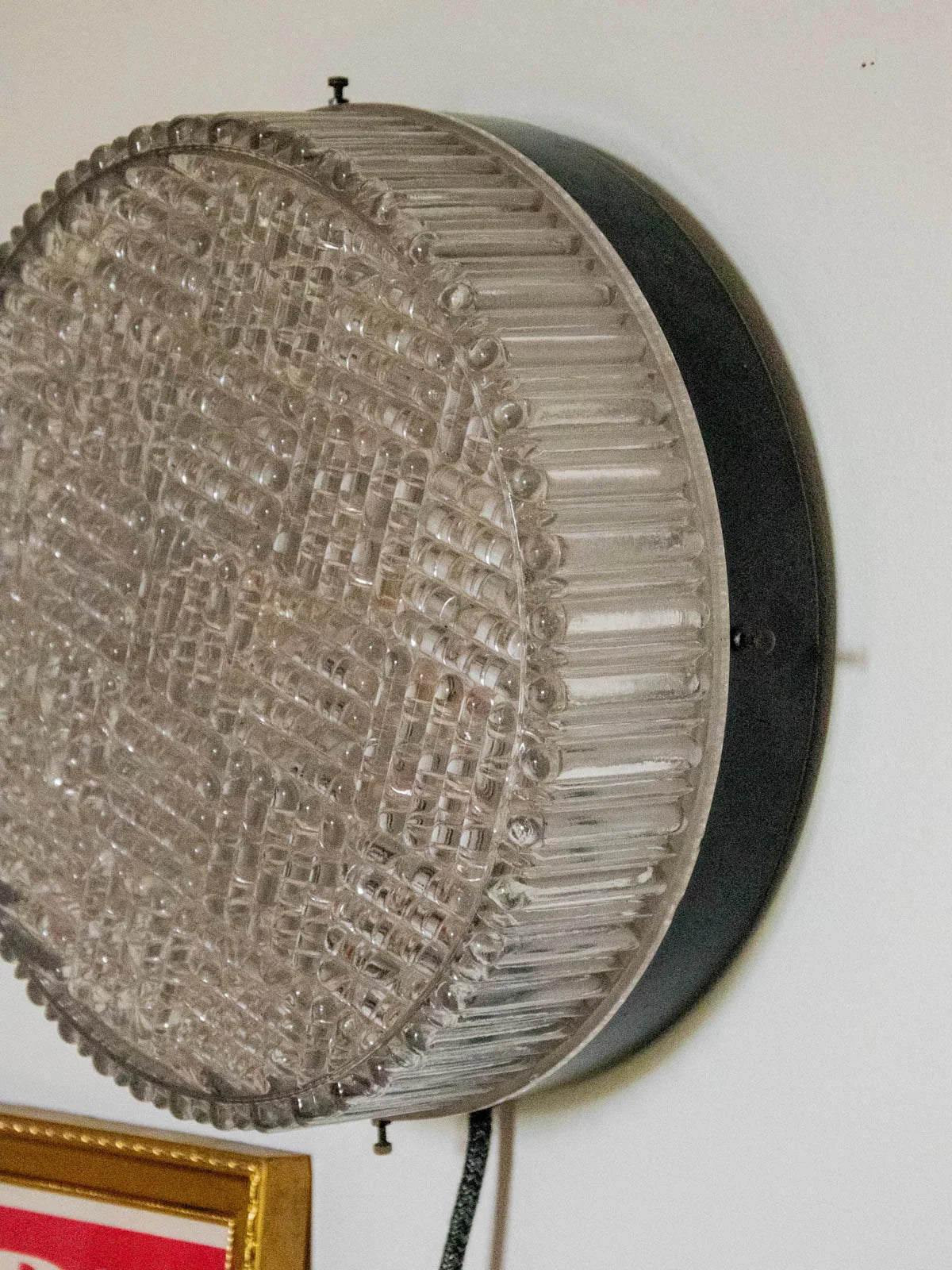 Invitez une lumière douce et artisanale dans votre intérieur avec cette lampe unique entièrement rénovée, dotée d'un verre rond texturé et d'un socle noir au style sobre et contemporain. Refaite à neuf au niveau électrique et fournie avec son ampoule G9 (teinte chaude 2700K), elle se branche simplement et se place en applique ou posée sur un meuble grâce à son câble long et son interrupteur intégré. Compacte et aux proportions équilibrées, elle crée une atmosphère intimiste idéale pour une chambre, un coin lecture ou une entrée.