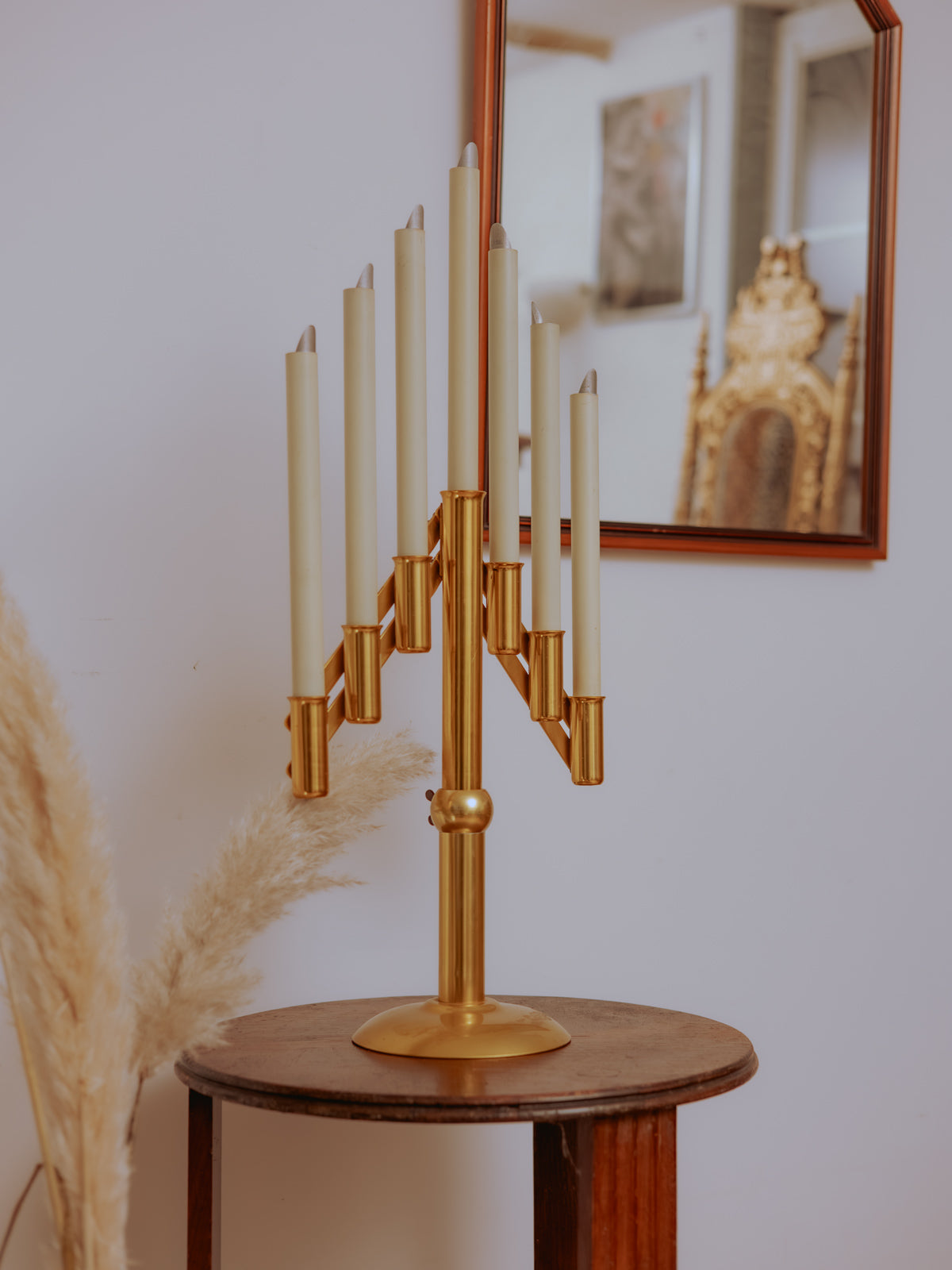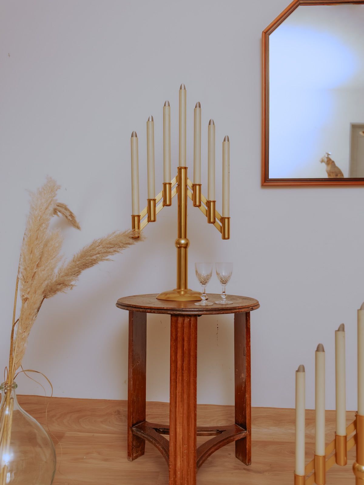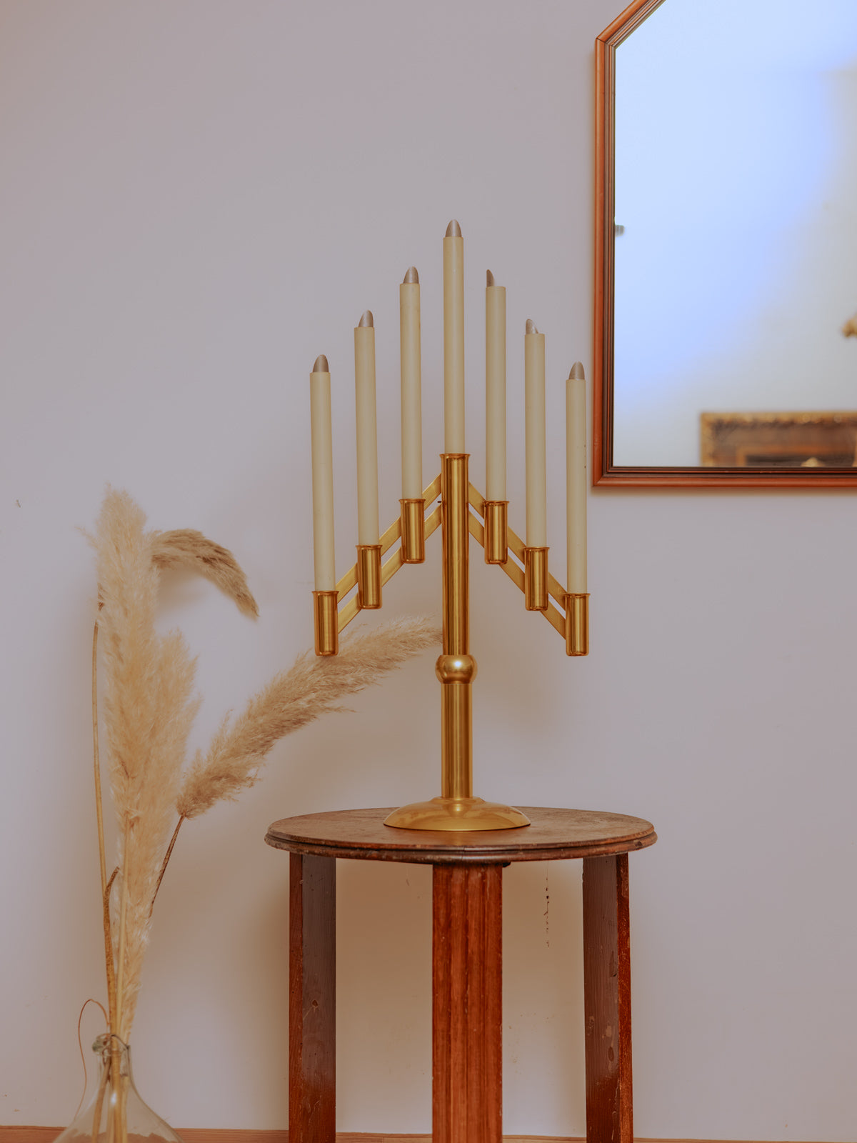 Découvrez ce chandelier en métal doré à sept supports de bougies, où un fût imitant la bougie blanche dialogue avec des reposoirs argentés pour un contraste délicat. Pensé pour animer une table ou sublimer une cheminée, ou encore une console, il diffuse une lumière chaude et crée une atmosphère élégante et intimiste. Son équilibre vertical et sa capacité à accueillir plusieurs bougies en font un point focal raffiné pour dîners et cérémonies. Réglable en hauteur, légères traces du temps présentes.