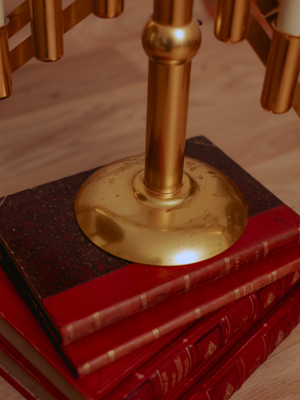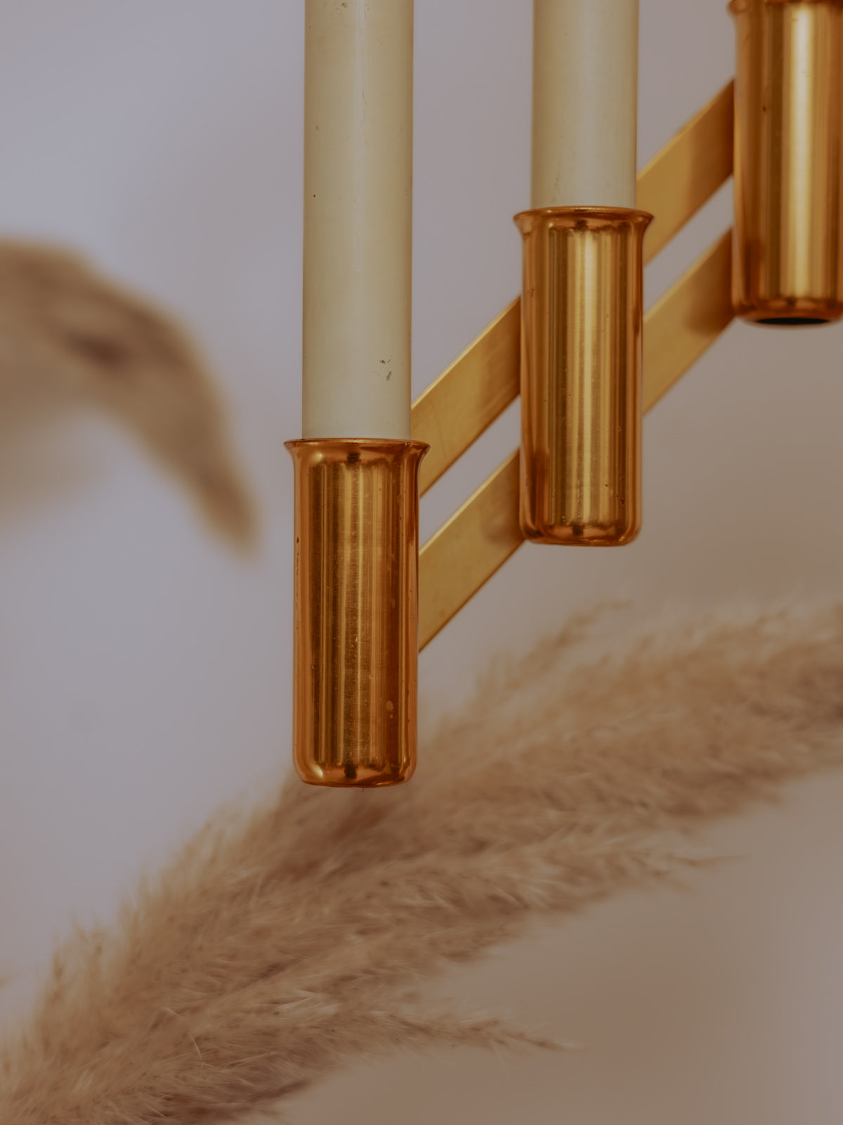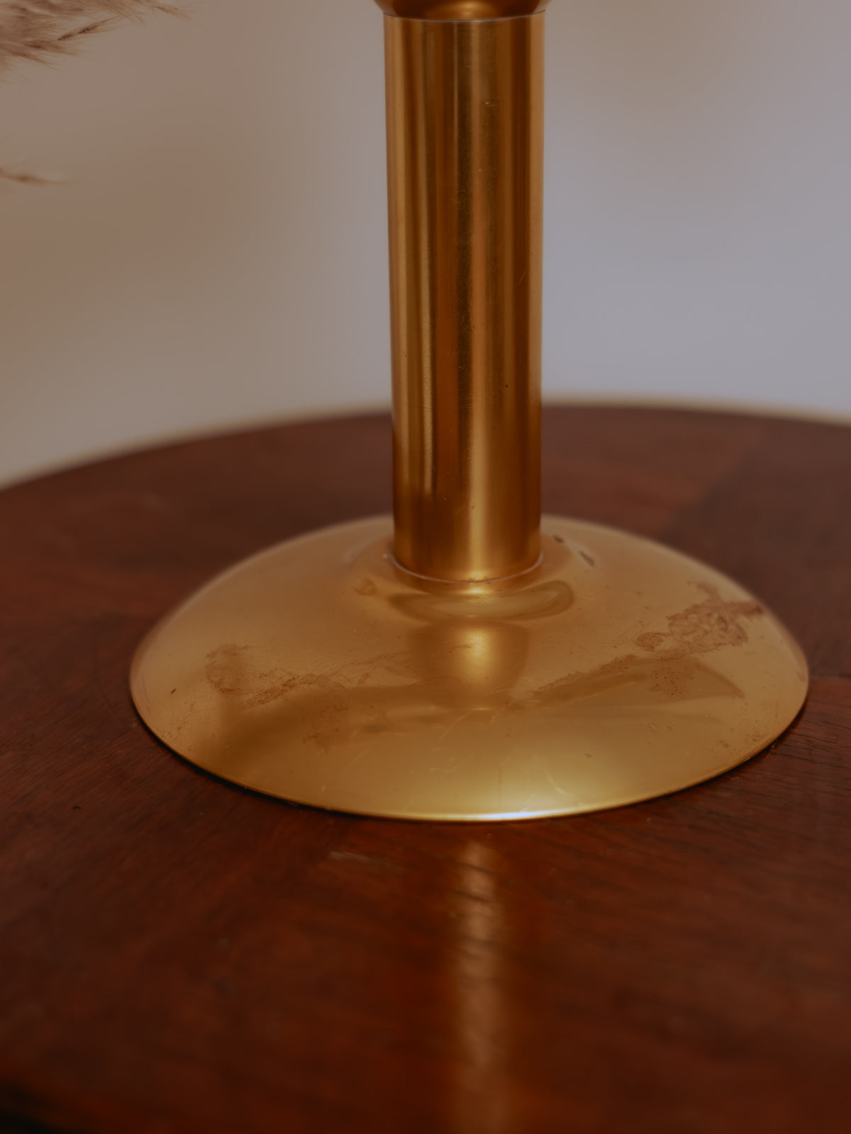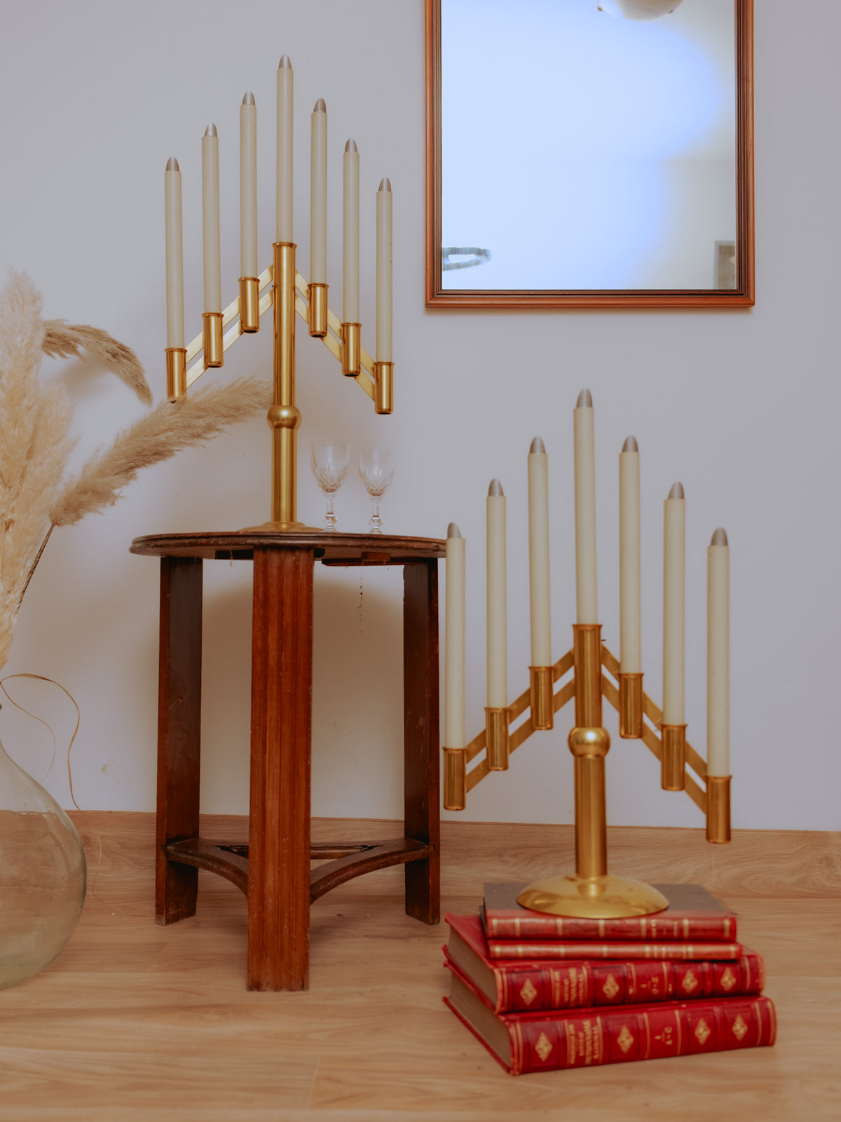 Découvrez ce chandelier en métal doré à sept supports de bougies, où un fût imitant la bougie blanche dialogue avec des reposoirs argentés pour un contraste délicat. Pensé pour animer une table ou sublimer une cheminée, ou encore une console, il diffuse une lumière chaude et crée une atmosphère élégante et intimiste. Son équilibre vertical et sa capacité à accueillir plusieurs bougies en font un point focal raffiné pour dîners et cérémonies. Réglable en hauteur, légères traces du temps présentes.