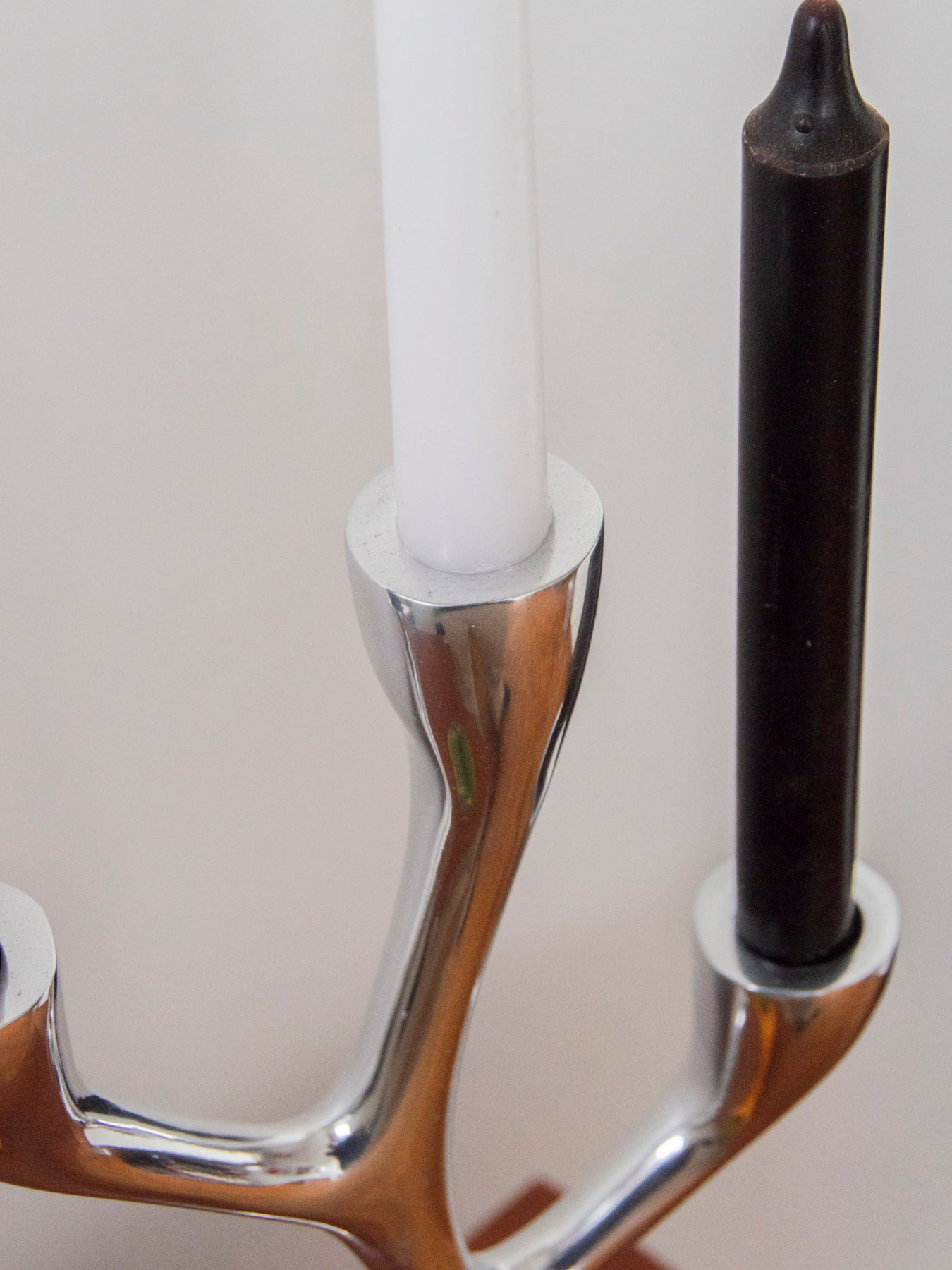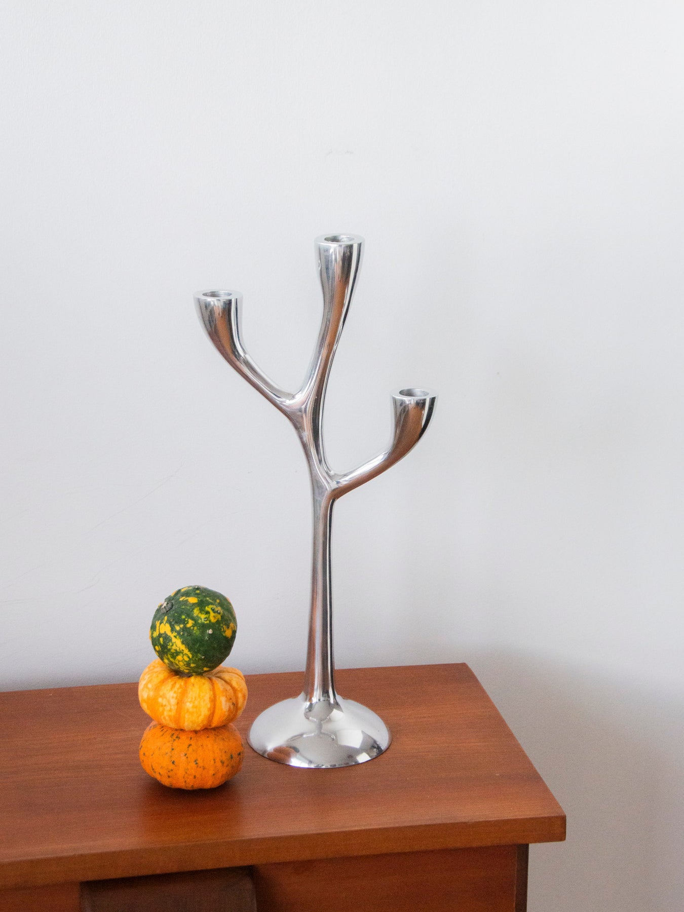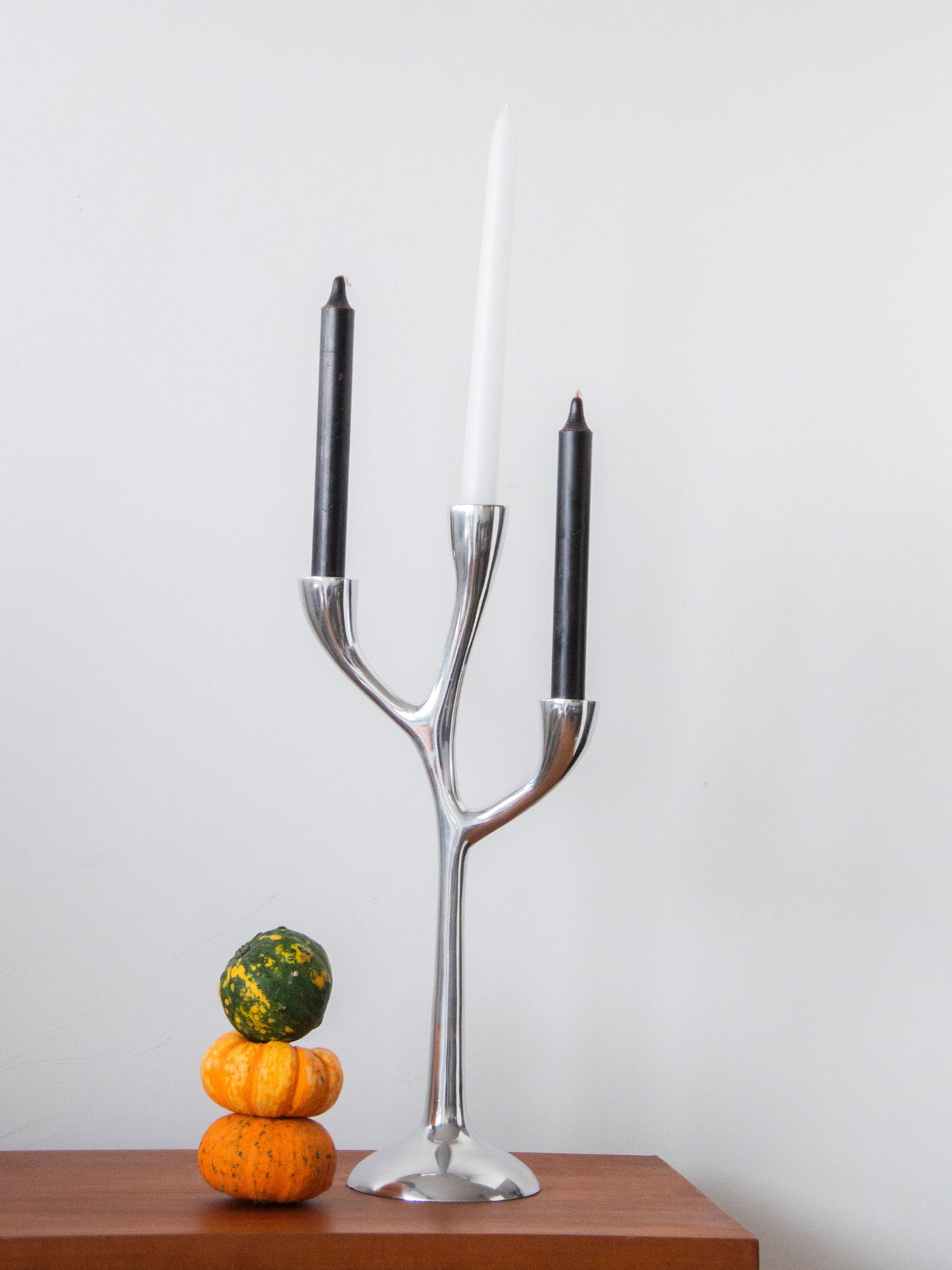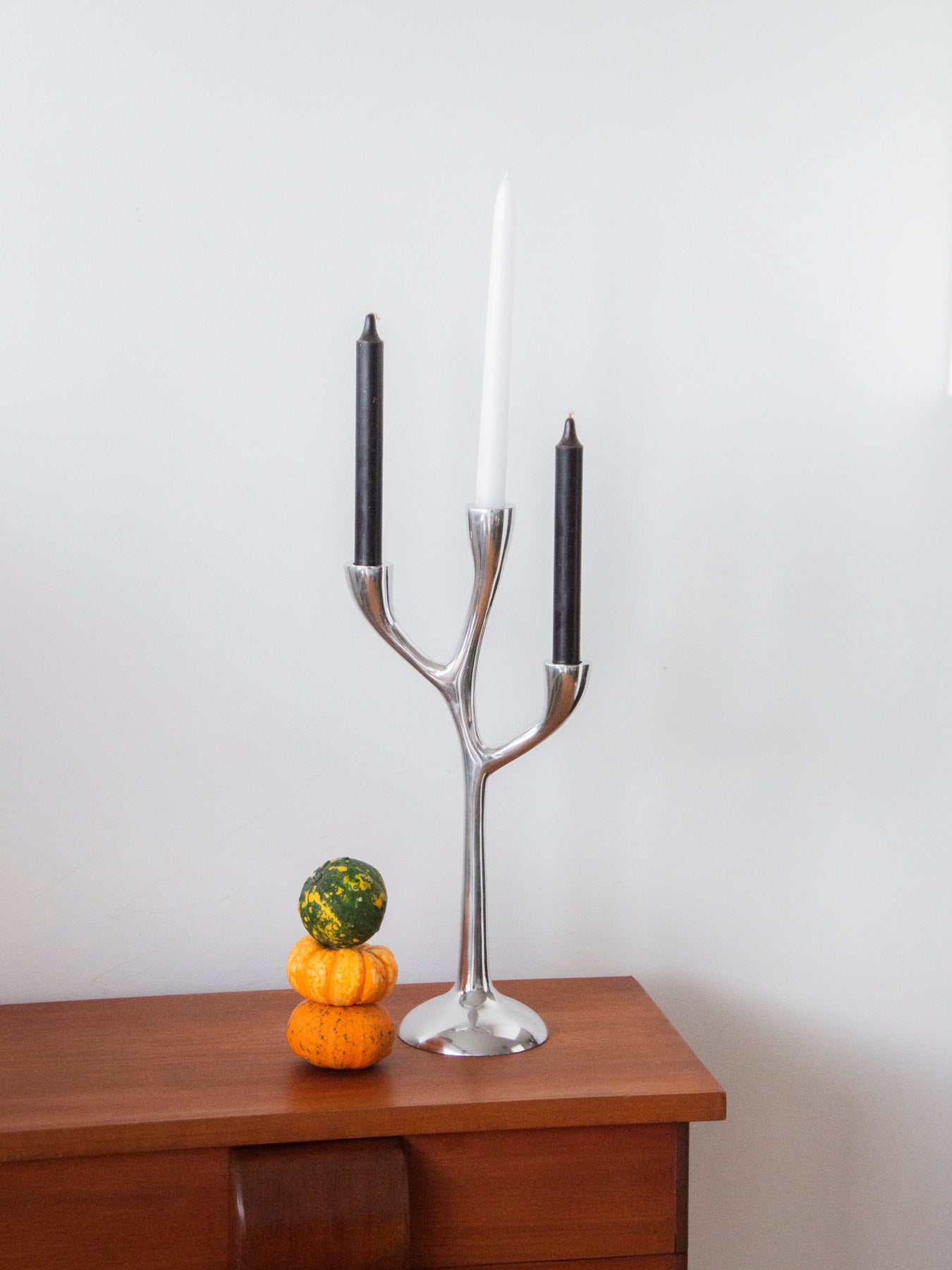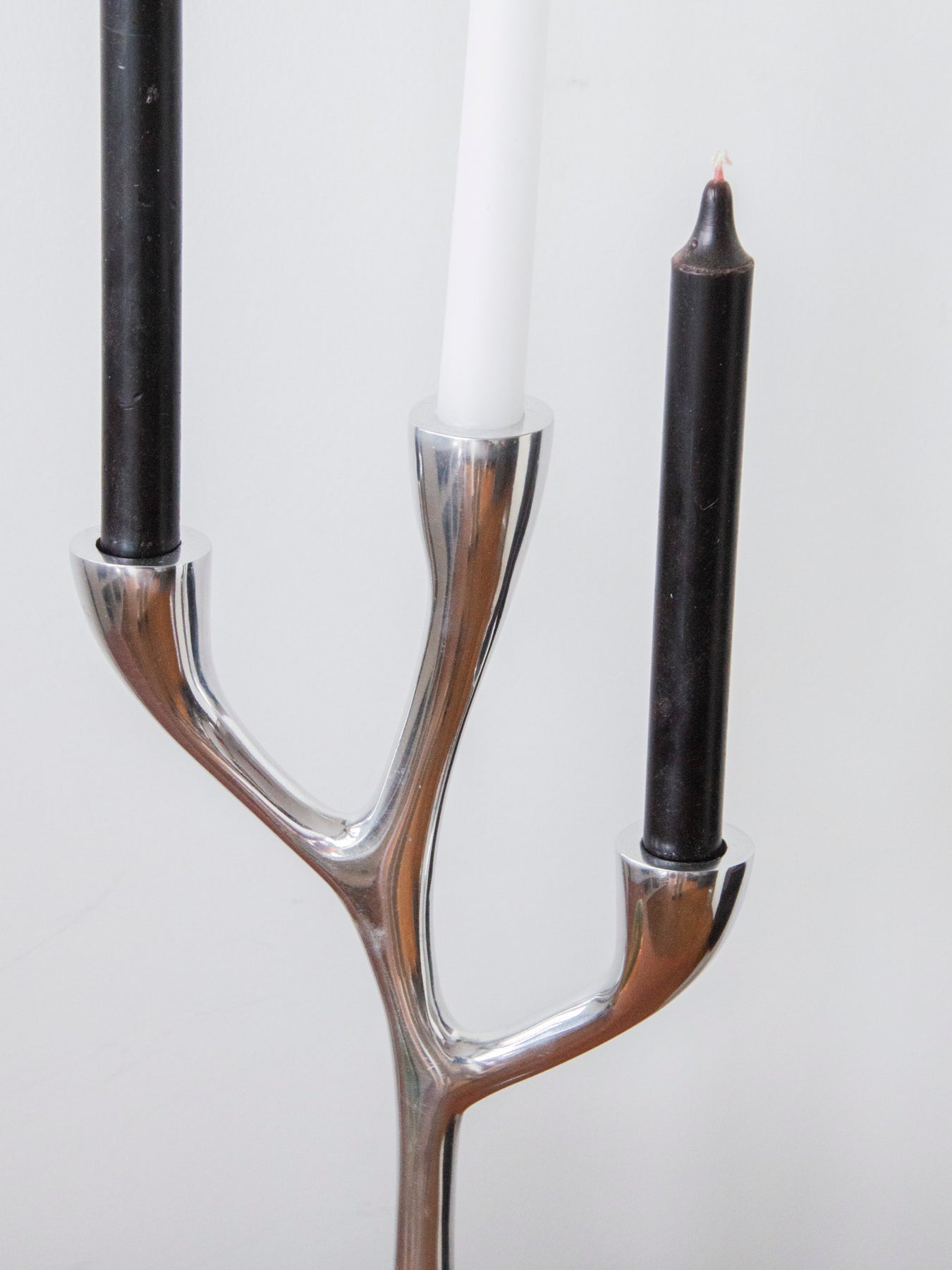 Invitez ce bougeoir moderniste à la silhouette organique en fonte d'aluminium dans votre intérieur, qui se lit comme une petite sculpture design; ses courbes apportent une présence artistique et contemporaine. Conçu pour accueillir trois bougies fines, il trouve sa place sur une table, une console ou une étagère pour composer une ambiance douce et chaleureuse. Sa finition mate met en valeur le métal et s'accorde à des décors sobres ou plus audacieux. Vendu sans bougies et en parfait état.
