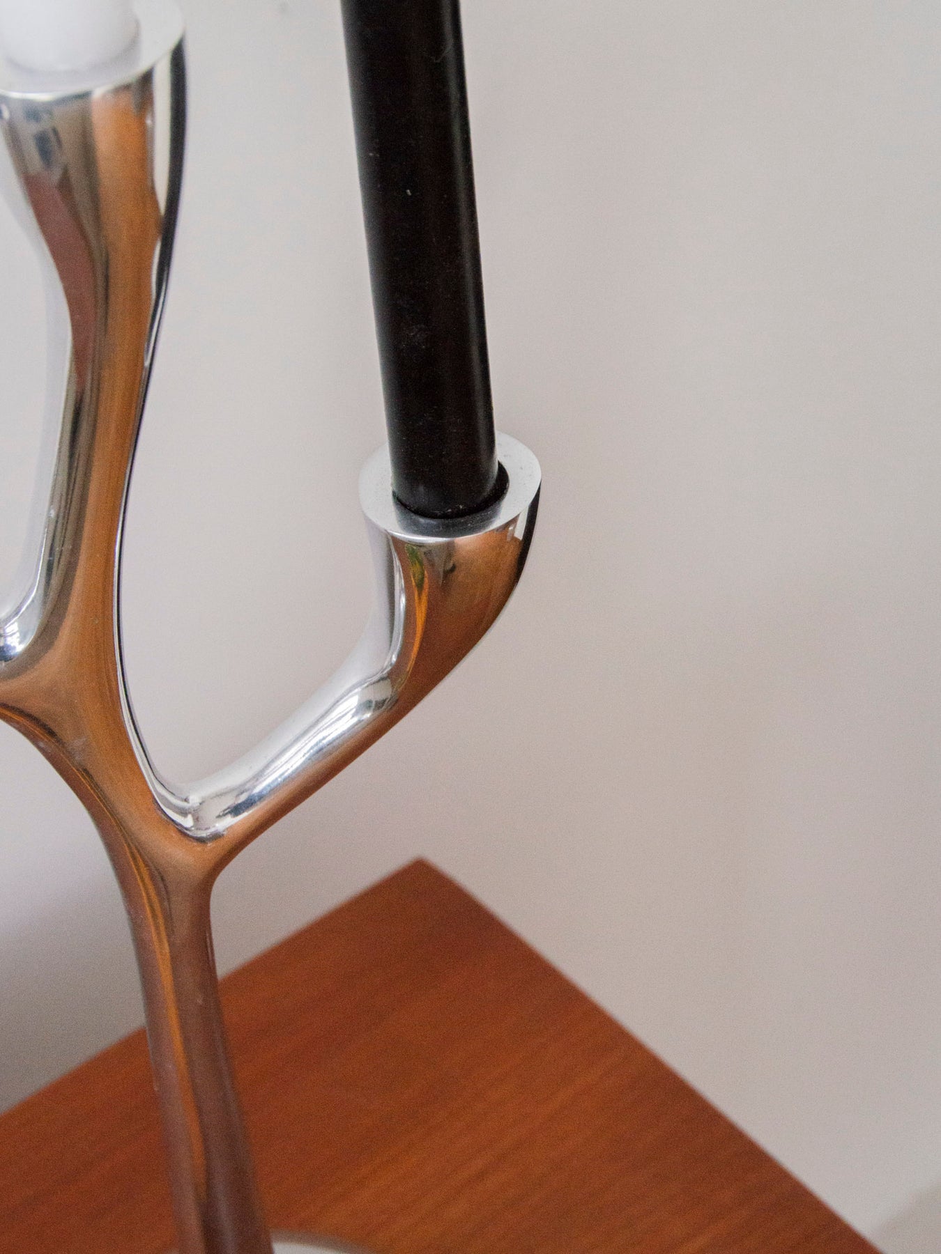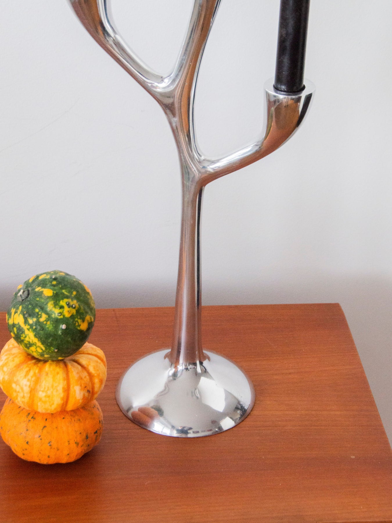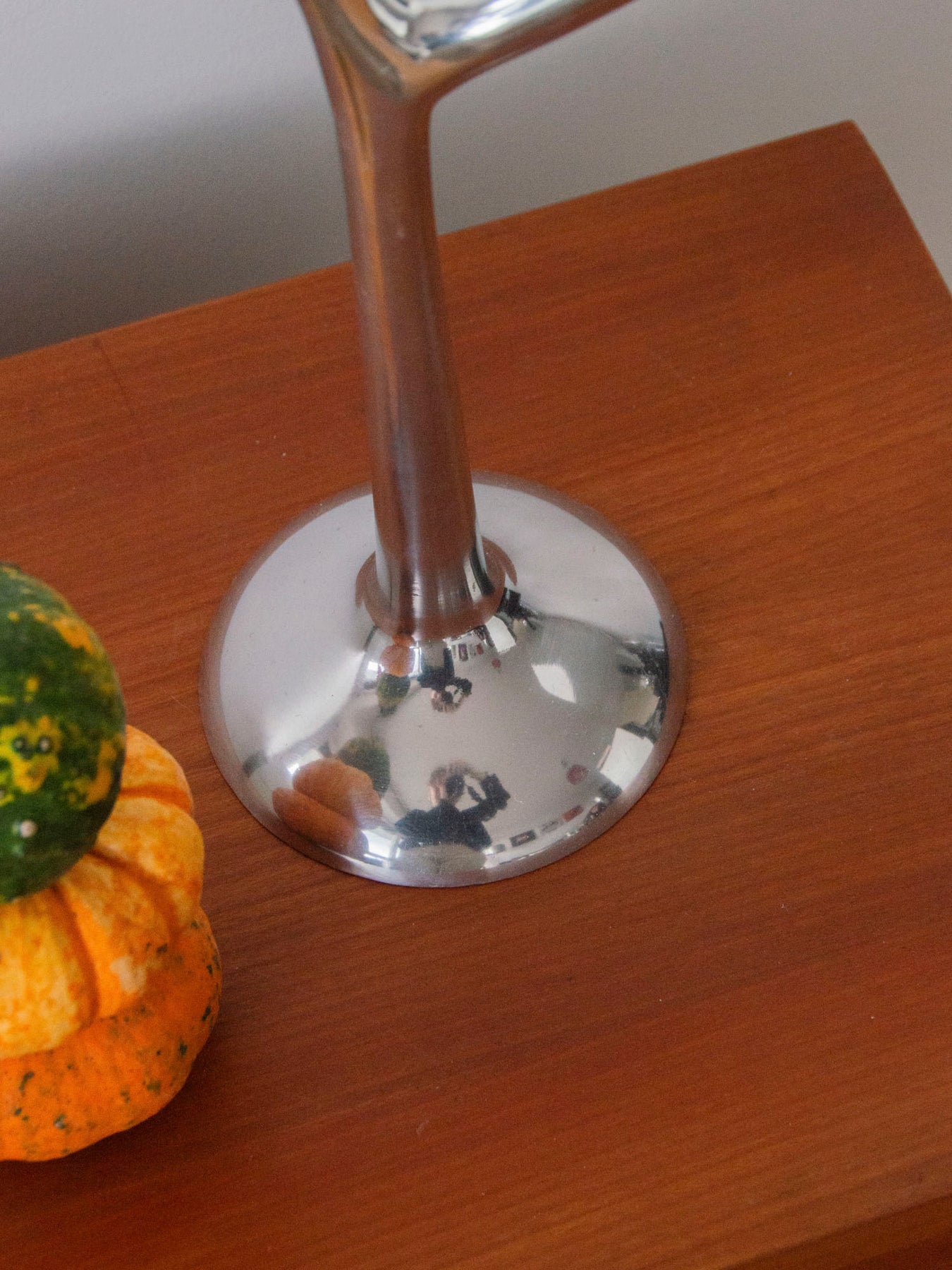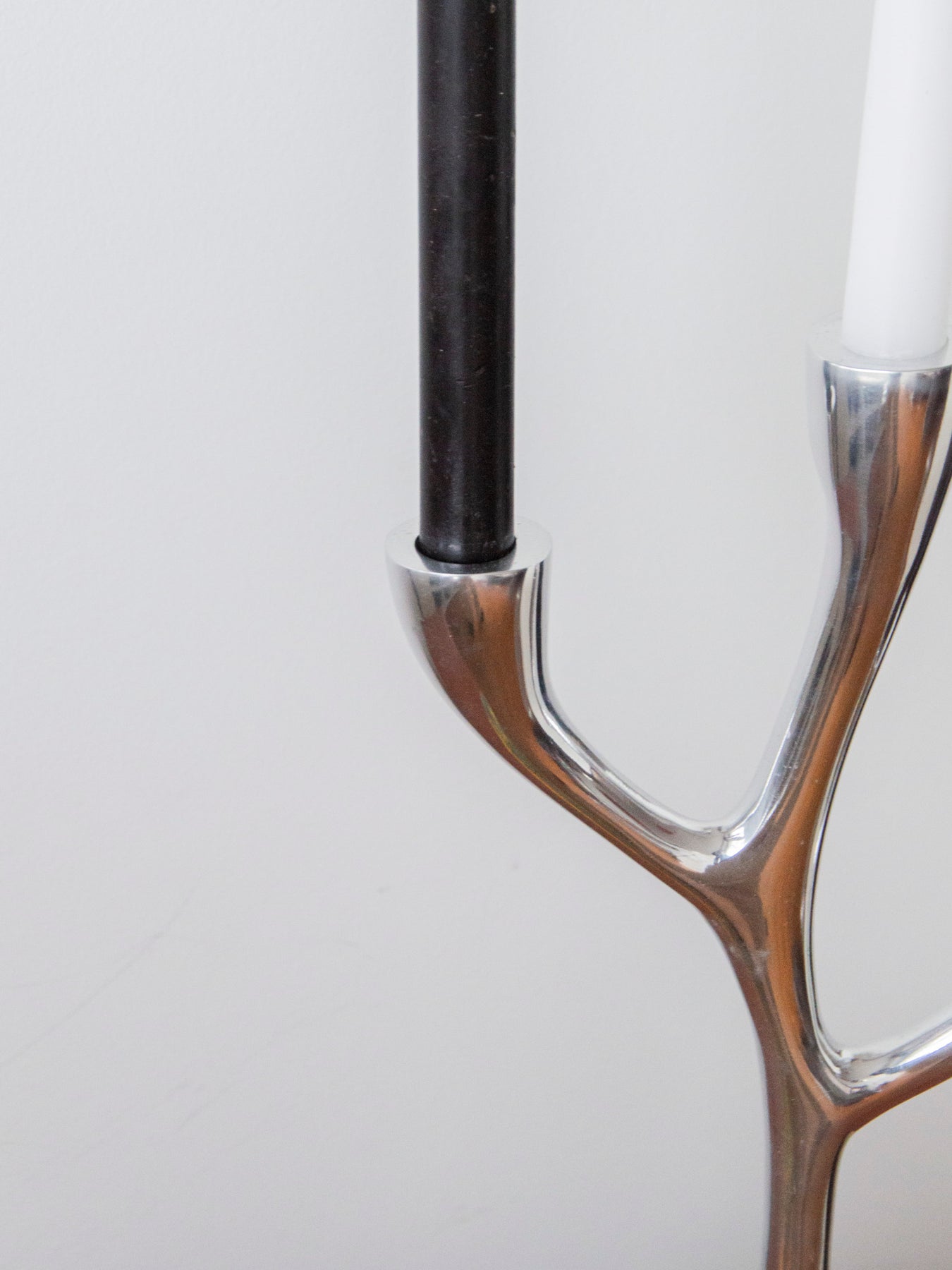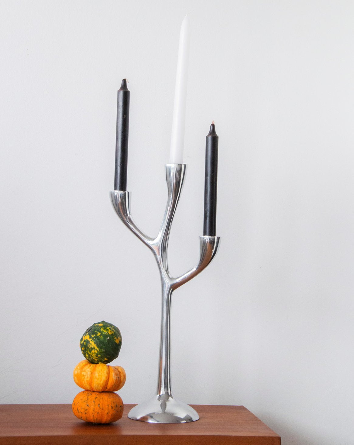 Invitez ce bougeoir moderniste à la silhouette organique en fonte d'aluminium dans votre intérieur, qui se lit comme une petite sculpture design; ses courbes apportent une présence artistique et contemporaine. Conçu pour accueillir trois bougies fines, il trouve sa place sur une table, une console ou une étagère pour composer une ambiance douce et chaleureuse. Sa finition mate met en valeur le métal et s'accorde à des décors sobres ou plus audacieux. Vendu sans bougies et en parfait état.