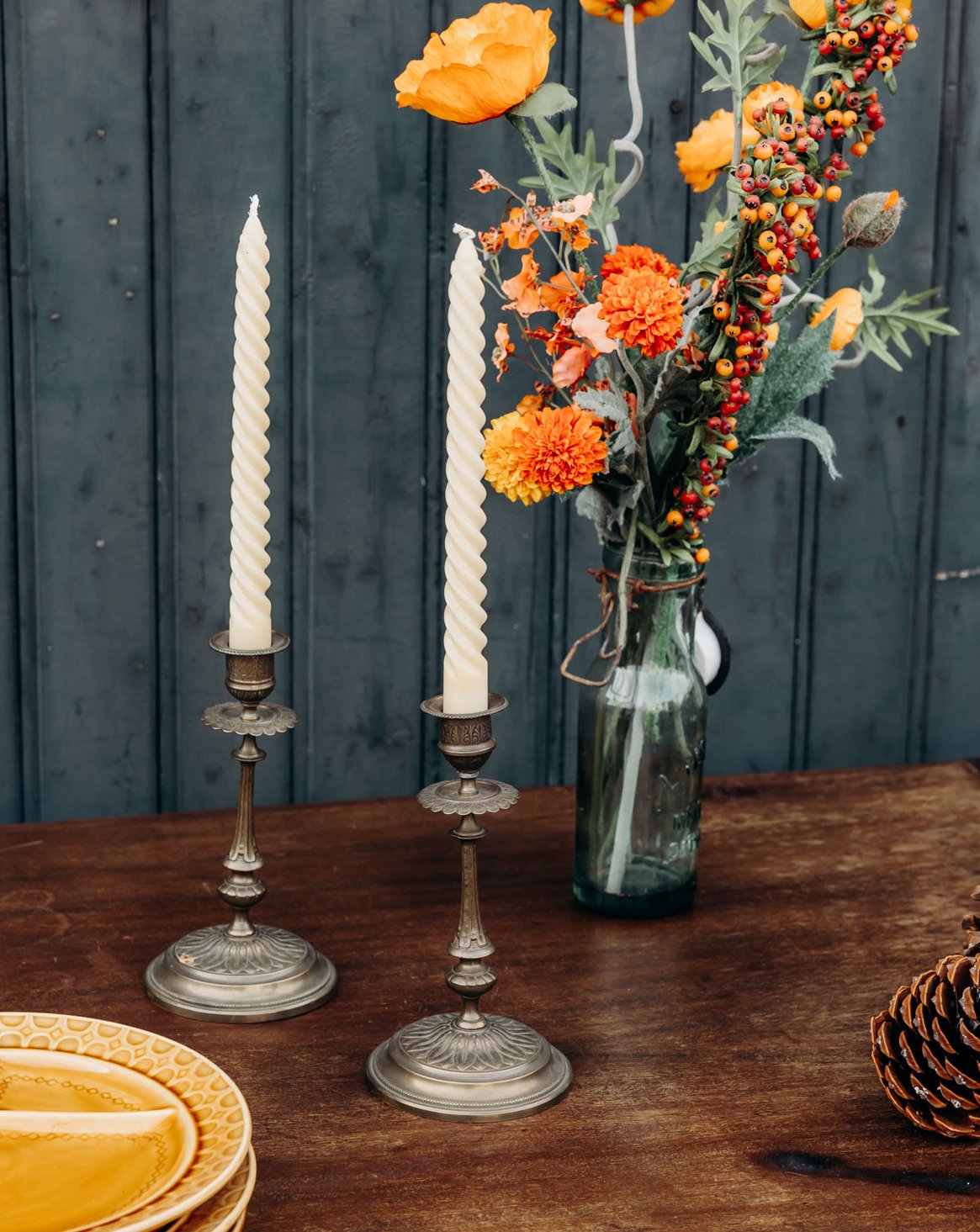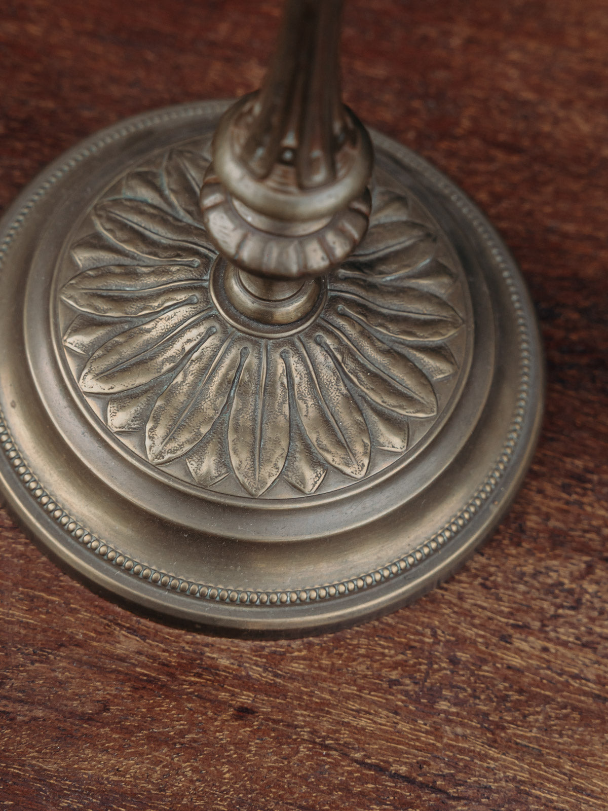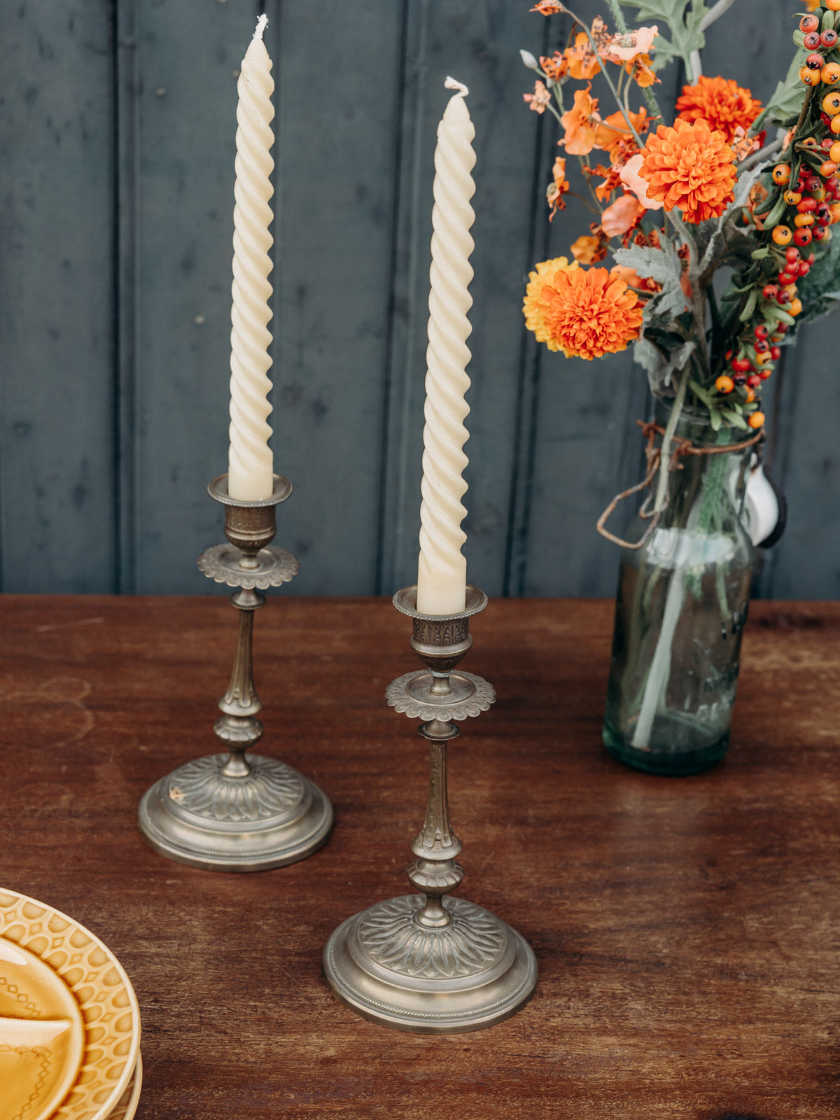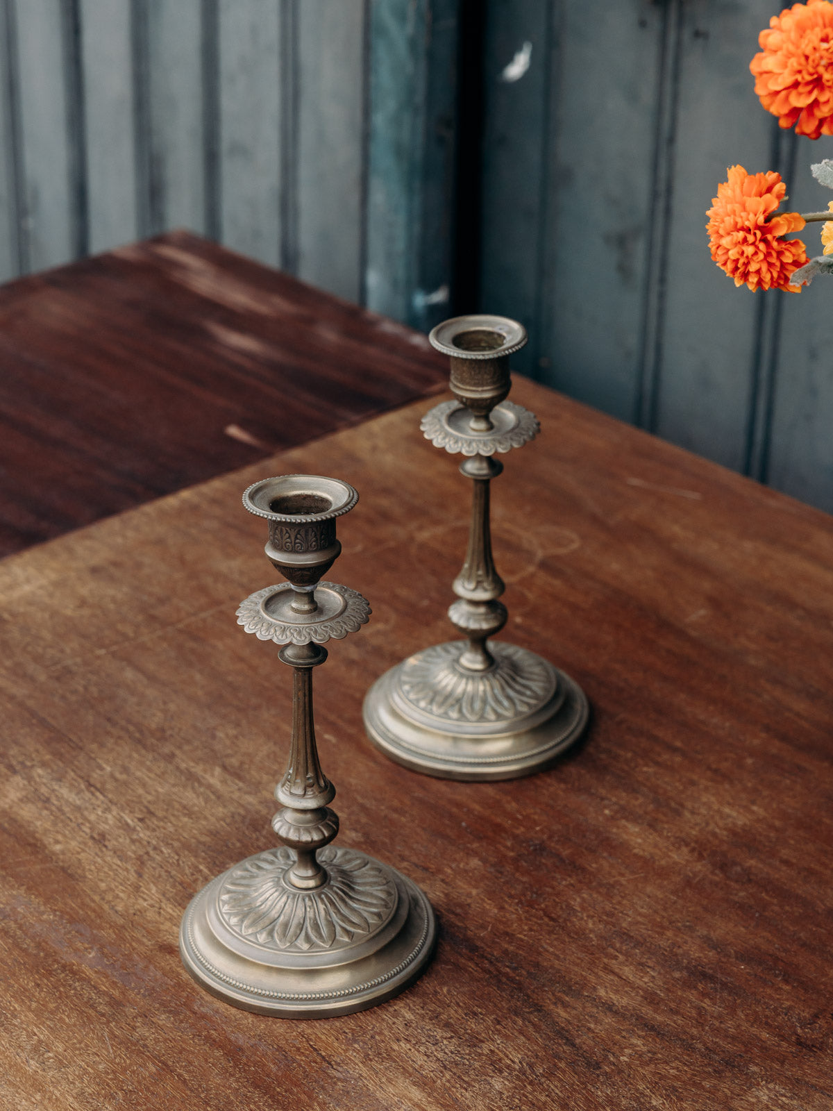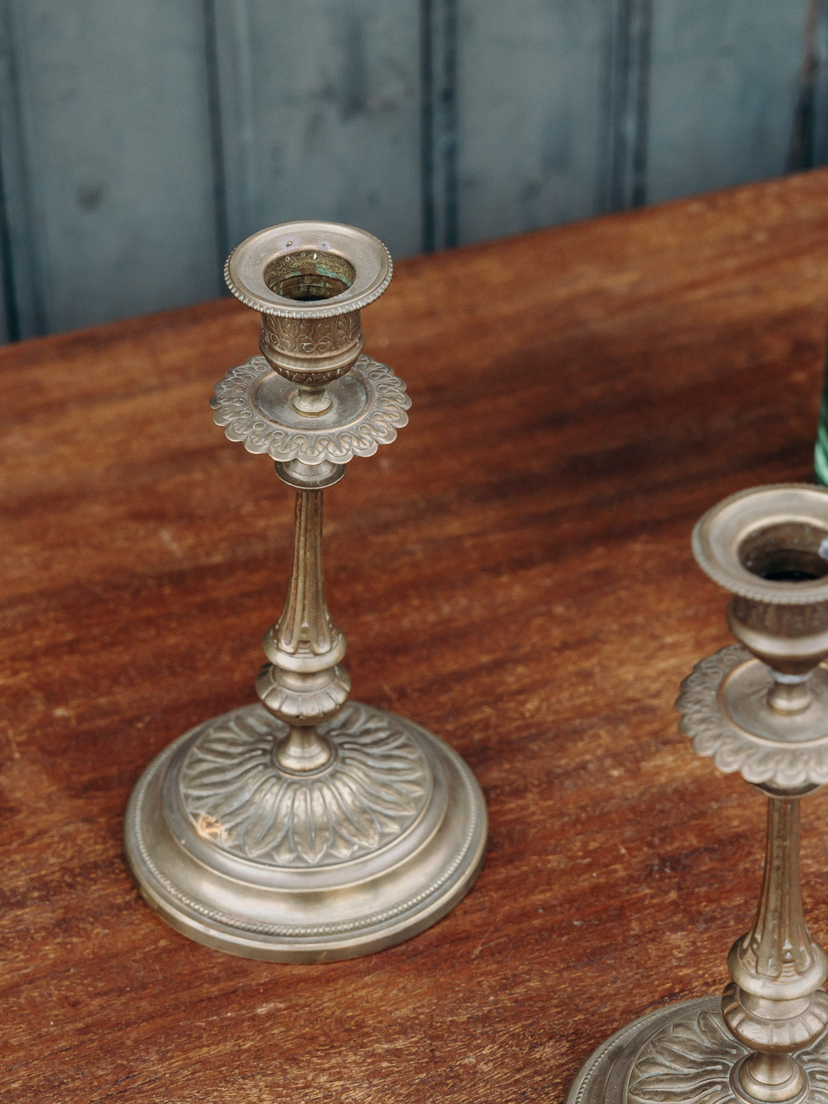 Ajoutez une touche d'élégance discrète à vos tables avec cette paire de bougeoirs en laiton au socle rond, conçue pour accueillir des bougies fines et diffuser une lumière chaleureuse. Les lignes équilibrées et la proportion élancée garantissent une belle présence sans encombrer l'espace, tandis que la matière patinée apporte une chaleur subtile à votre décor. Idéals sur une table de dîner, une console ou une cheminée, ils sont vendus sans bougies.