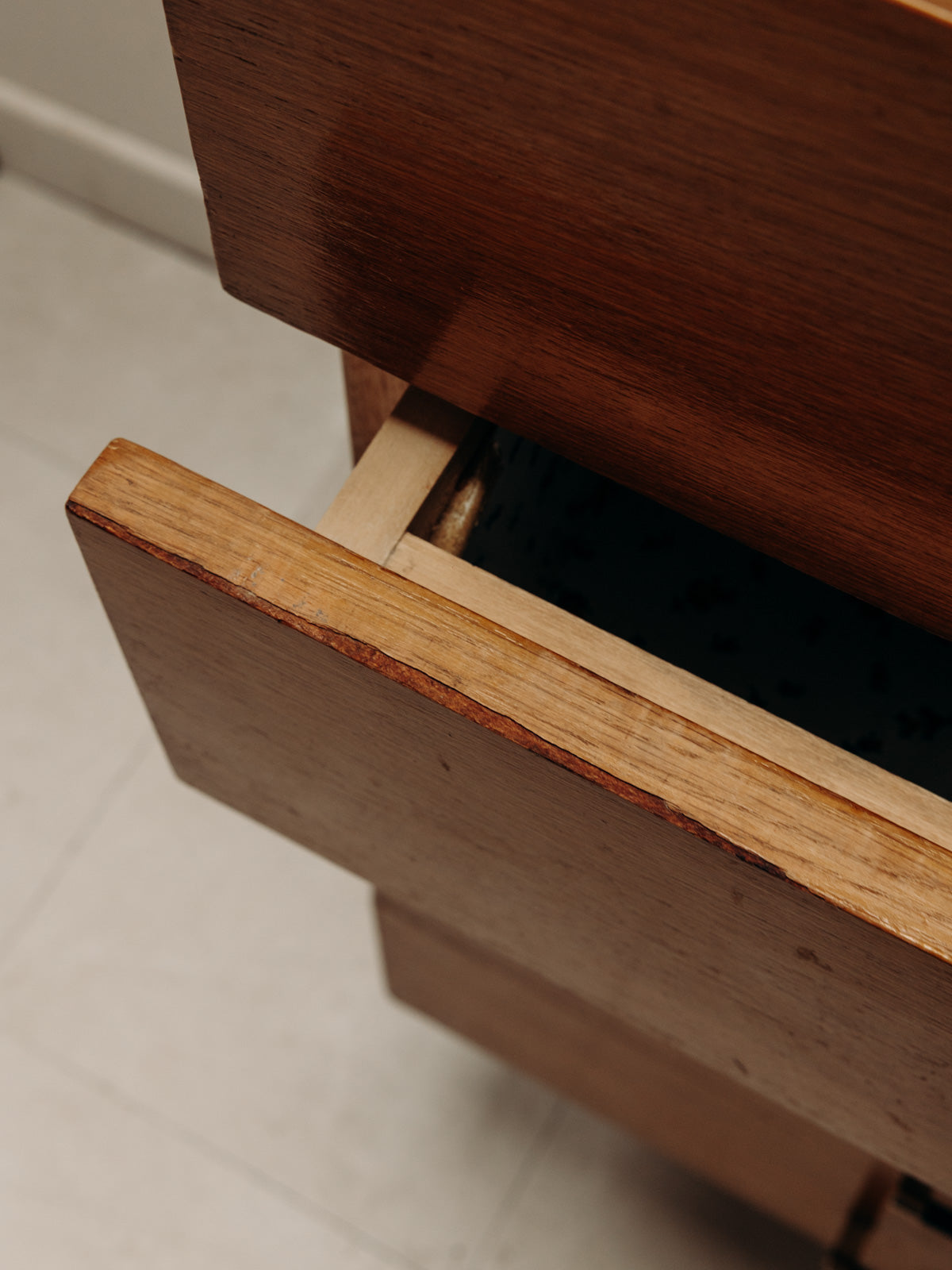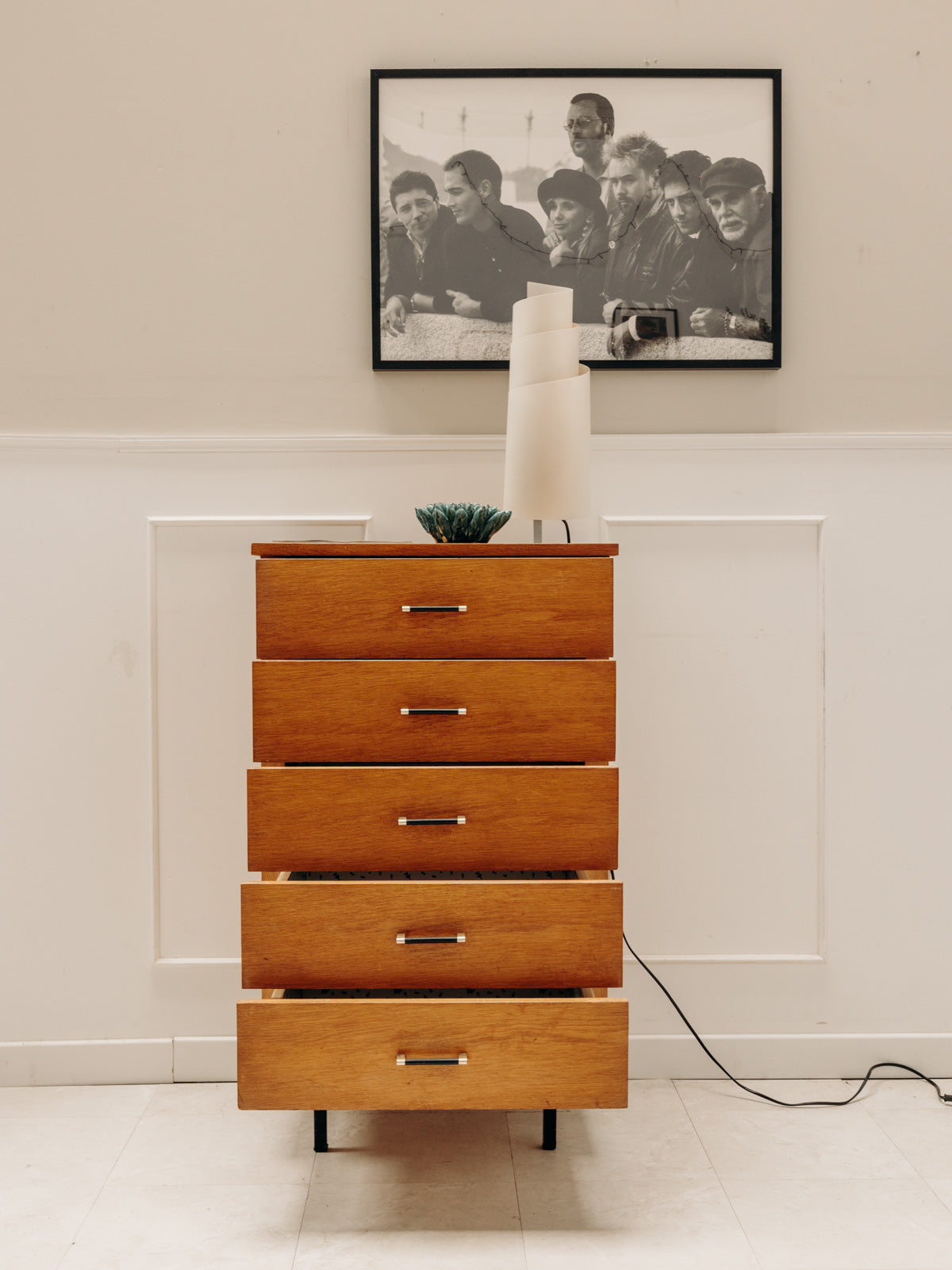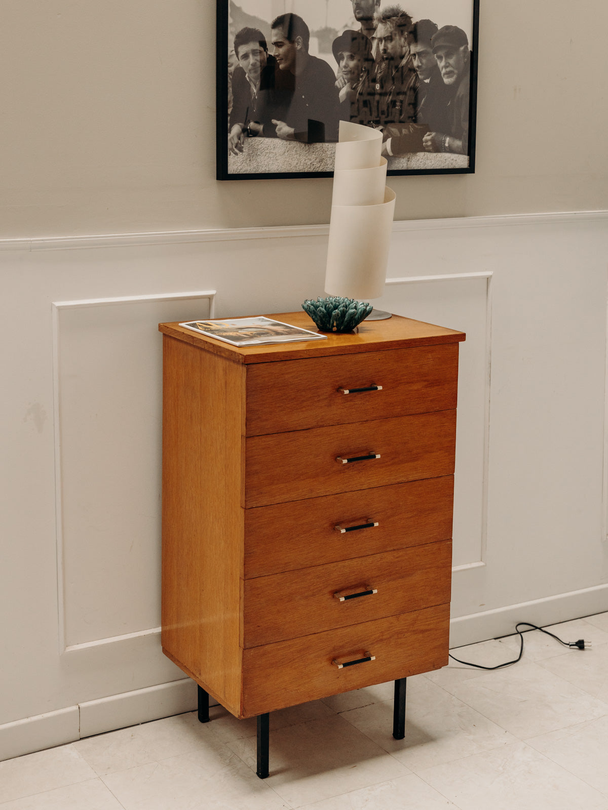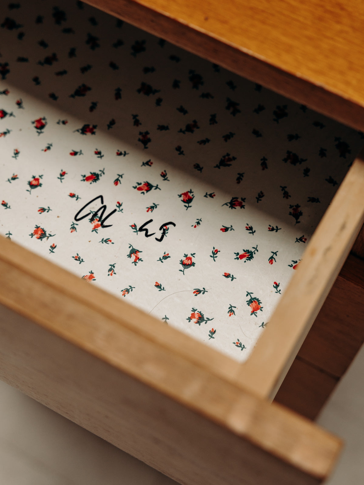 Découvrez ce semainier en bois clair posé sur pieds métalliques noirs, au profil simple et délicat qui s'intègre facilement dans une chambre ou une entrée en format compact. Poignées noires et dorées apportent une note sobre et raffinée, tandis que l'intérieur des tiroirs, tapissé d'un papier peint fleuri, révèle une touche inattendue et poétique. Pratique pour le rangement de petits vêtements et accessoires, les tiroirs peuvent se montrer un peu durs à coulisser en fin de course. Quelques rayures et écorchures témoignent d'une histoire vécue. Légères traces du temps qui participent à son charme.