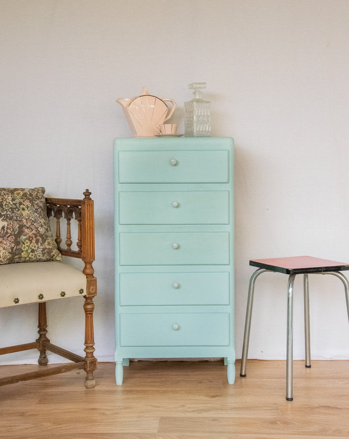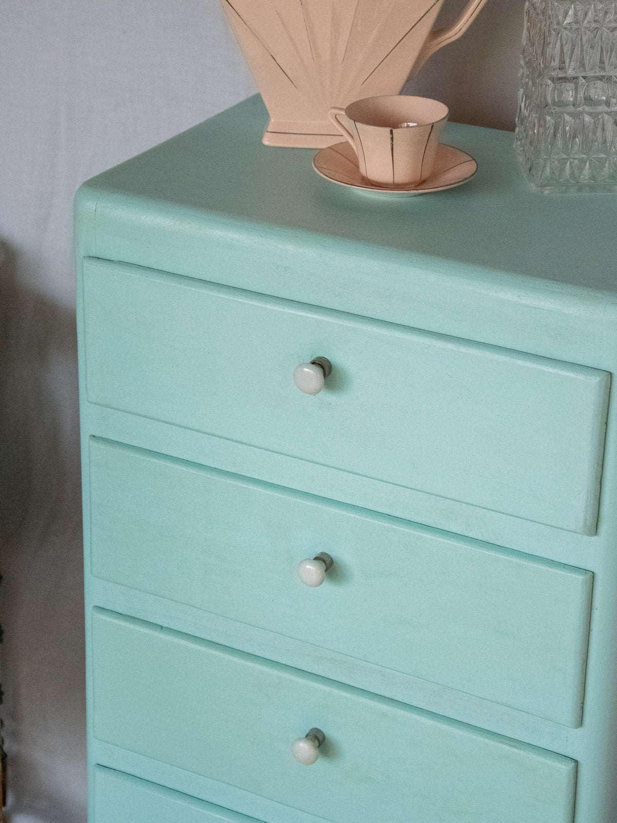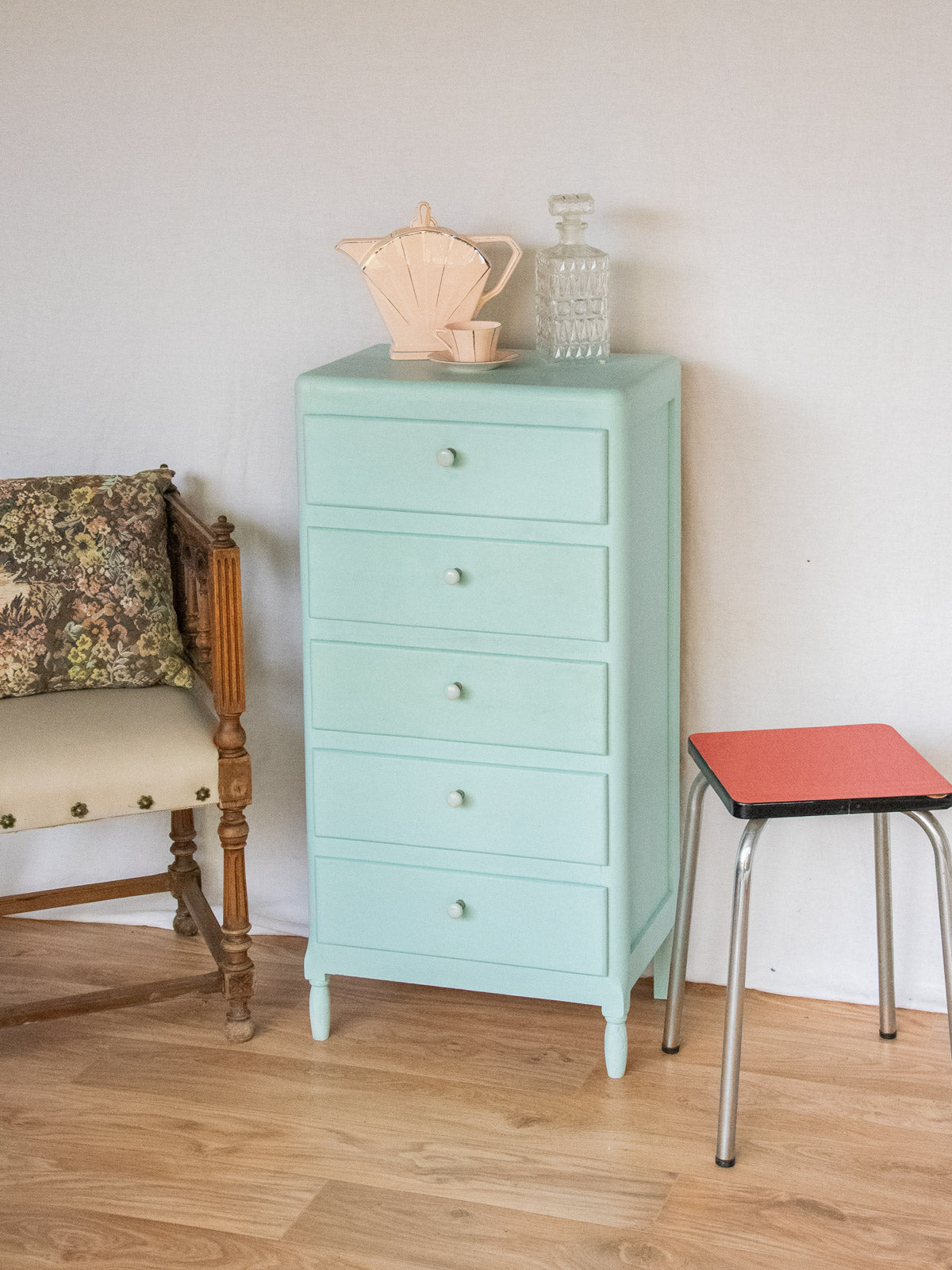 Sublimez votre intérieur avec ce chiffonnier entièrement refait et soigneusement traité, peint d'un bleu délicat qui révèle une finition patinée et contemporaine. Ses proportions compactes et ses tiroirs généreux en font un meuble de rangement pratique pour une chambre, une entrée ou un coin salon, apportant structure sans écraser l'espace. Les boutons en porcelaine ajoutent une note raffinée et tactile, invitant à une atmosphère chaleureuse et apaisée. Traces du temps passé.