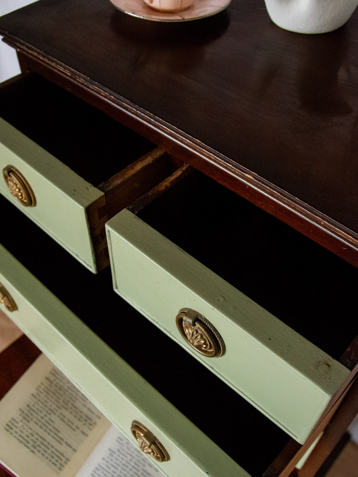 Adoptez ce chiffonnier - secrétaire anglais, entièrement retapé pour retrouver une élégance sobre et pratique. Sa silhouette haute dévoile sept tiroirs de rangement et un plateau secrétaire révélant un espace d'écriture discret, idéal pour un coin bureau ou une chambre raffinée. Les tiroirs repeints en vert apportent une touche colorée maîtrisée, ponctuée de poignées doubles en laiton arrondies qui soulignent son caractère ancien. Son format étroit s'intègre facilement dans les intérieurs citadins.