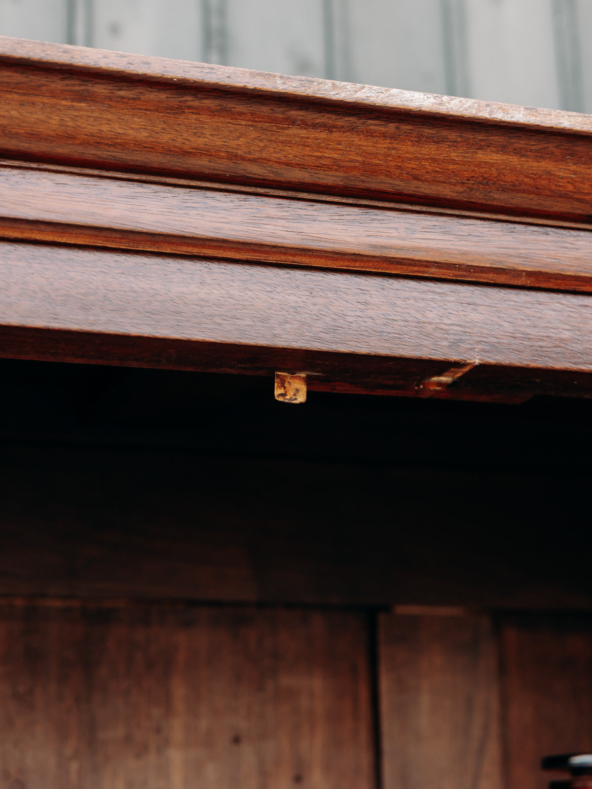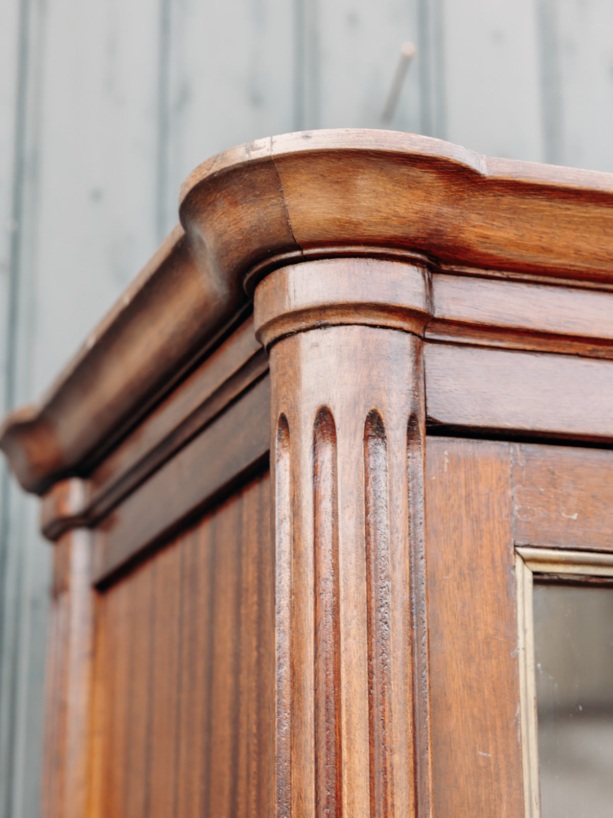 Sublimez votre intérieur avec cette grande vitrine en bois foncé, élégamment travaillée et posée sur des pieds tournés qui lui confèrent un style classique et raffiné; ses trois étagères offrent une belle capacité d'exposition pour vaisselle, livres ou objets décoratifs, tandis que les jolis détails sculptés apportent du caractère sans alourdir l'ensemble. Idéale dans une salle à manger ou une entrée, elle crée une ambiance chaleureuse et structurée, parfaite pour mettre en valeur vos collections. Légères usures présentes.