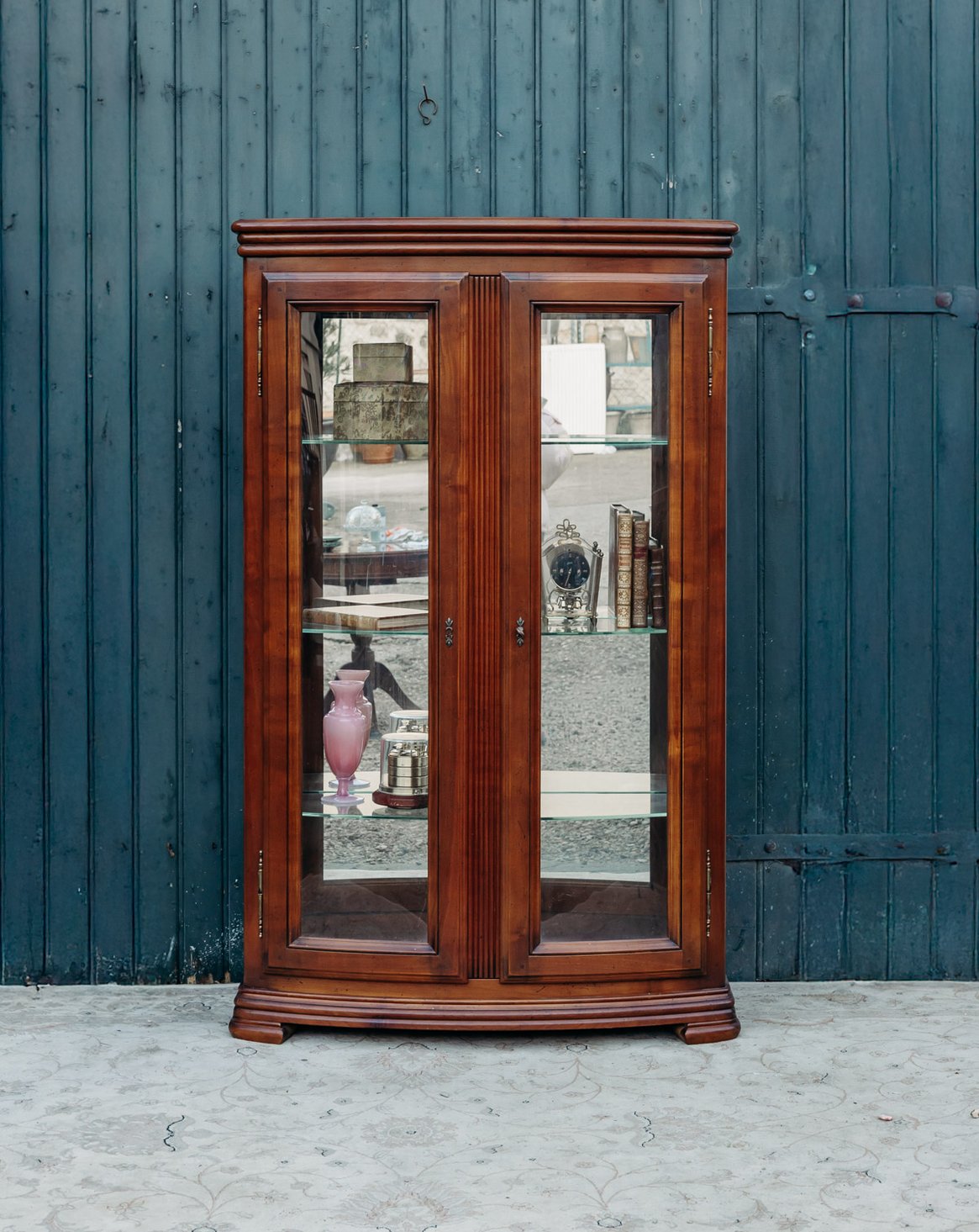 Découvrez cette grande vitrine en bois foncé, un argentier élégant sublimé par de jolis détails sculptés et de petits pieds qui lui donnent une silhouette élancée. Sa porte se verrouille grâce à une clé fournie, et les trois étagères en verre incurvée offrent une mise en scène raffinée pour vaisselle, livres ou objets précieux ; les étagères réglables permettent d'adapter la présentation selon vos volumes, créant une ambiance sobre et chaleureuse dans le salon ou la salle à manger.