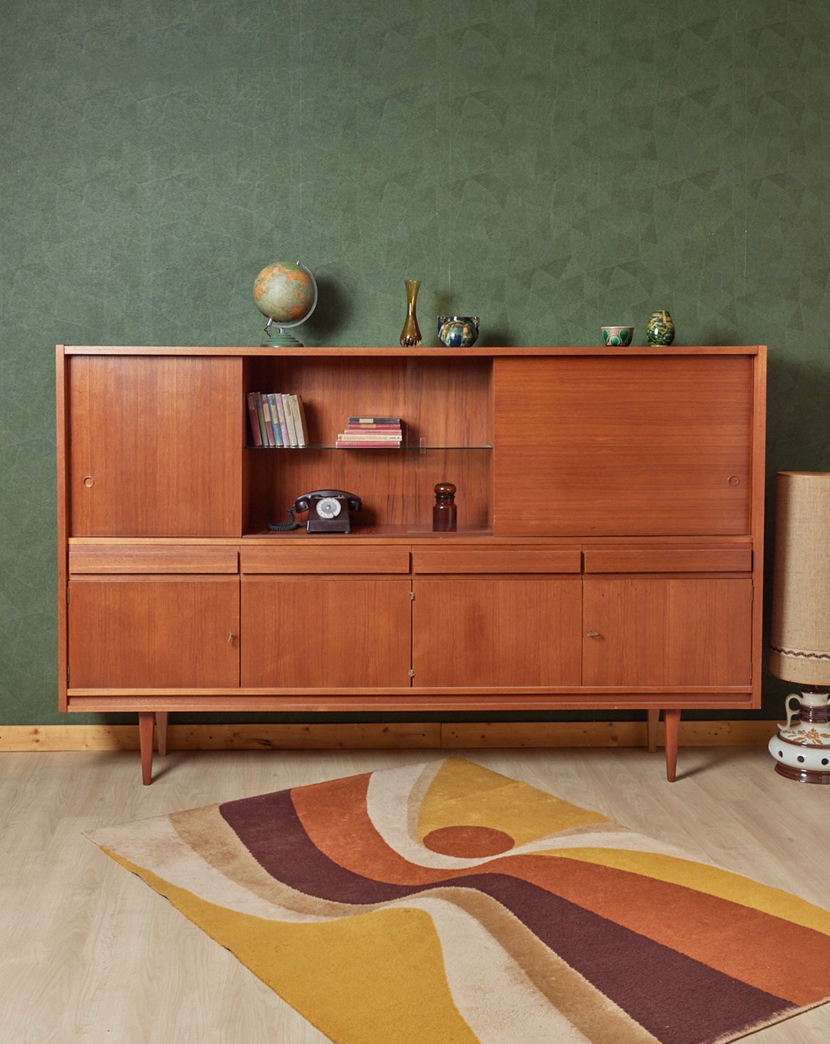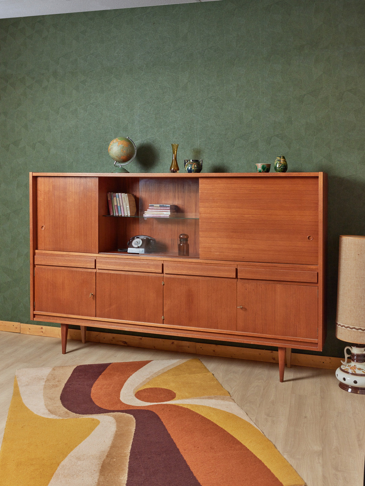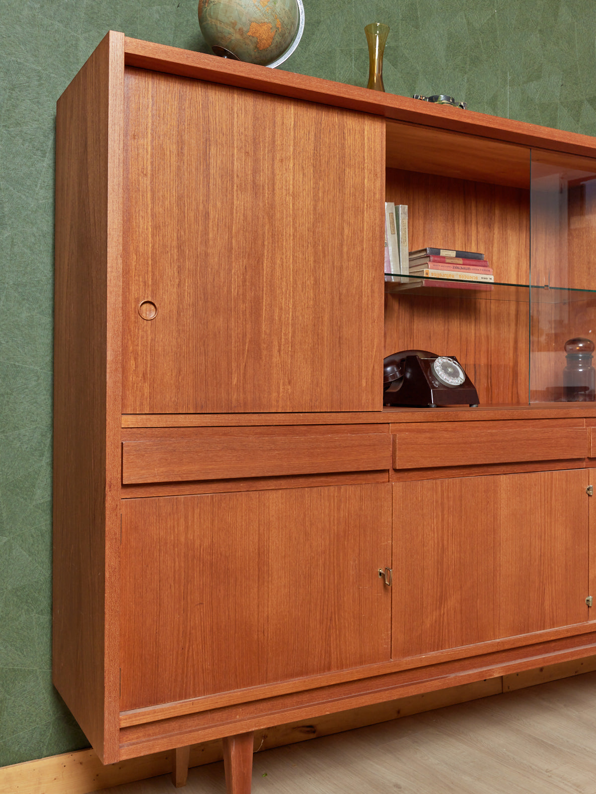 Sublimez votre salon avec cette vitrine living en teck des années 60, aux lignes sobres et chaleureuses. Sa structure en bois révèle une patine douce tandis que la vitrine en verre coulissante met en valeur objets et vaisselle, accompagnée de quatre tiroirs et quatre portes offrant une capacité de rangement bien pensée. Les deux portes coulissantes en bois apportent un rythme graphique et des clés d'origine attestent de son authenticité. Parfaite pour instiller une ambiance vintage élégante et accueillante.
