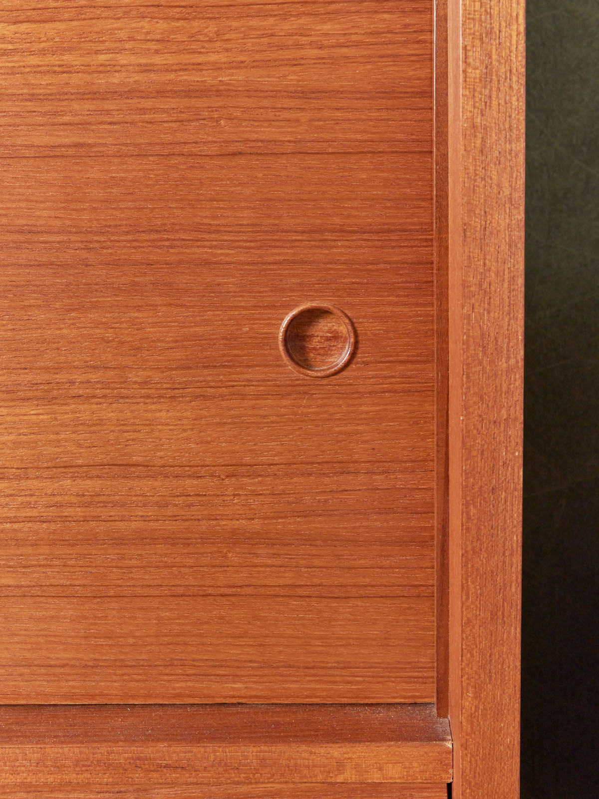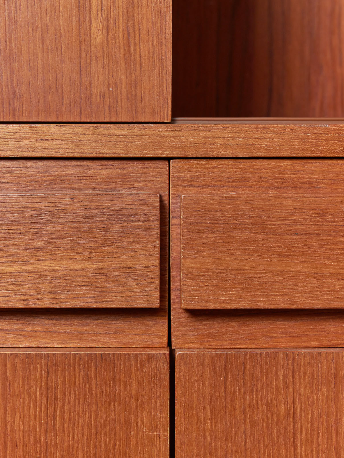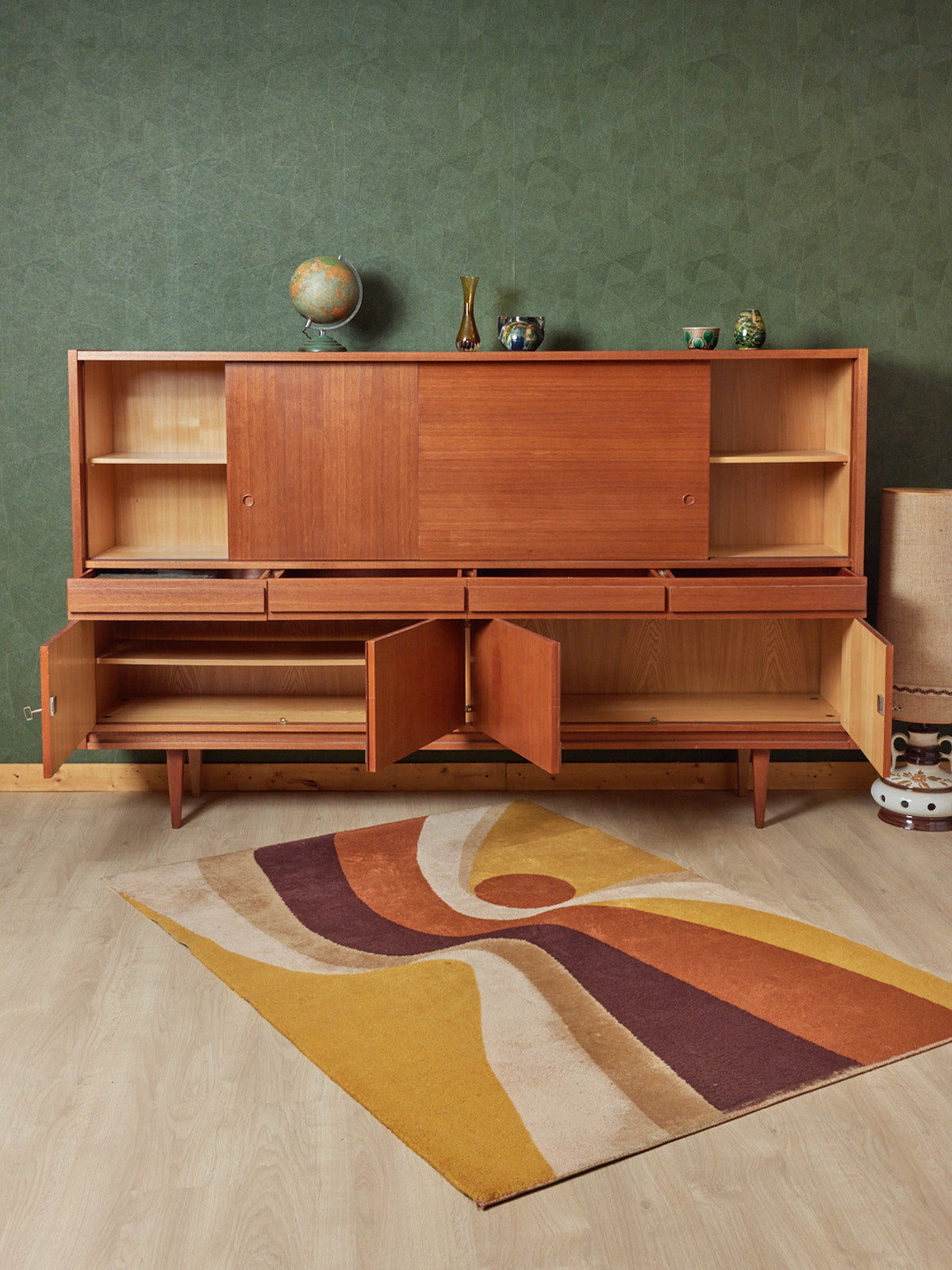 Sublimez votre salon avec cette vitrine living en teck des années 60, aux lignes sobres et chaleureuses. Sa structure en bois révèle une patine douce tandis que la vitrine en verre coulissante met en valeur objets et vaisselle, accompagnée de quatre tiroirs et quatre portes offrant une capacité de rangement bien pensée. Les deux portes coulissantes en bois apportent un rythme graphique et des clés d'origine attestent de son authenticité. Parfaite pour instiller une ambiance vintage élégante et accueillante.