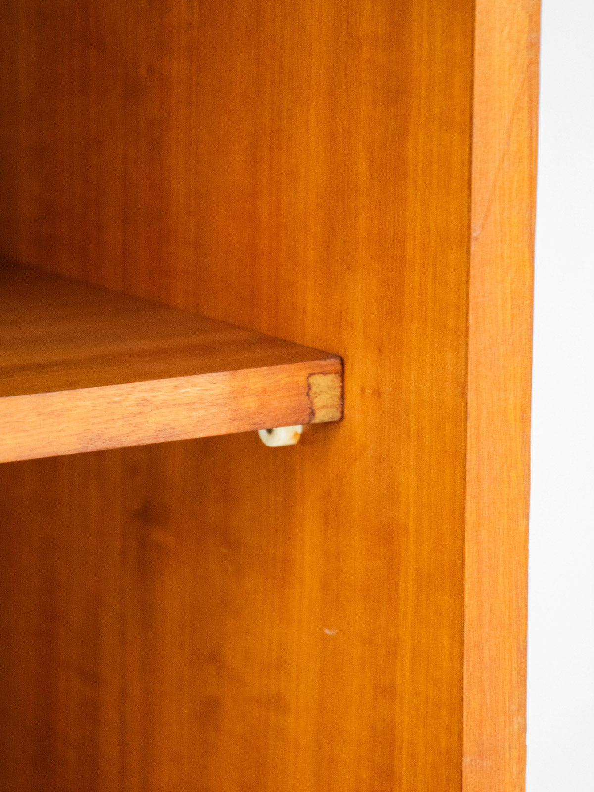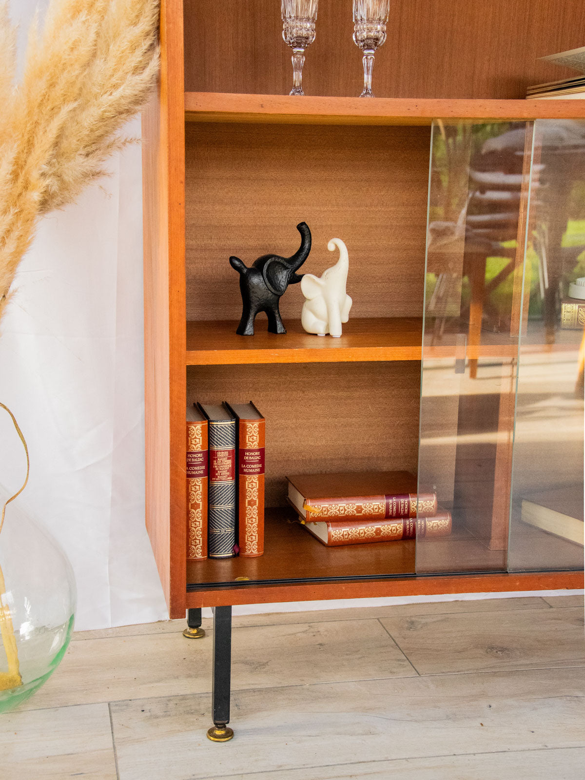 Idéale pour exposer vaisselle, livres ou objets décoratifs. Ses proportions équilibrées apportent de la présence sans alourdir la pièce, tandis que le mariage du bois et du métal crée une ambiance chaleureuse et contemporaine; les vitres sont impeccables malgré quelques micro rayures. Quelques marques d'usage présentes telles qu'une tâche dans le vernis du plateau médian et un petit éclat dans l'angle d'une étagère.