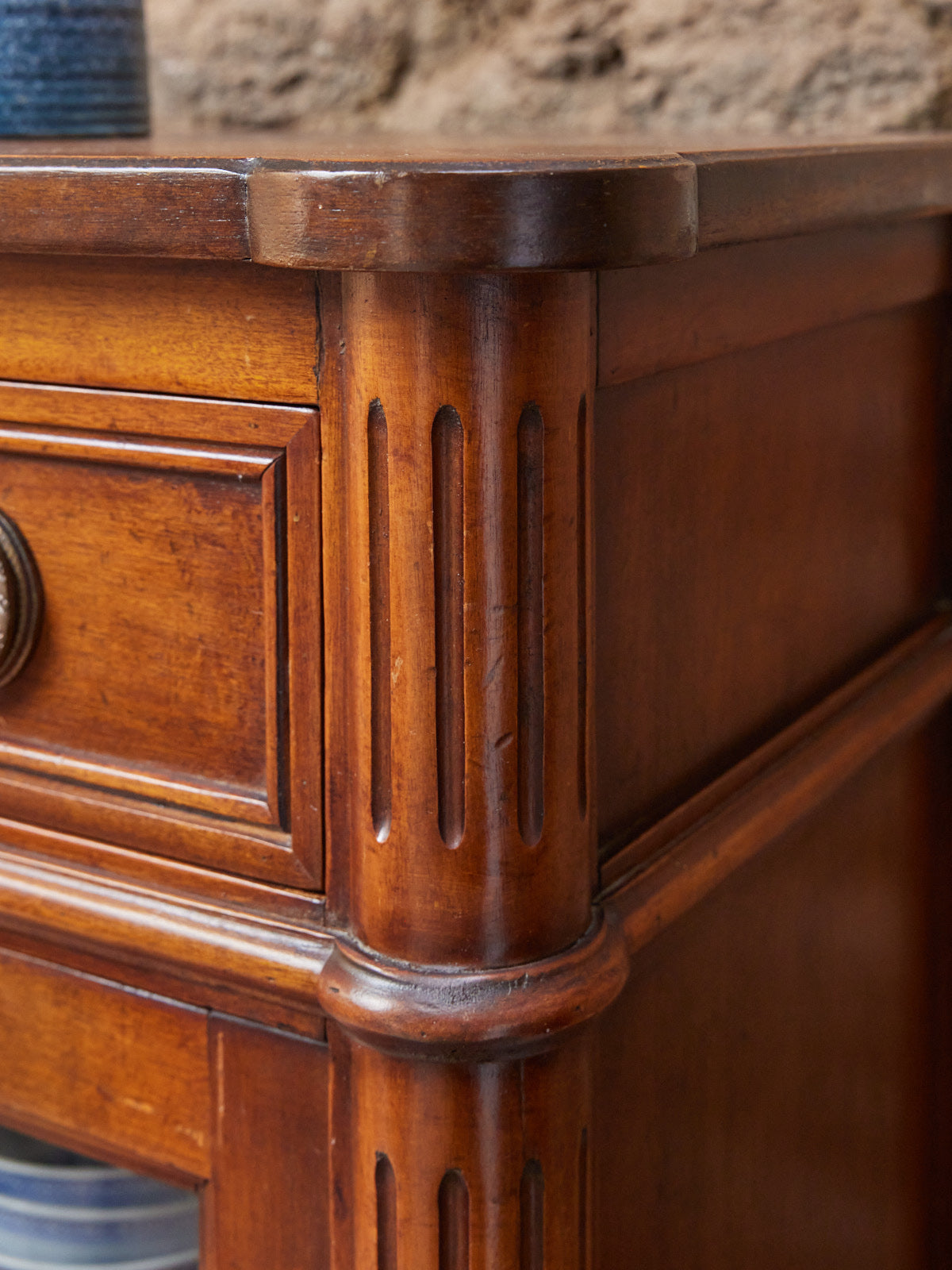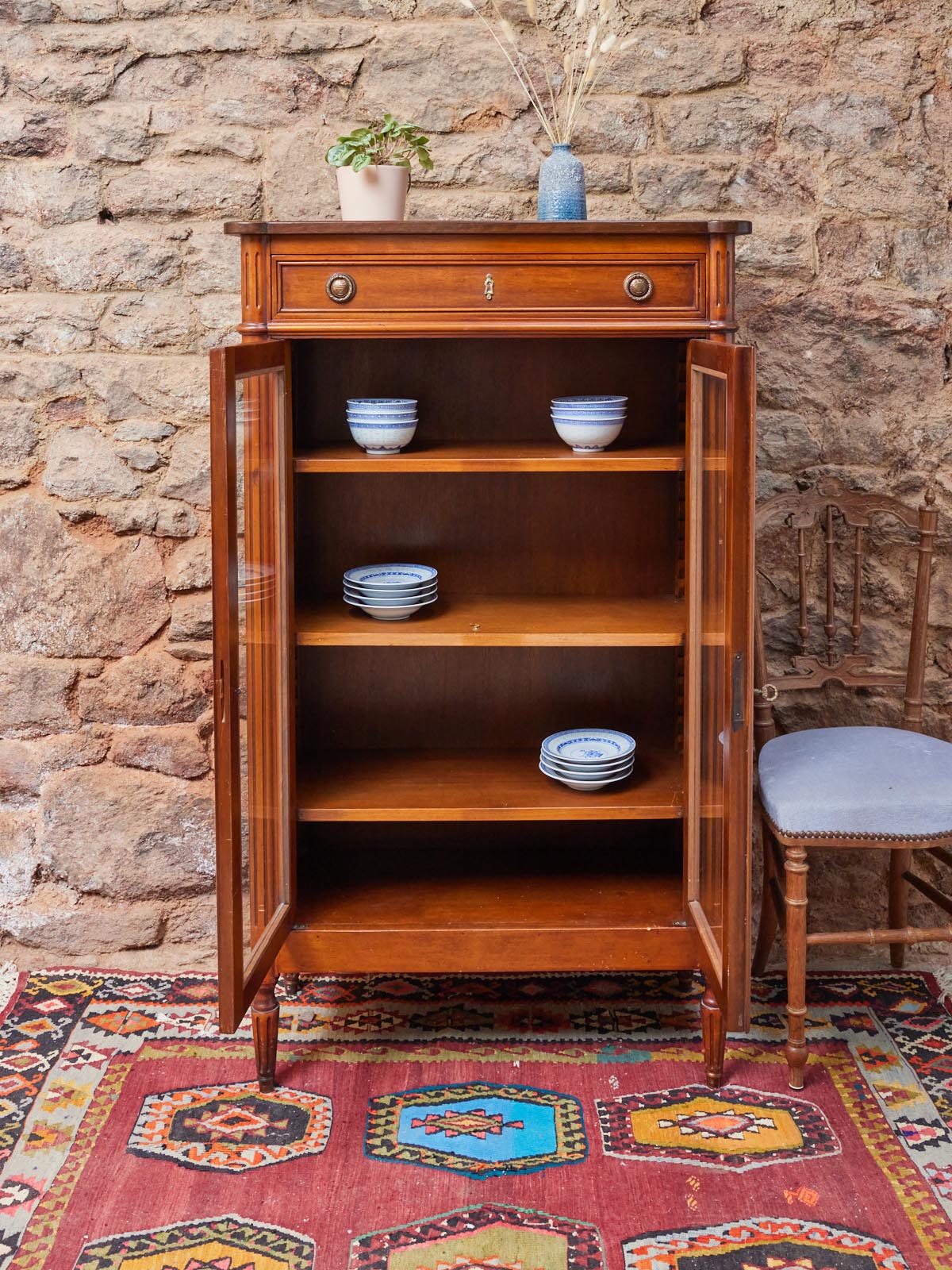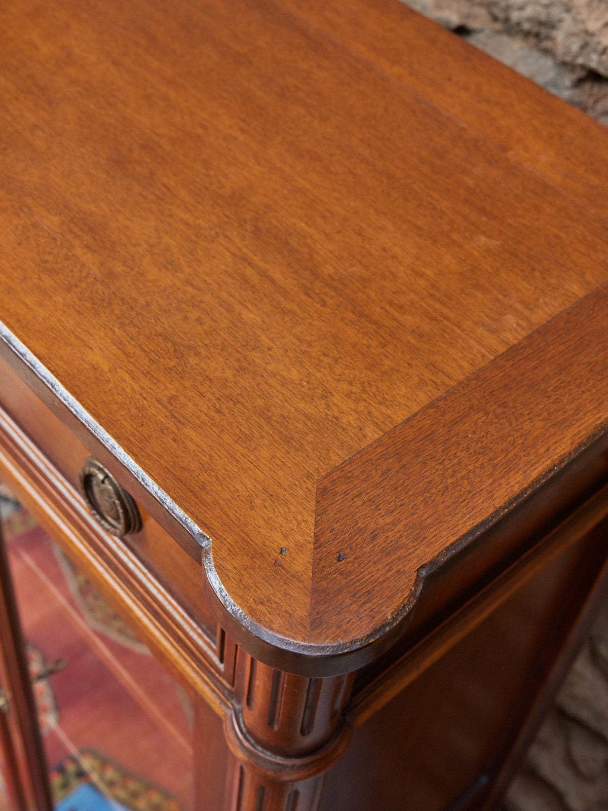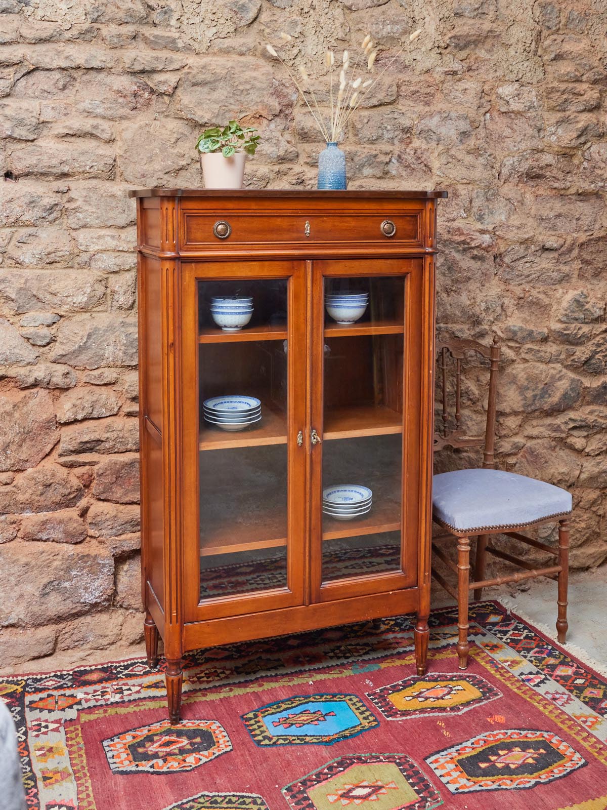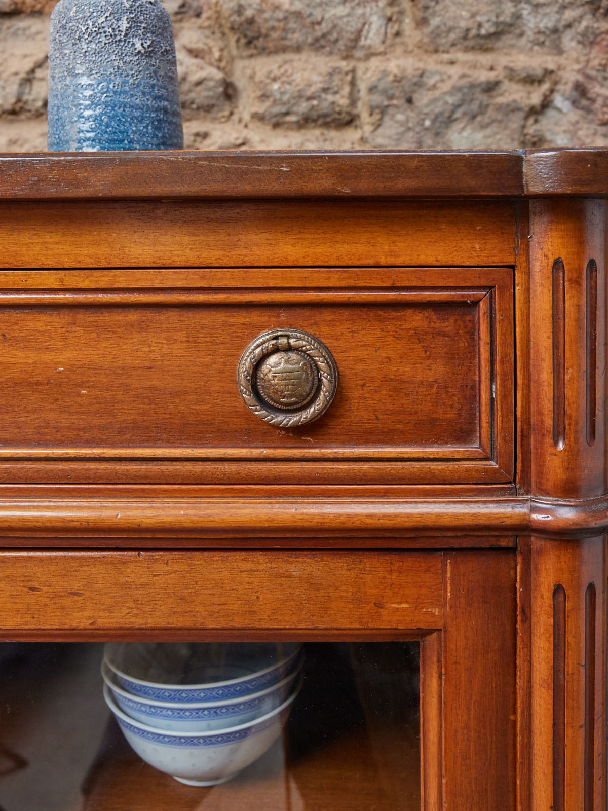 Adoptez cette vitrine style Louis XVI en bois et verre, au vocabulaire néoclassique qui apporte une élégance discrète à votre intérieur. Sa structure en bois met en valeur les pièces exposées derrière les portes vitrées, idéale pour présenter vaisselle, livres ou objets d'art tout en les protégeant de la poussière. Les proportions raffinées et les moulures sobres créent une atmosphère apaisée et conviviale, parfaite pour une salle à manger ou un salon.
