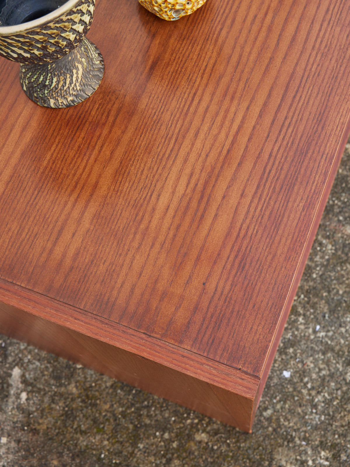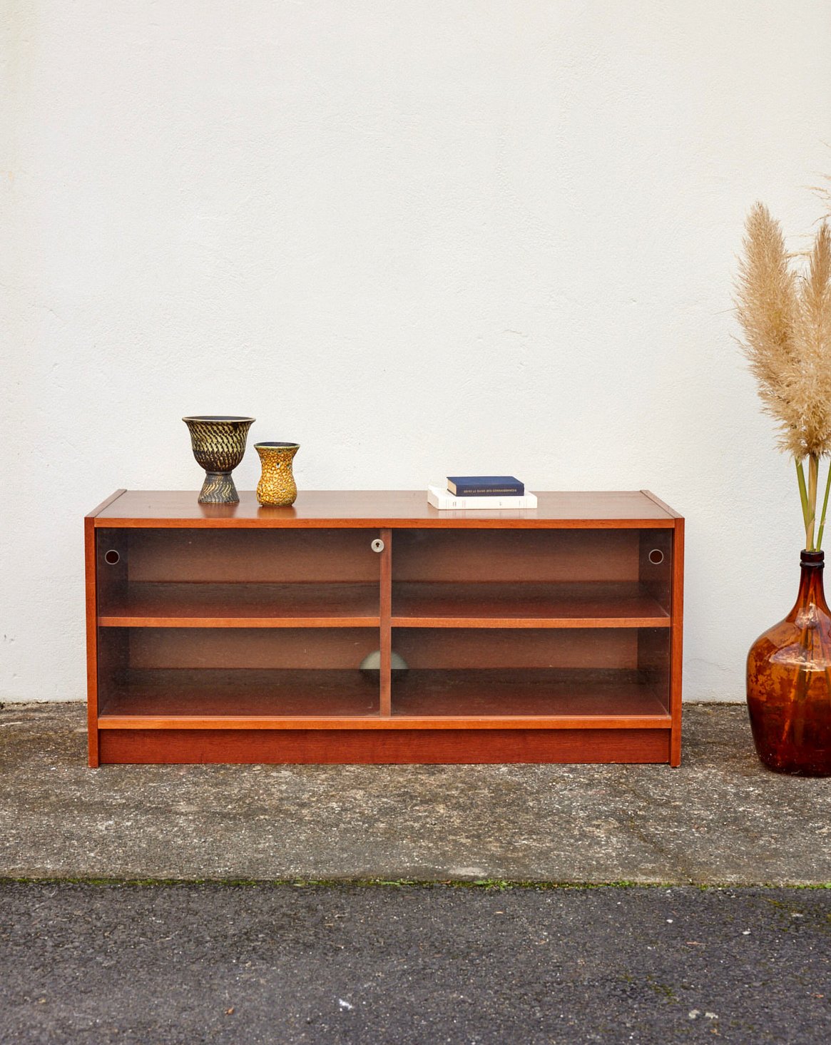 Découvrez ce meuble TV des années 70 en placage de teck, aux lignes épurées et chaleureuses qui apportent une touche rétro-scandinave à votre salon. Ses portes coulissantes en verre révèlent des espaces de rangement bien proportionnés tandis que des trous à l'arrière facilitent le passage des câbles pour une installation élégante et ordonnée. Une petite tache à signaler sur le plateau qui a été revernie.