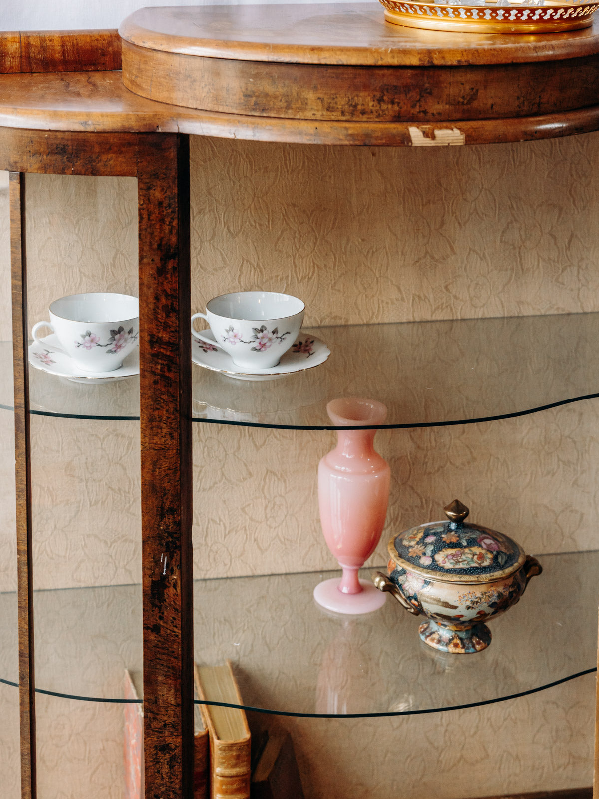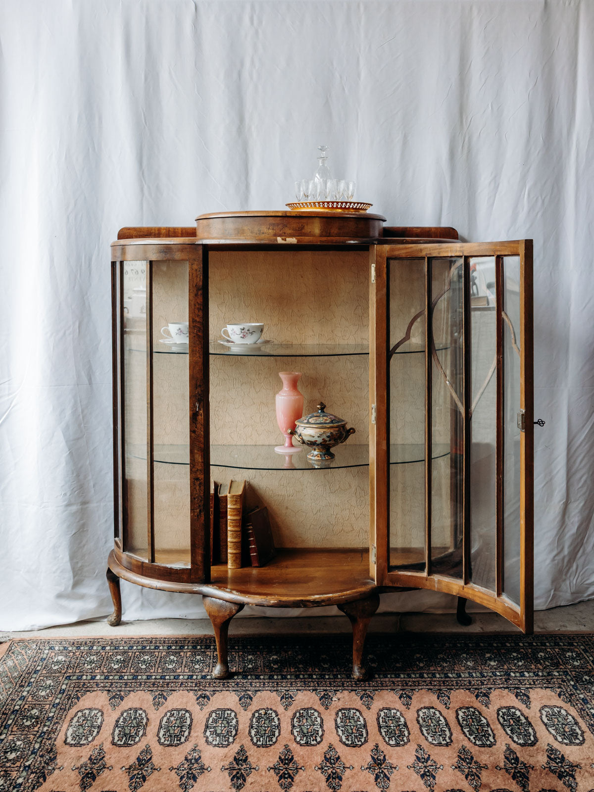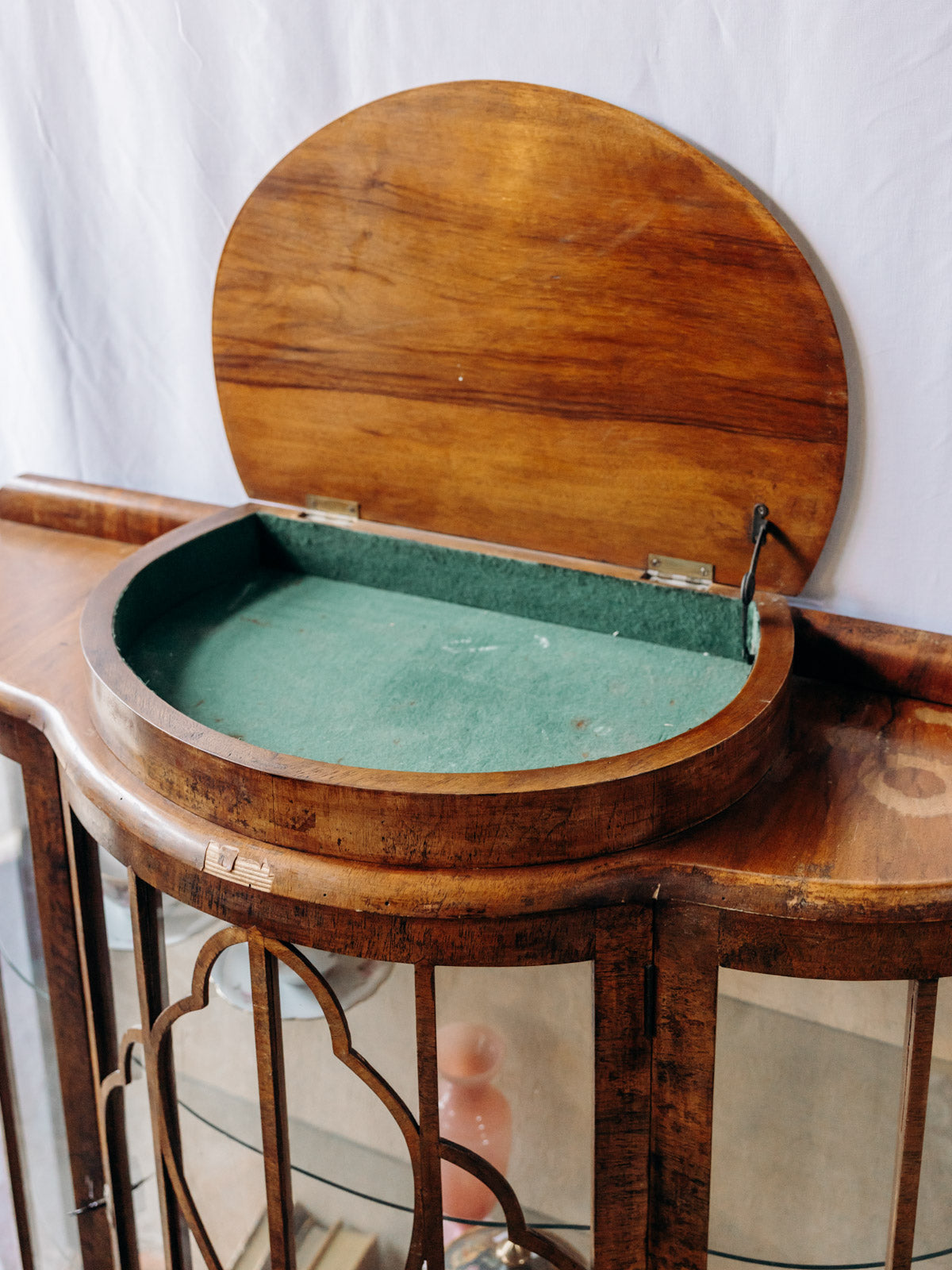 Invitez cette vitrine en bois et verre au design délicat, dotée d'un plateau de jeux rond qui s'ouvre par le dessus sur le plateau supérieur. Ses petits pieds incurvés et ses proportions élancées lui permettent de se glisser dans une entrée ou un coin salon, tandis que ses trois étagères — deux en verre et une en bois — offrent un élégant écrin pour vos objets et collections. Le mariage de la transparence des plateaux et de la chaleur du bois instaure une atmosphère raffinée et conviviale. Petit défaut de placage à l'avant et taches d'eau sur le plateau.