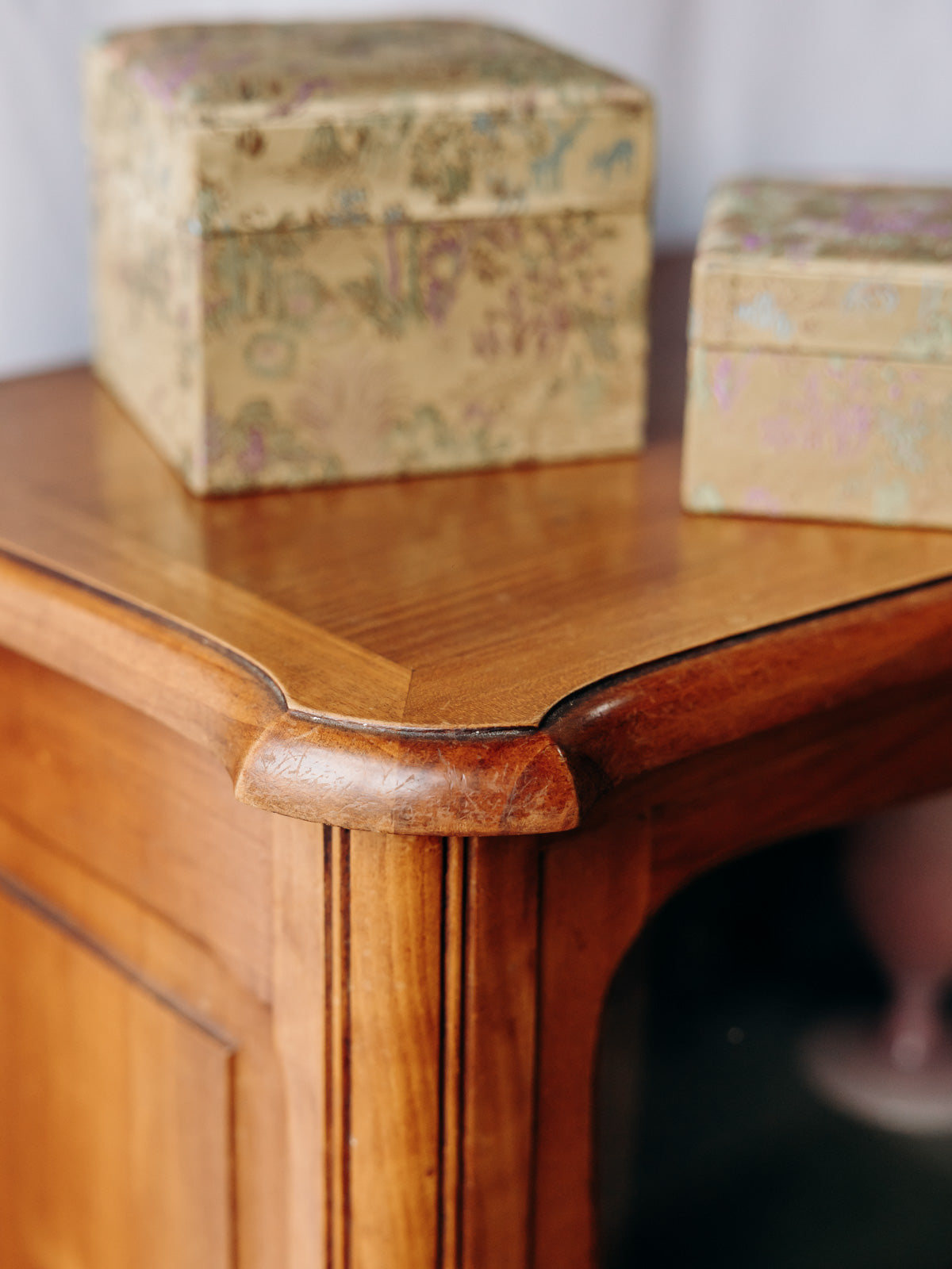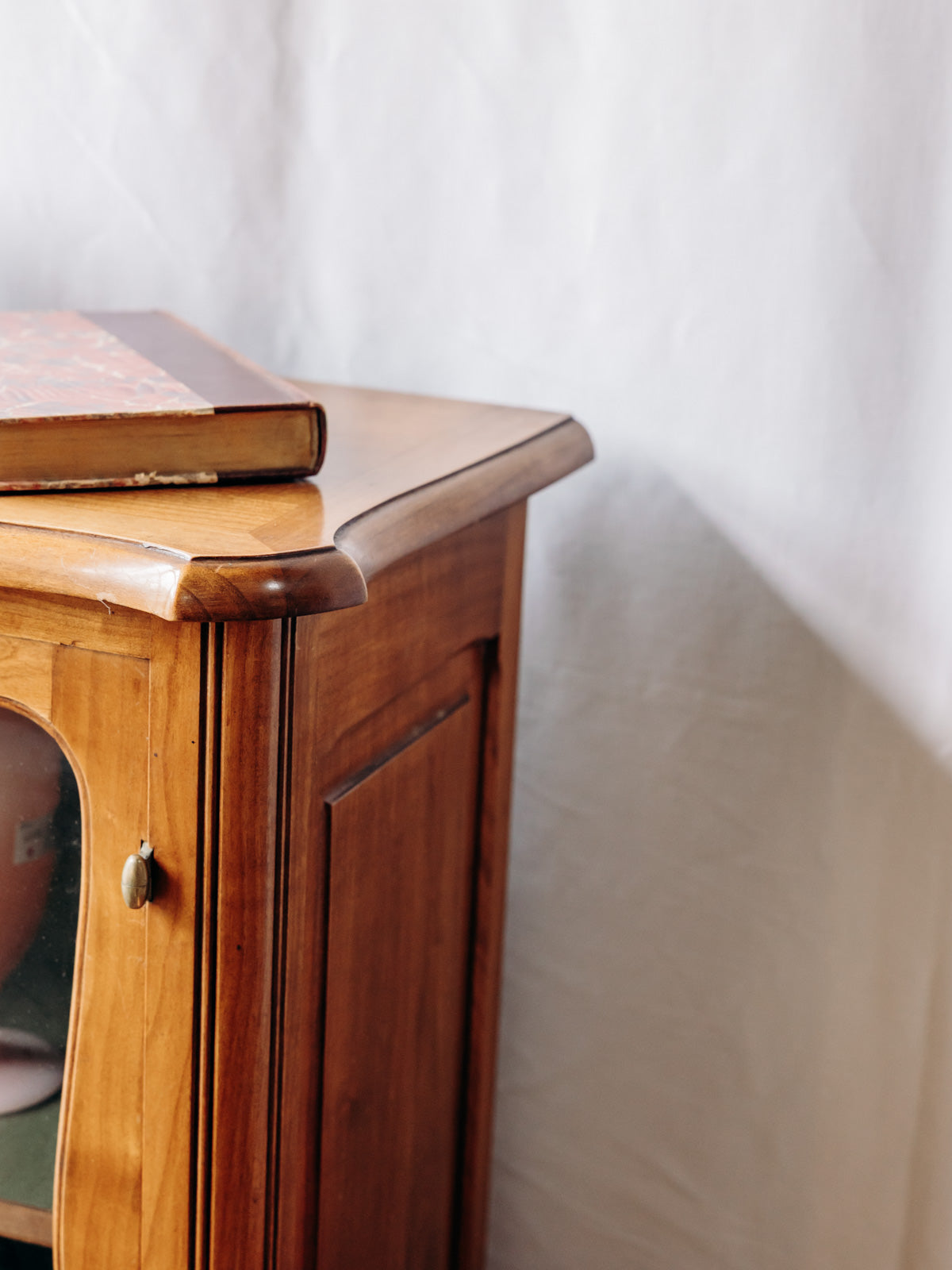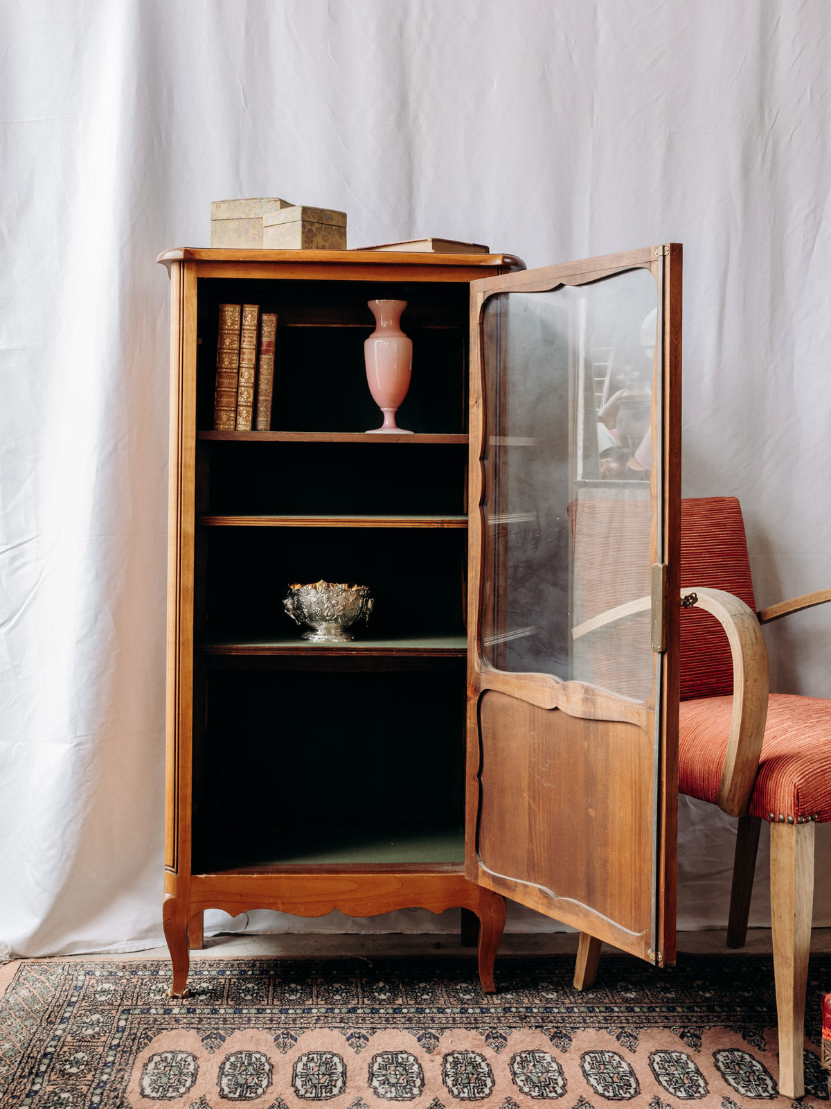 Invitez une vitrine en bois clair au design délicat dans votre intérieur, dont l'intérieur vert apporte une touche de fraîcheur et met en valeur vos objets. Ses pieds incurvés soulignent une silhouette élancée et des proportions compactes qui s'adaptent aux petits espaces, tandis que plusieurs étagères réglables et des plateaux en tissu vert amovibles permettent de moduler rangement et présentation. Une clé assure une fermeture sécurisée, idéale pour préserver vaisselle, livres ou objets de curiosité dans une ambiance chaleureuse et élégante.