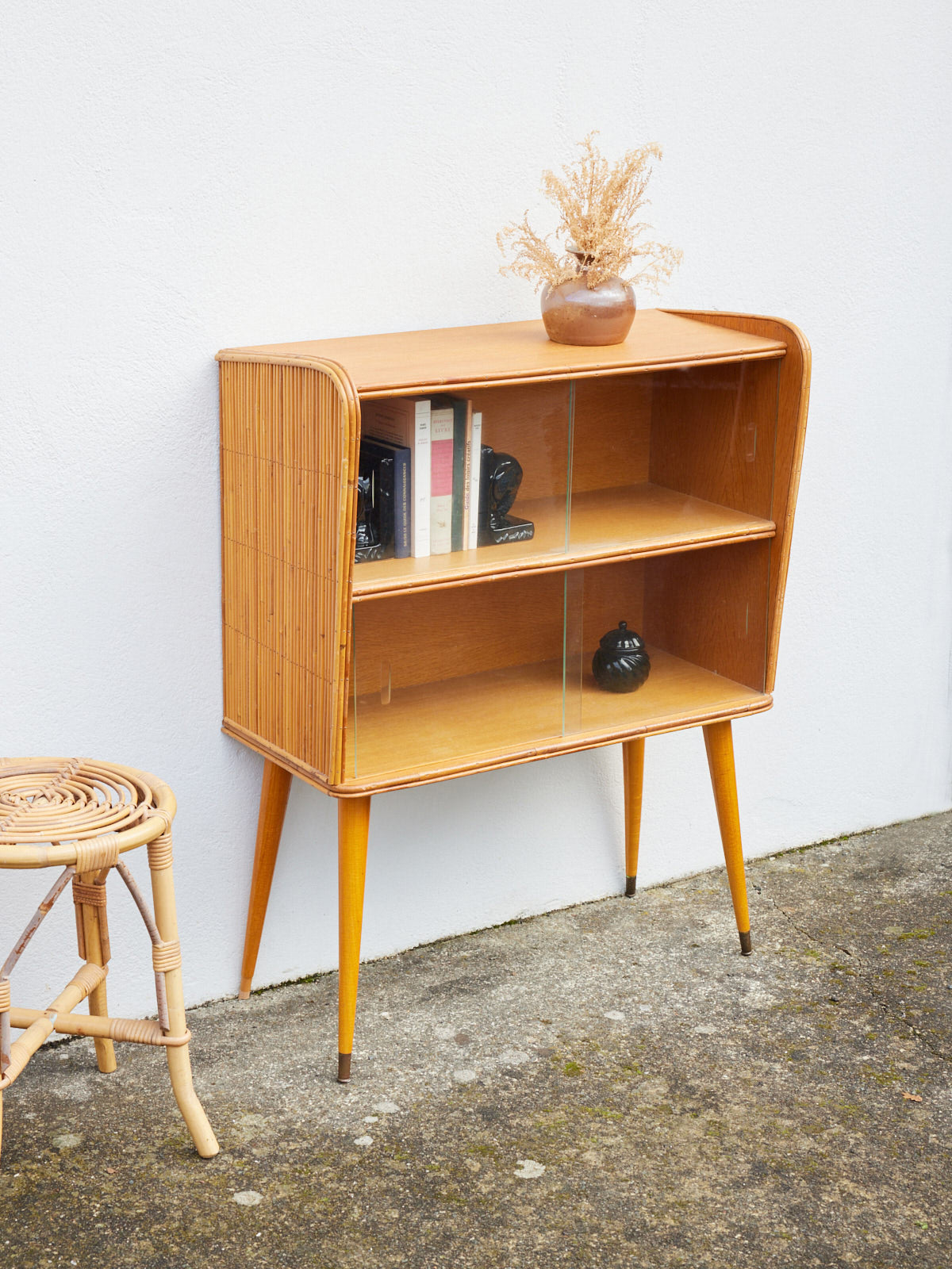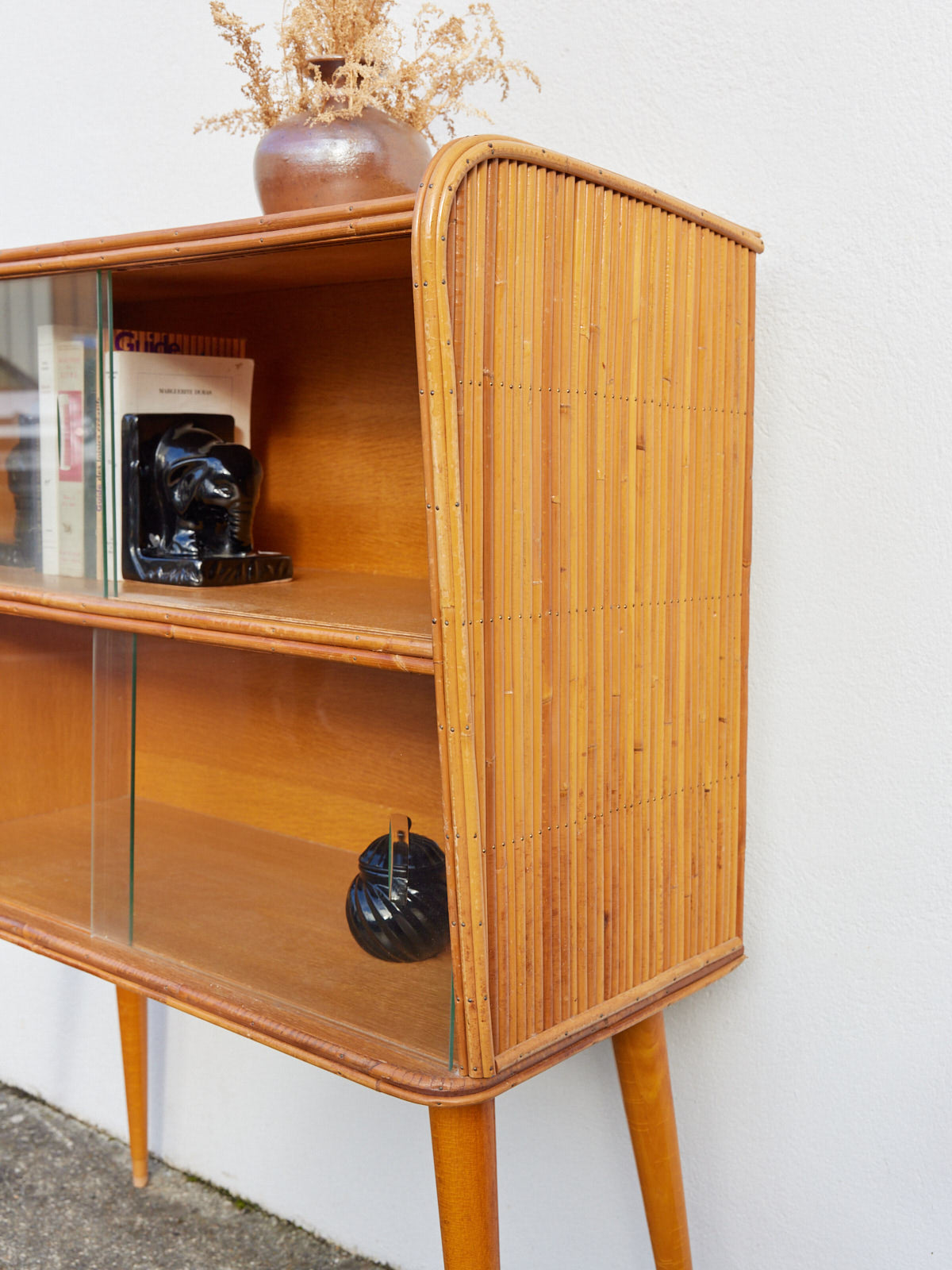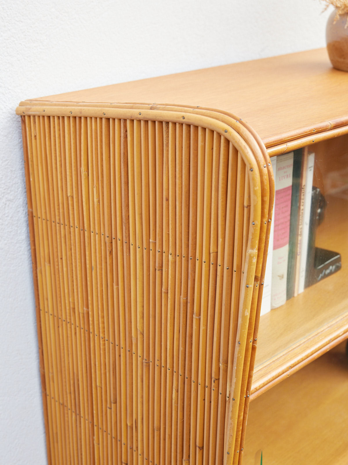 Invitez cette vitrine en rotin au design unique et élégant dans votre intérieur, où ses lignes aériennes et ses pieds compas apportent une touche rétro raffinée. Elle propose des étagères pensées pour exposer vaisselle, livres ou objets personnels tout en optimisant l'espace. Le rotin naturel crée une ambiance chaleureuse et légère, rehaussée par des finitions laiton au bout de ses pieds compas. Une finition manque sur le pied arrière gauche qui n'enlève rien à son charme ni à son utilité.