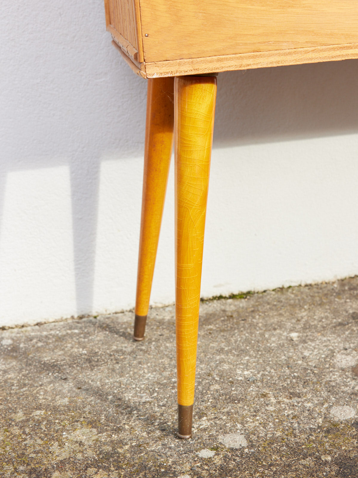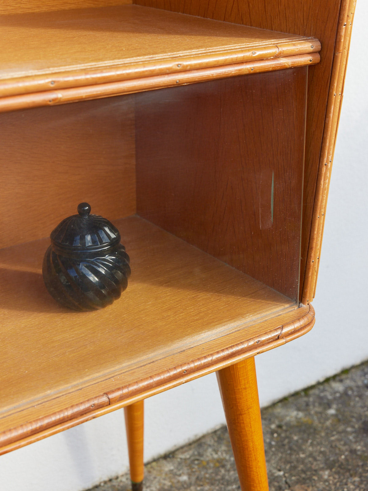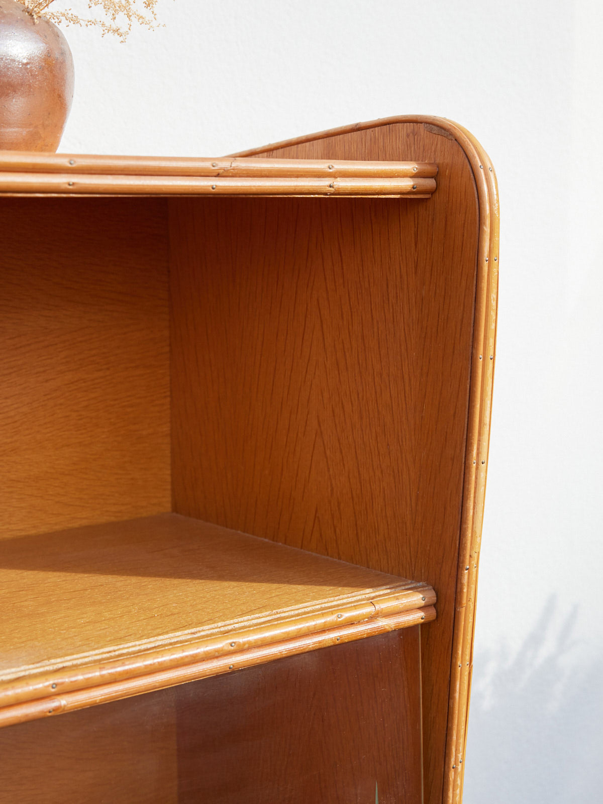 Invitez cette vitrine en rotin au design unique et élégant dans votre intérieur, où ses lignes aériennes et ses pieds compas apportent une touche rétro raffinée. Elle propose des étagères pensées pour exposer vaisselle, livres ou objets personnels tout en optimisant l'espace. Le rotin naturel crée une ambiance chaleureuse et légère, rehaussée par des finitions laiton au bout de ses pieds compas. Une finition manque sur le pied arrière gauche qui n'enlève rien à son charme ni à son utilité.