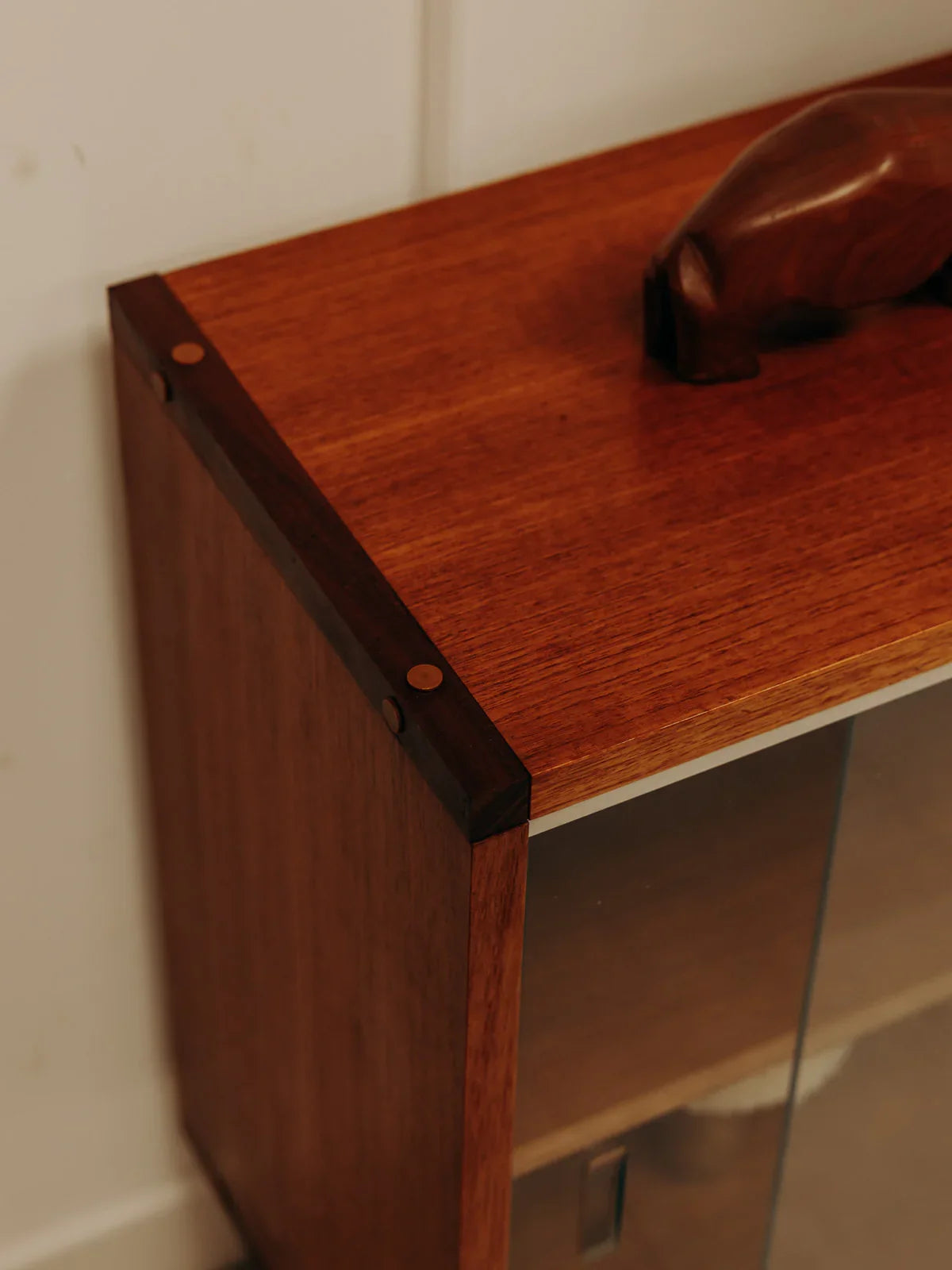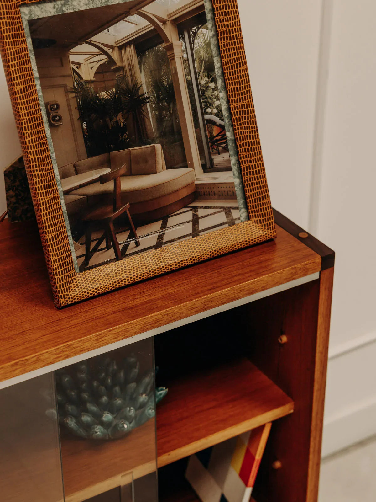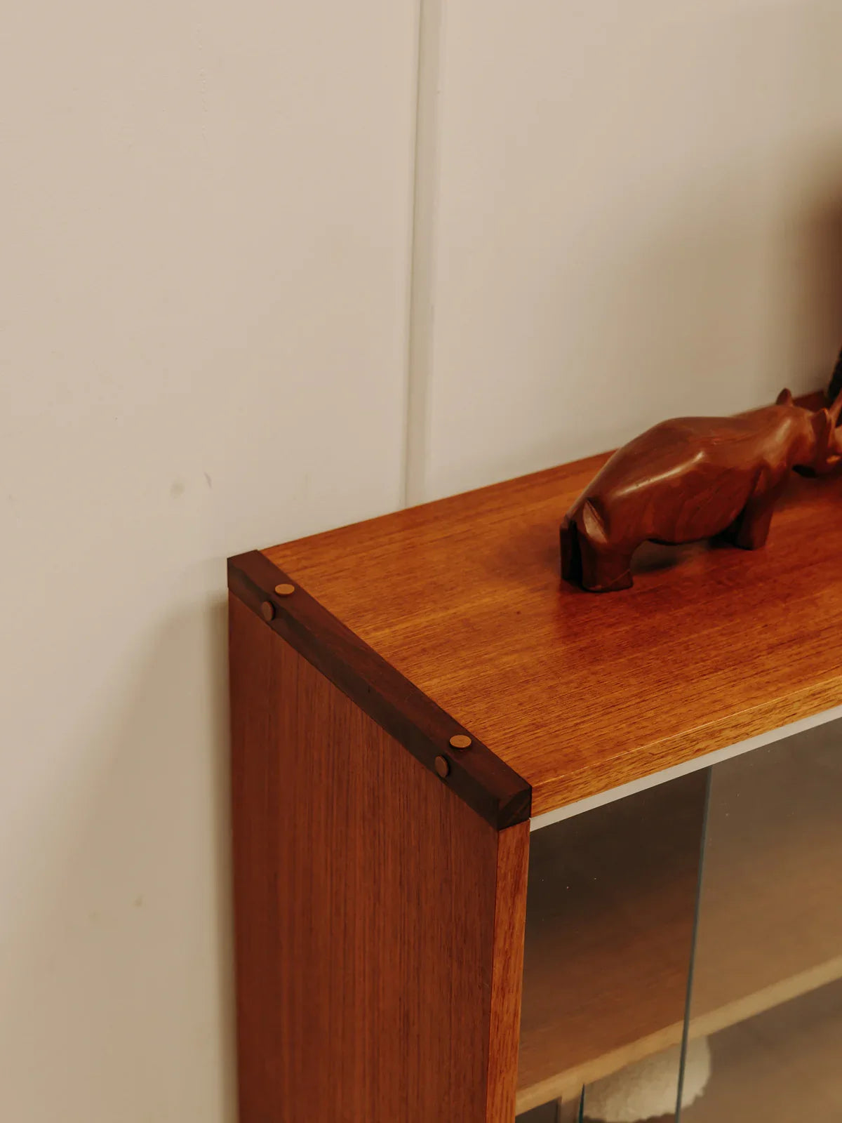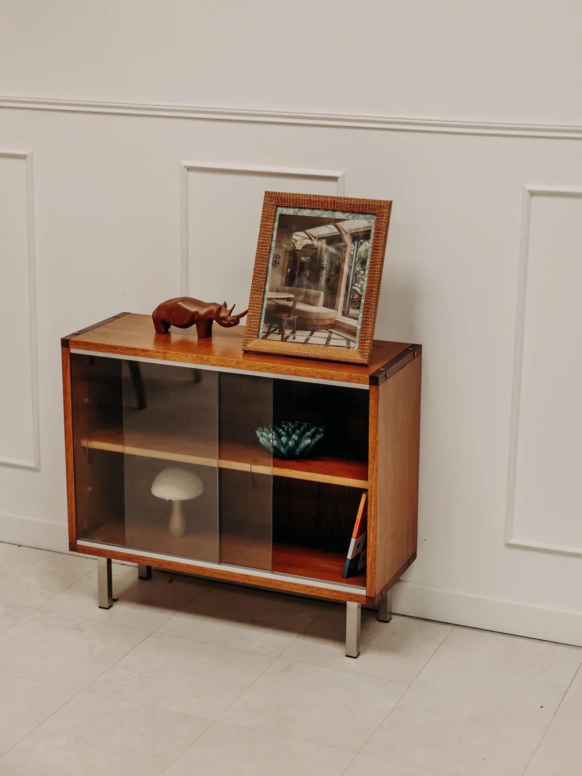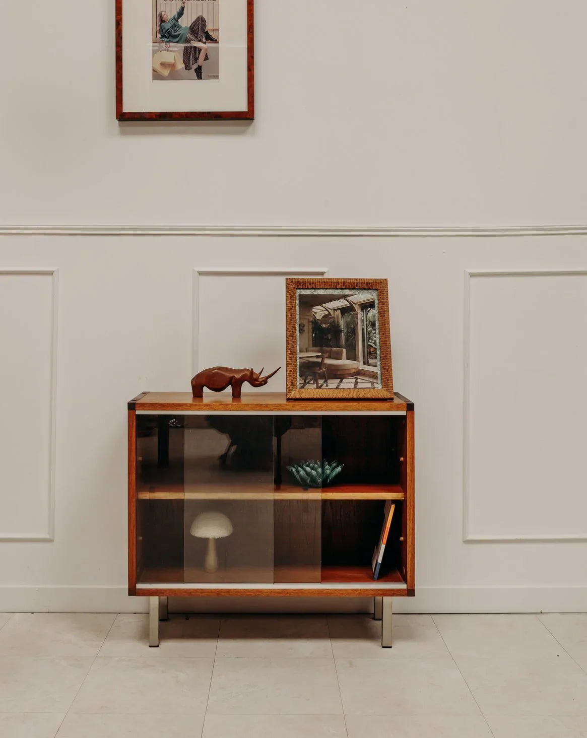 Offrez à votre intérieur une vitrine de caractère en bois clair aux arêtes foncées, reposant sur des pieds métalliques élancés. La façade vitrée dévoile une niche claire et des étagères proportionnées, pensées pour exposer vaisselle, livres et objets déco avec élégance. Sa silhouette compacte et ses matières contrastées apportent une ambiance contemporaine et chaleureuse, idéale pour structurer un coin salon, une entrée ou un bureau en offrant rangement discret et style raffiné.