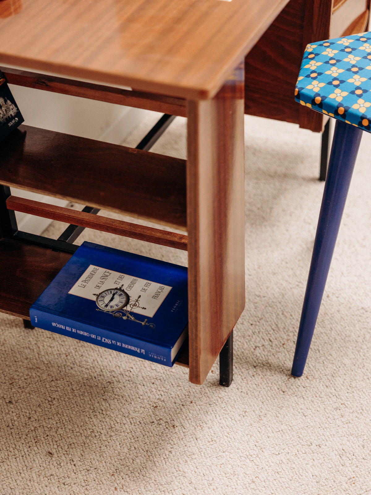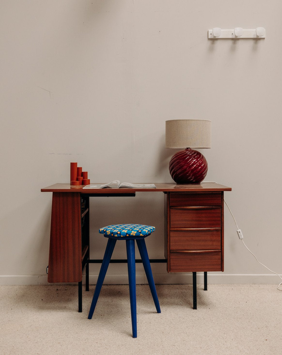 Bureau en bois foncé aux lignes épurées, pensé pour composer un coin de travail chaleureux et sobre. Trois tiroirs organisent papiers et accessoires, tandis qu’un compartiment latéral à deux étagères accueille livres ou objets décoratifs. Les pieds fins en métal offrent une élévation légère et une note contemporaine qui allège la silhouette du meuble. Format compact, il propose une surface de travail pratique sans envahir l'espace.