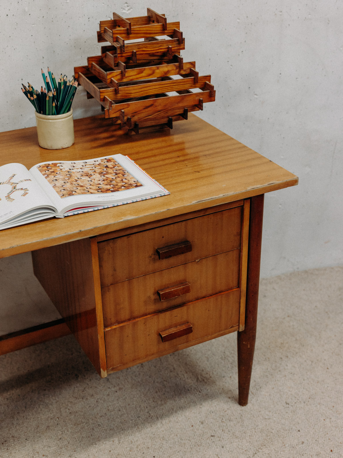 Adoptez ce bureau scandinave en bois clair, aux lignes aériennes et au design épuré. Trois tiroirs dotés de longues poignées en bois offrent un rangement discret et fonctionnel, tandis que les pieds fuseaux affinent sa silhouette et lui confèrent une belle légèreté visuelle, idéale pour un coin travail ou un salon. La finition naturelle du bois instaure une ambiance chaleureuse et sobre, propice à la concentration et à la créativité. Traces du temps présentes et visibles sur les photos.