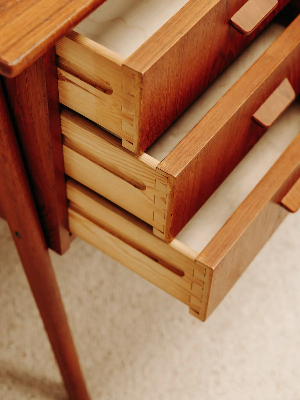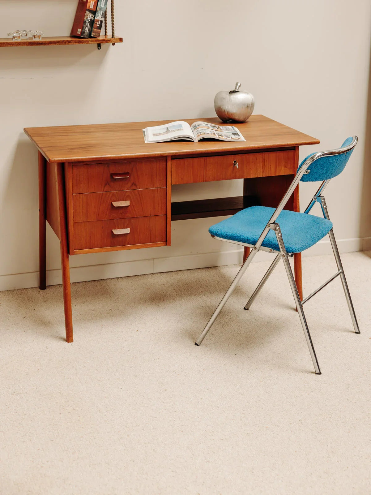 Adoptez ce bureau scandinave en teck aux lignes épurées et pieds compas, qui instille une élégance naturelle dans tout intérieur. Son grand plateau et son agencement pratique — trois tiroirs côté gauche et un long tiroir à droite — offrent un rangement organisé pour dossiers, fournitures et ordinateur, adapté à un usage quotidien ou au télétravail. La teinte chaude du teck et la finesse des proportions créent une atmosphère chaleureuse et inspirante, parfaite pour un coin bureau au caractère rétro-moderne.
